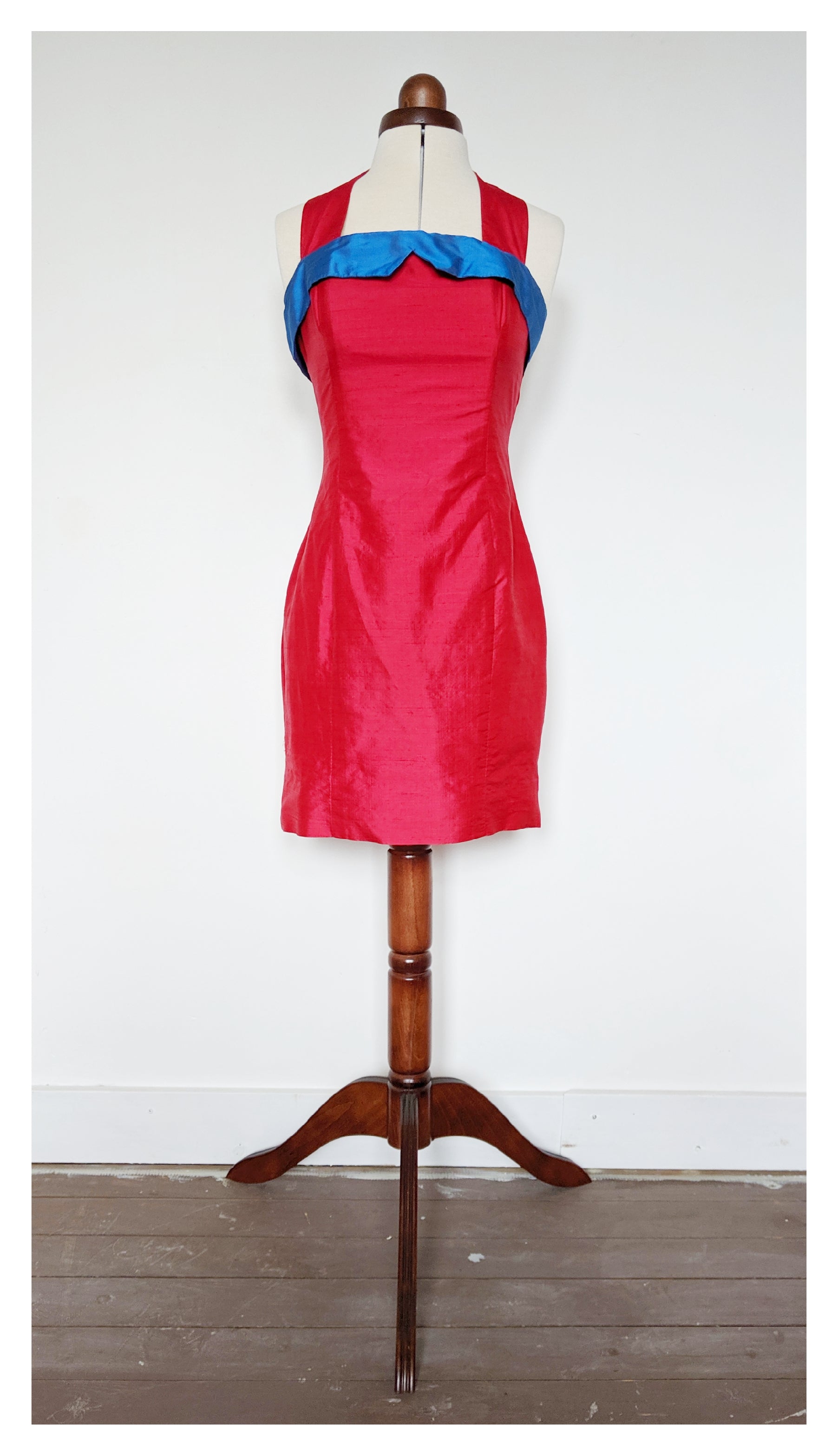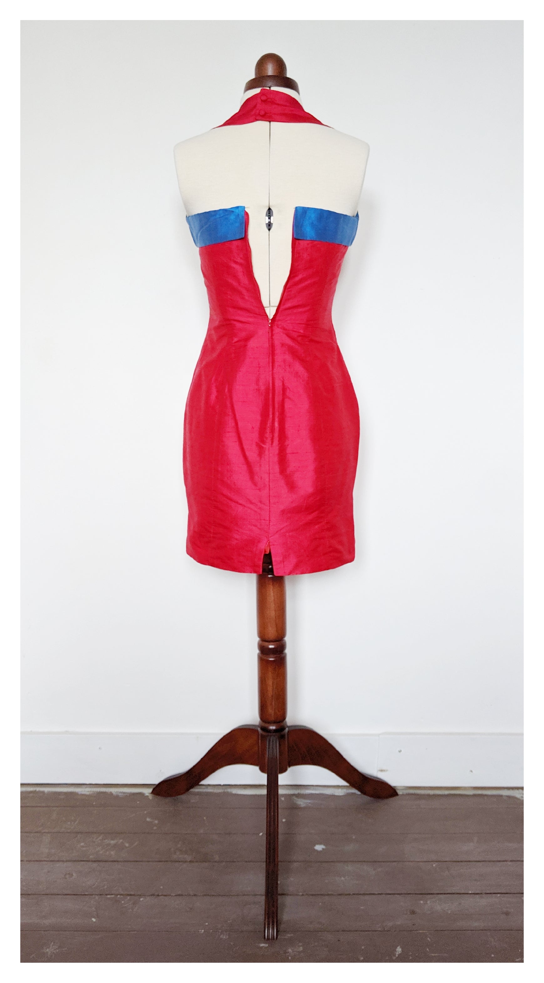 Jolie robe bustier au dos nu, avec une brette autour de la nuque. Deux boutons dans le même tissu. Décolleté droit. Totalement doublée. Deux baleines semi-dur au niveau du corsage devant, ainsi que deux derrière. Légèrement fendue à l'arrière.