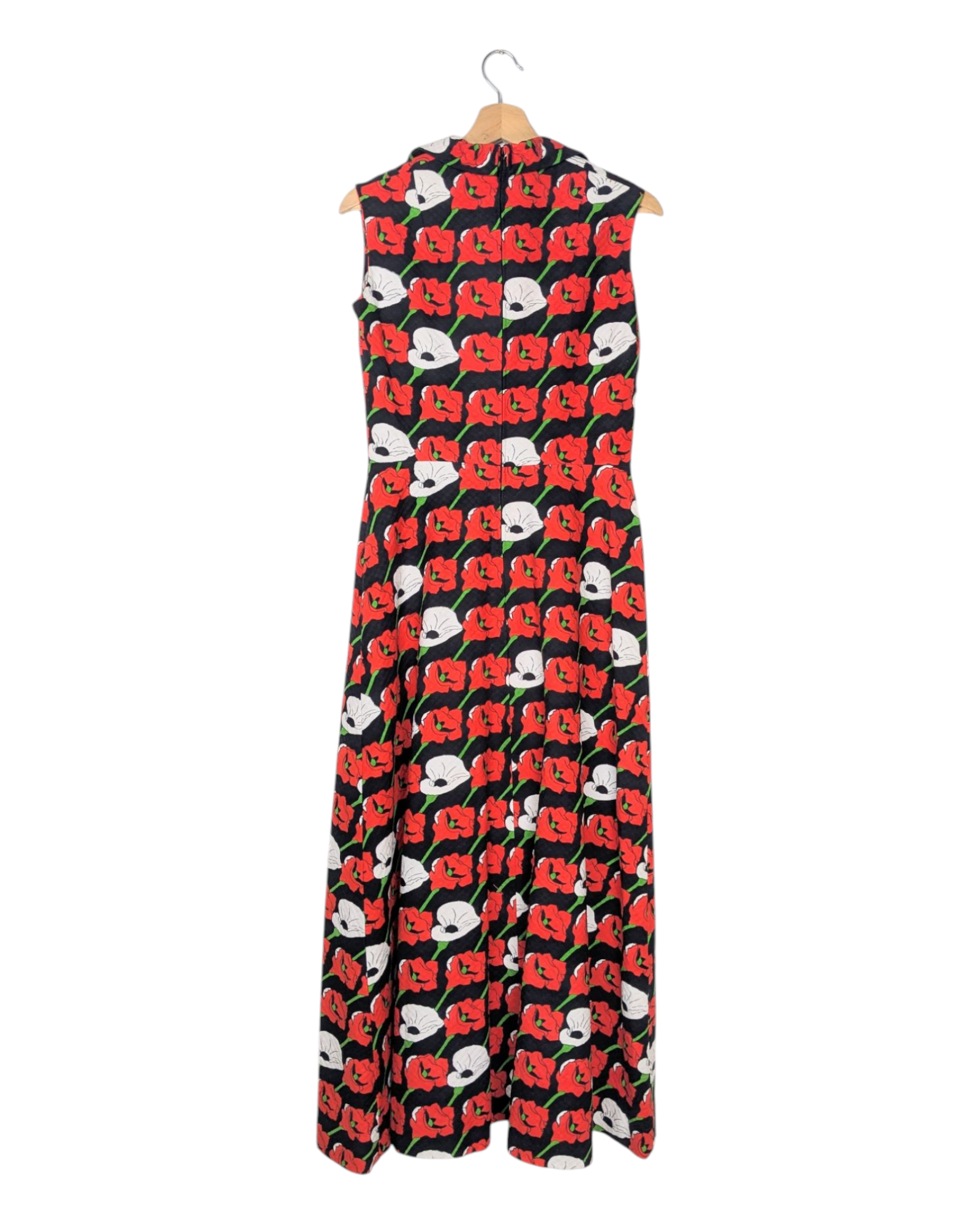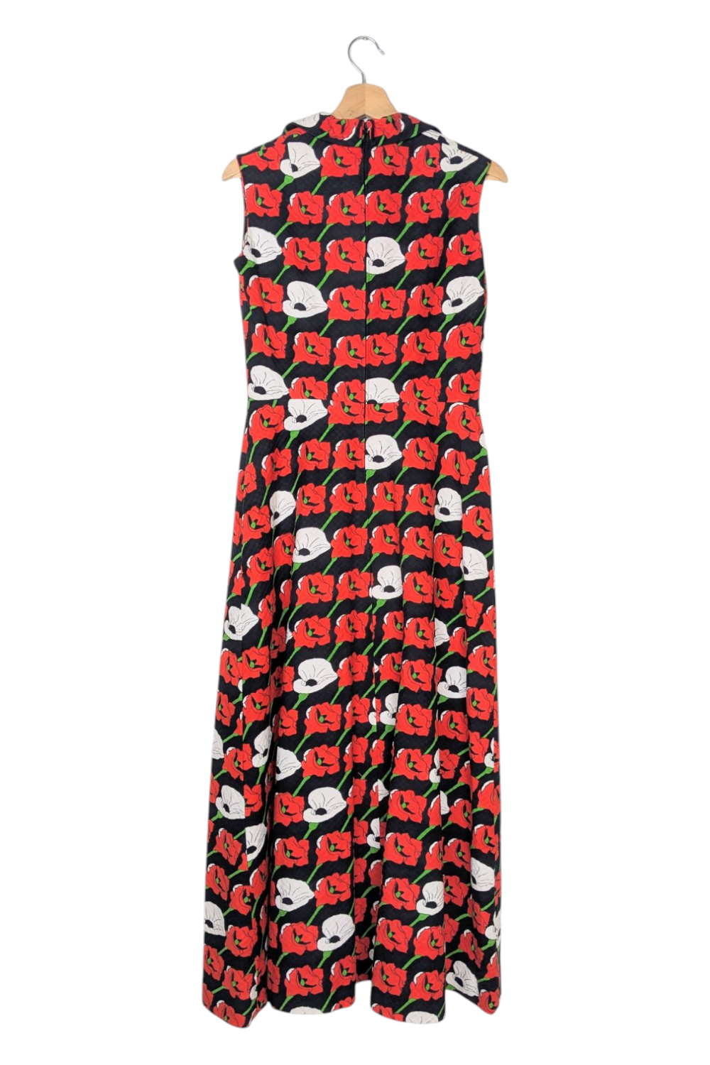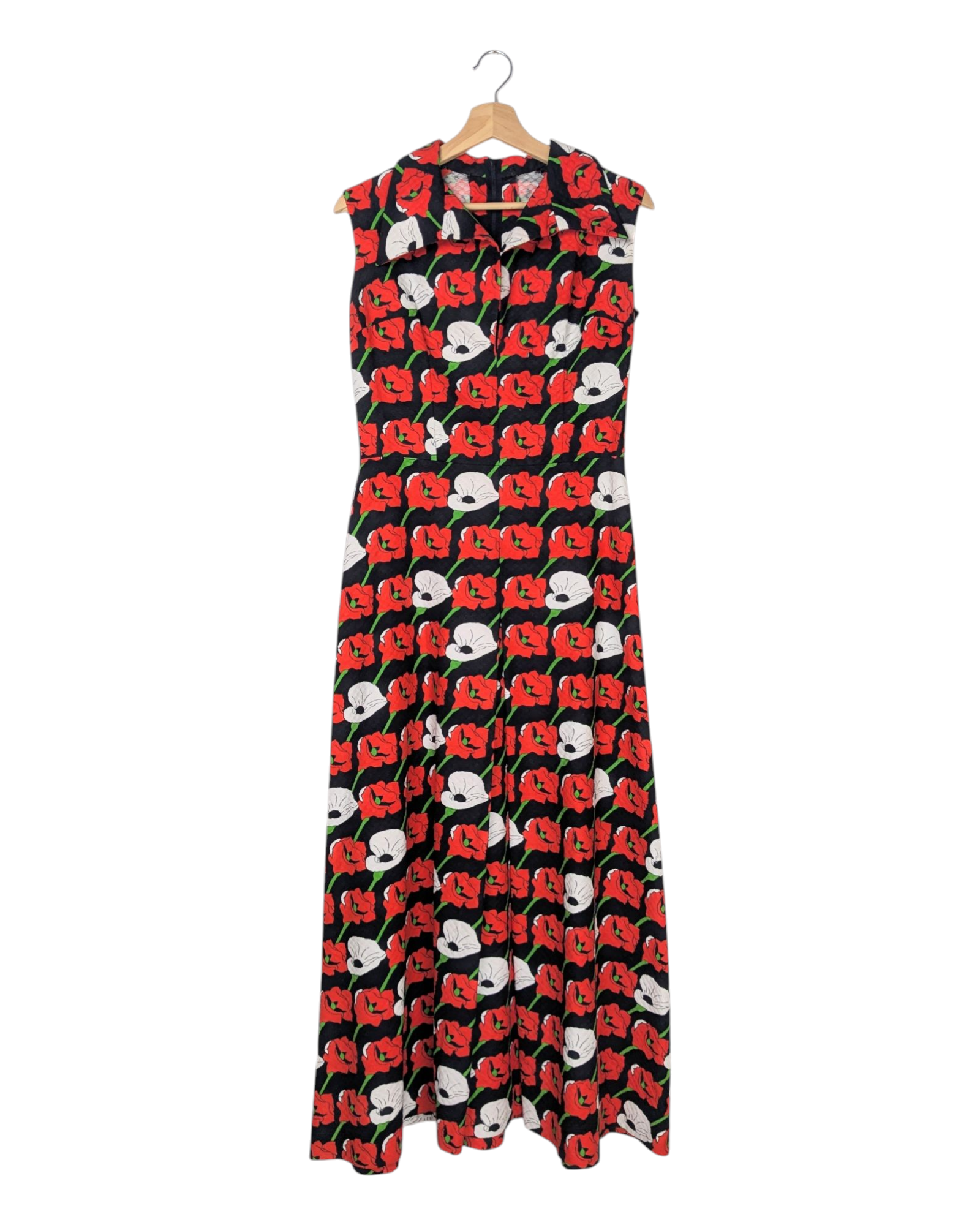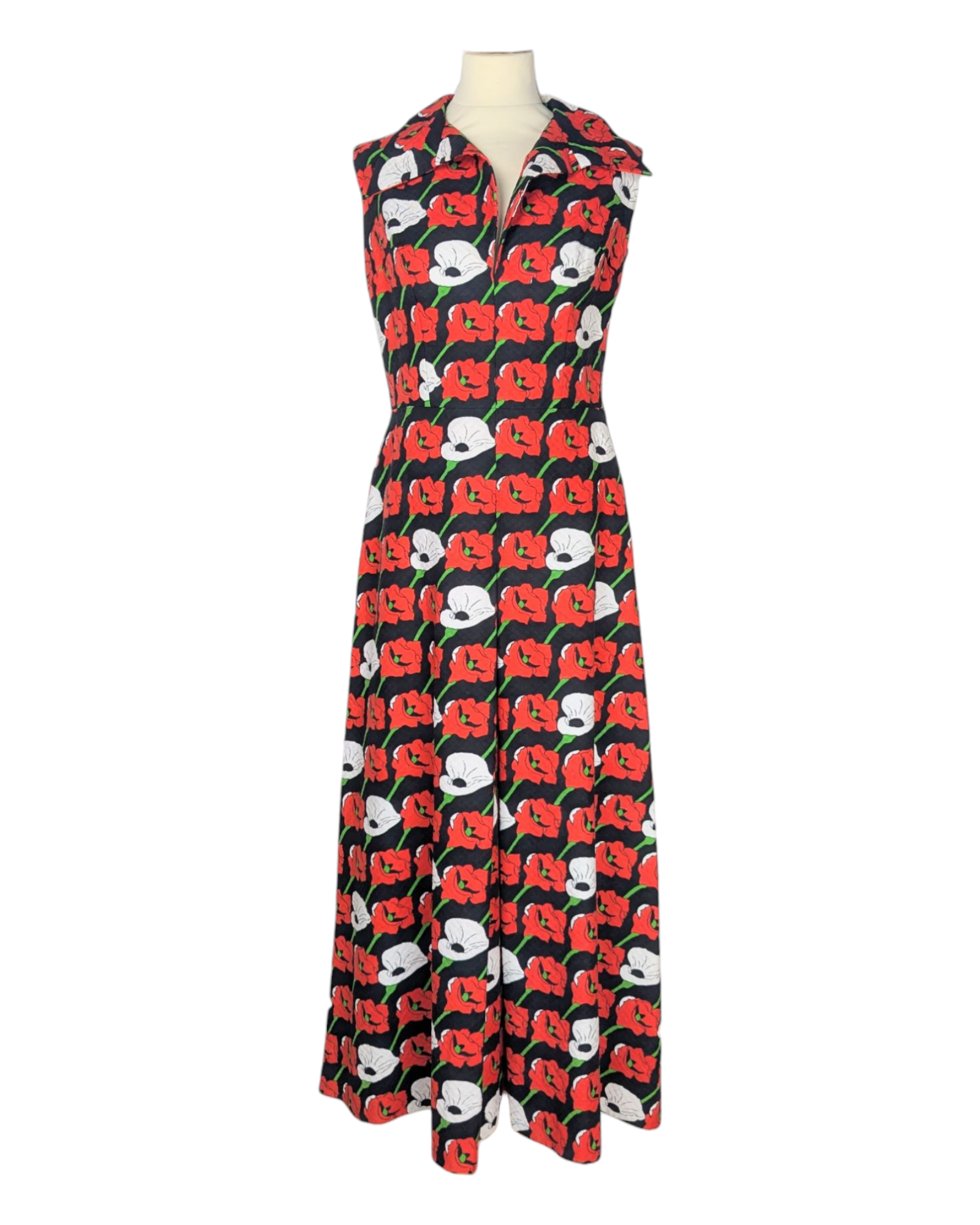 Juste ouaw. Superbe robe longue de la fin des années 60, dénut des années 70, cousue à la main dans un tissu aux motifs de Calla et Coquelicot magnifique. Epais et gauffré, ce qui donne un superbe maintient à cette robe.