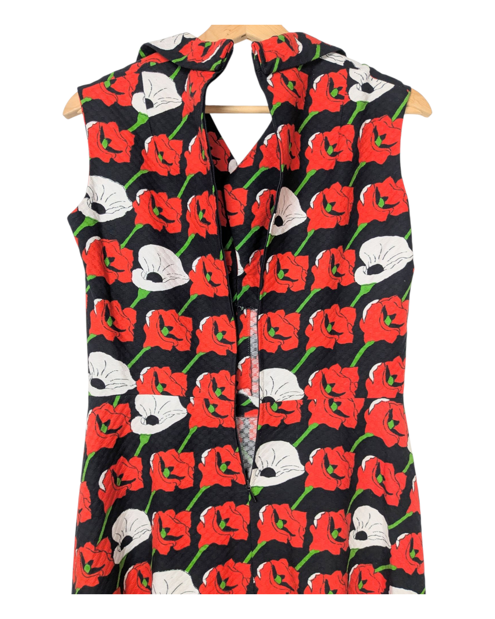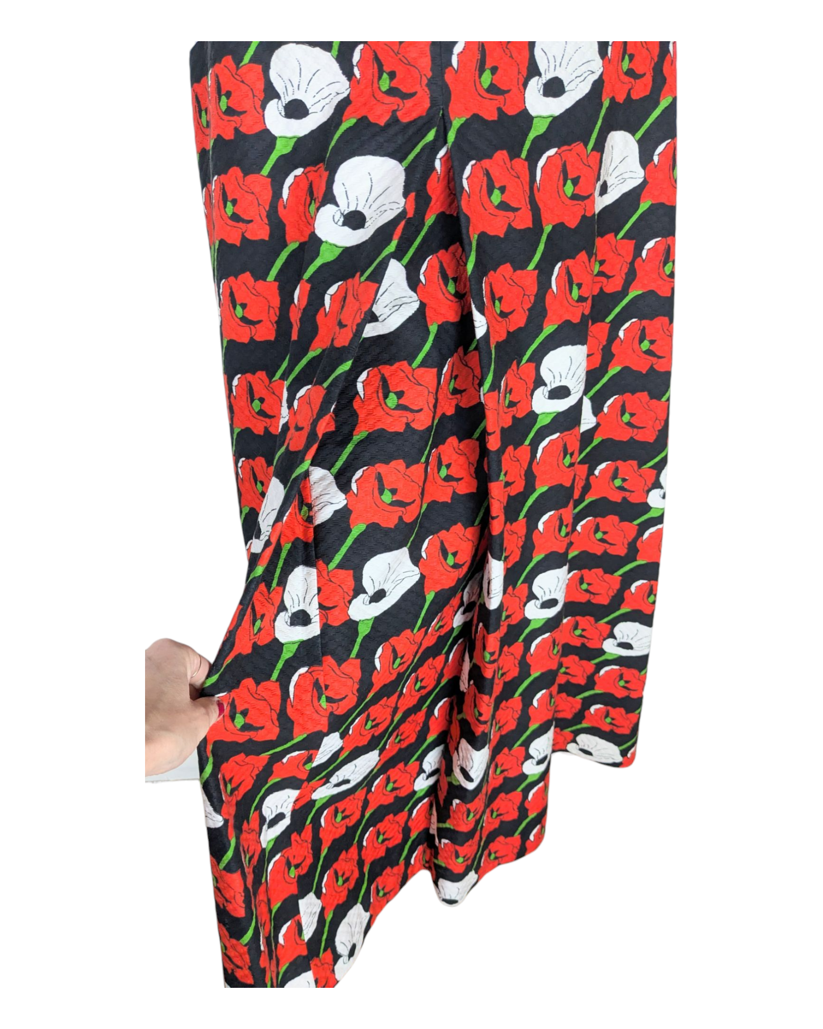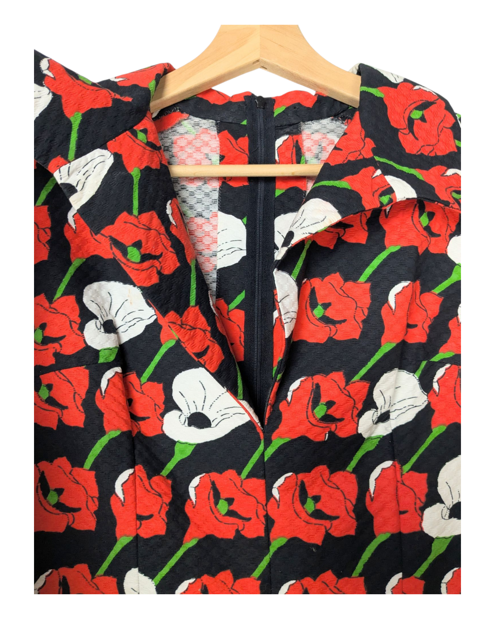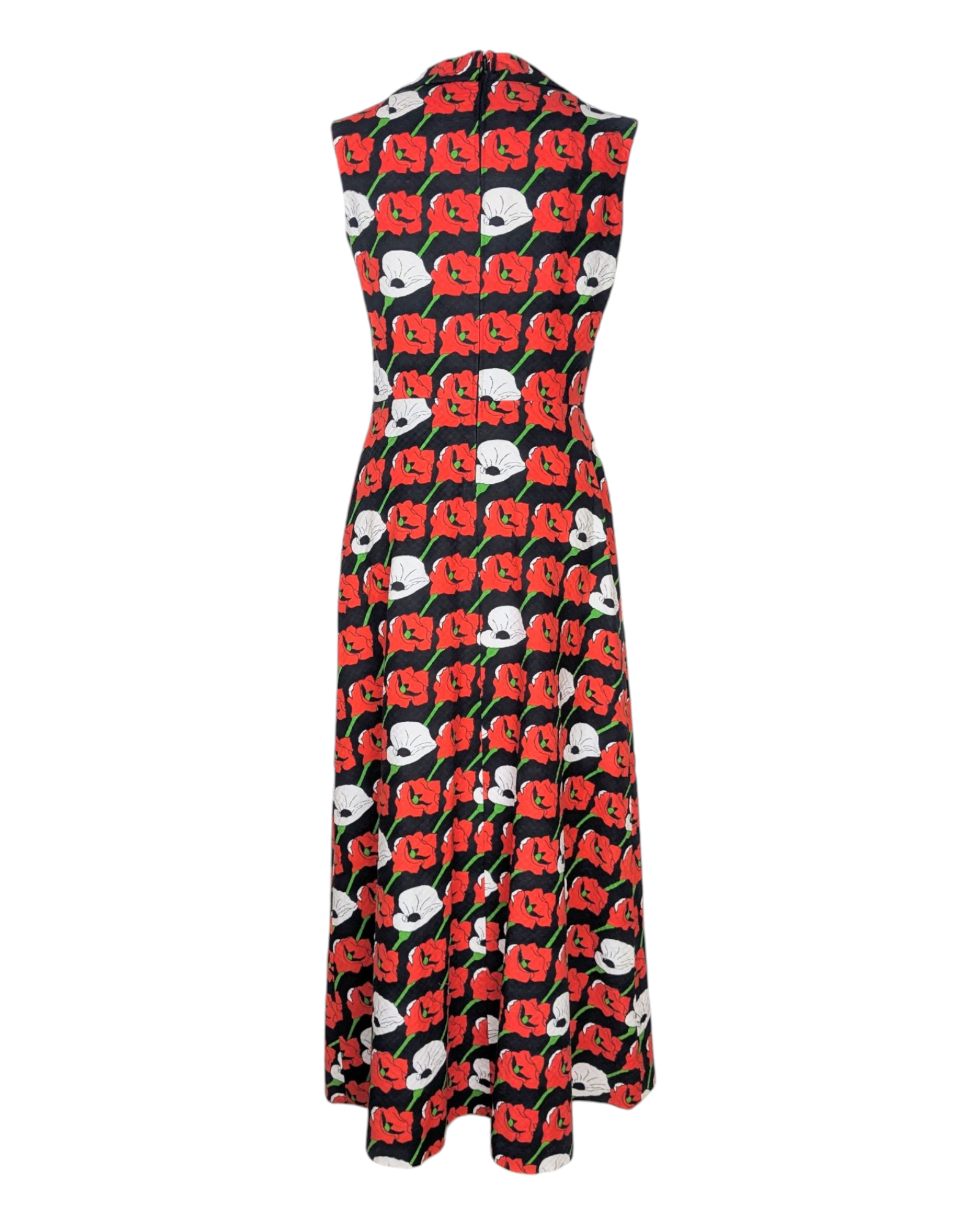 Juste ouaw. Superbe robe longue de la fin des années 60, dénut des années 70, cousue à la main dans un tissu aux motifs de Calla et Coquelicot magnifique. Epais et gauffré, ce qui donne un superbe maintient à cette robe.