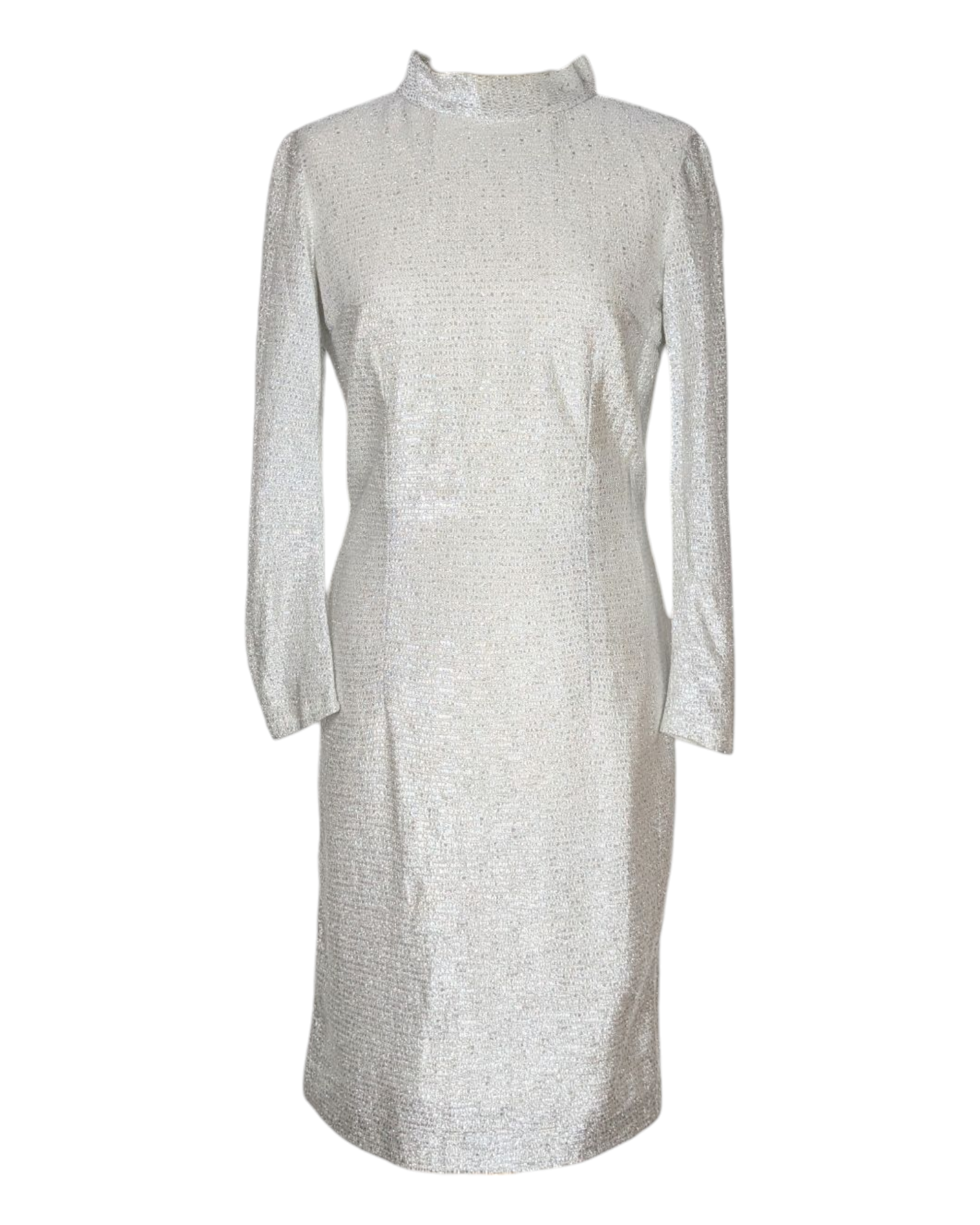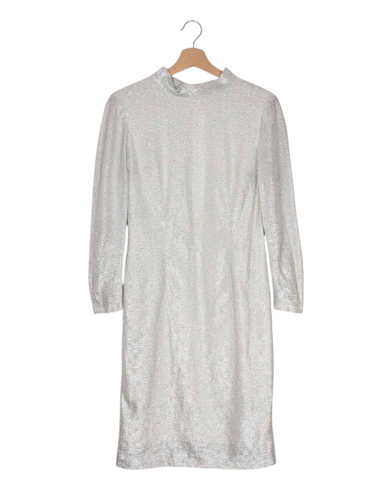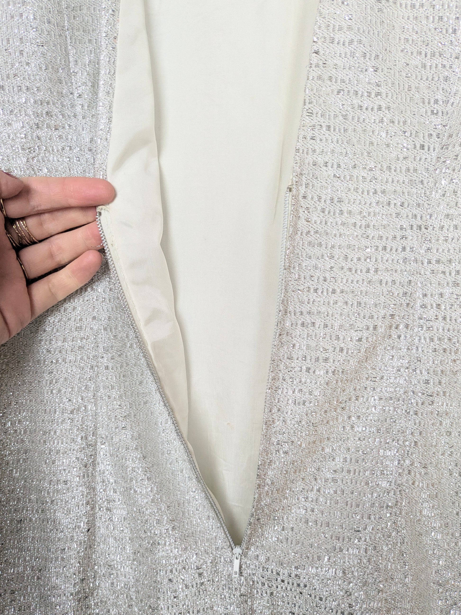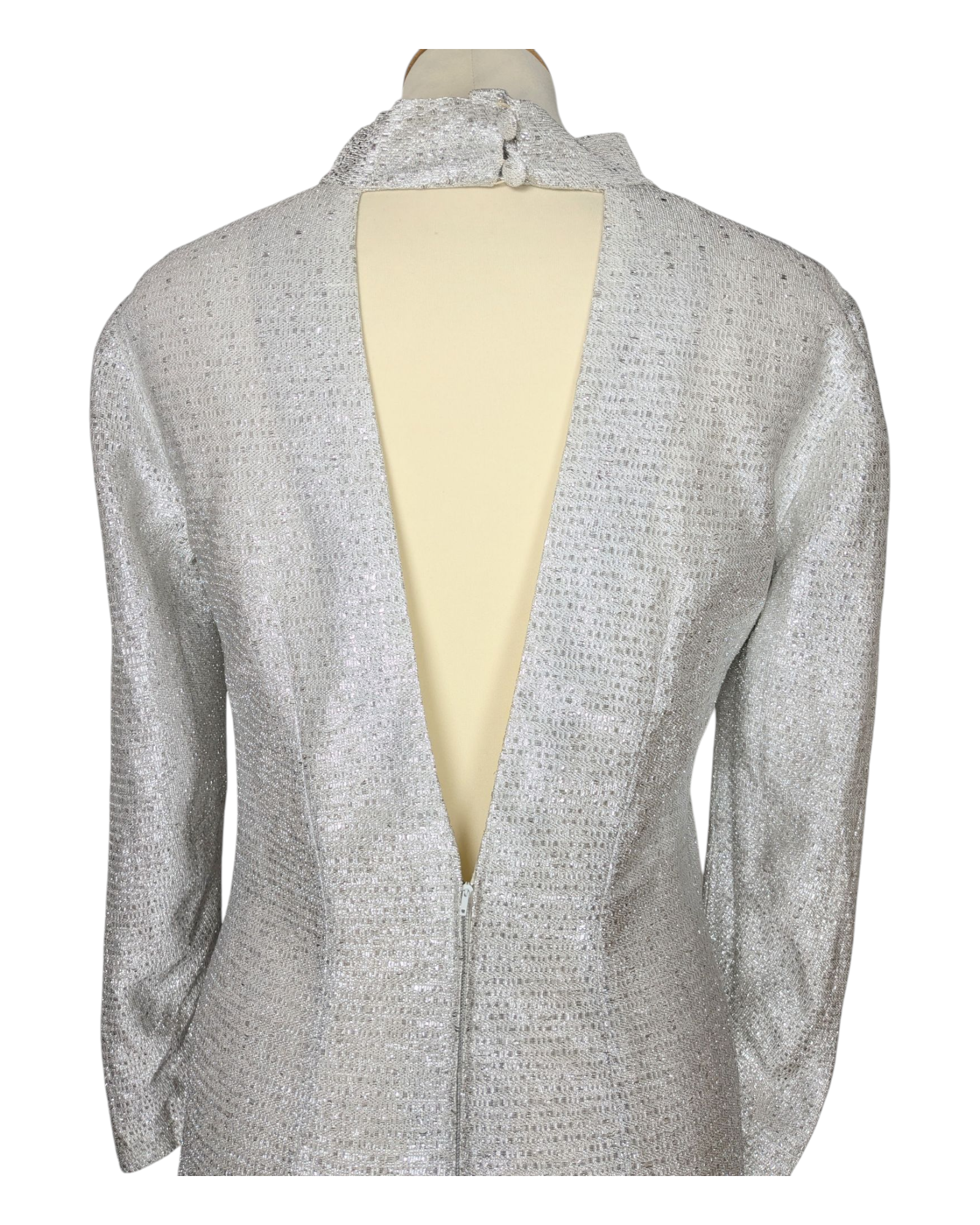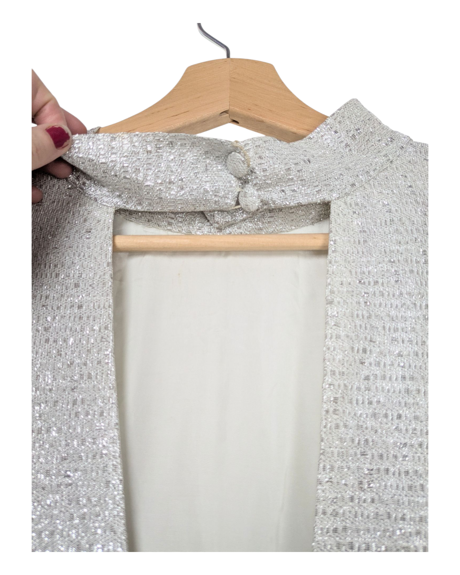 Le coup de coeur assuré. Magnifique robe en lurex argenté souple et fluide, doublée. Superbe décolleté dans le dos. Magnifique exemple typique des années 60.