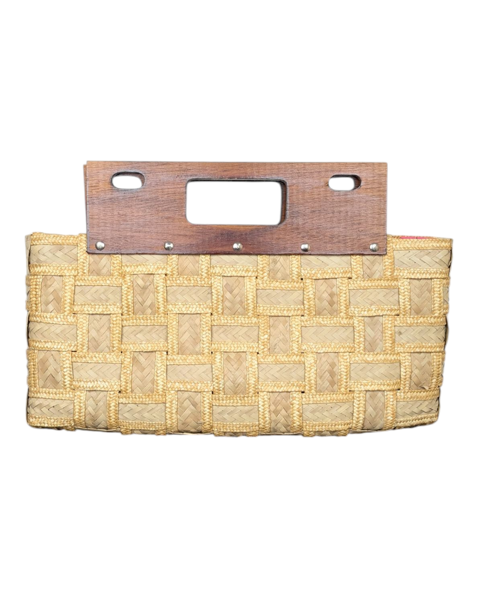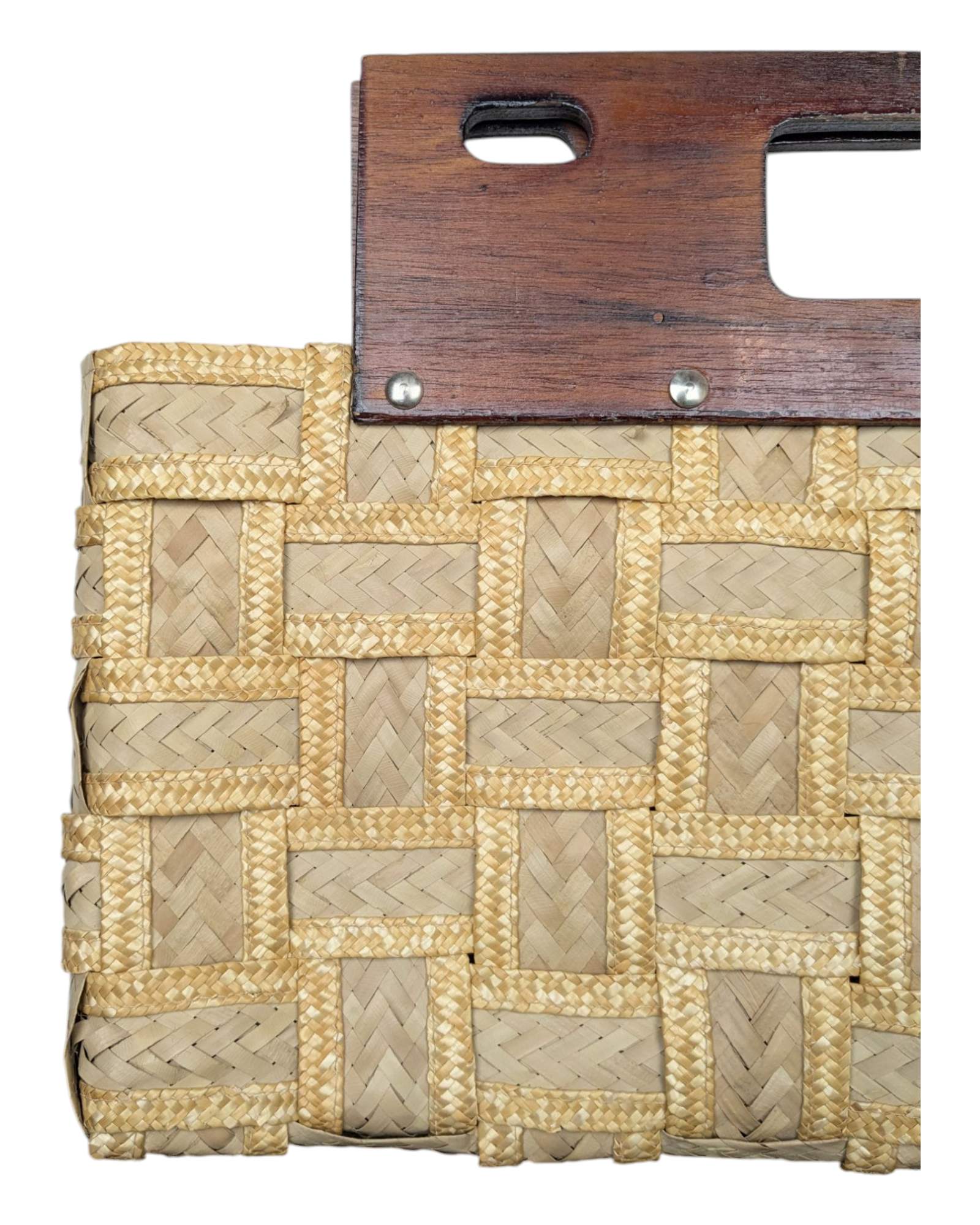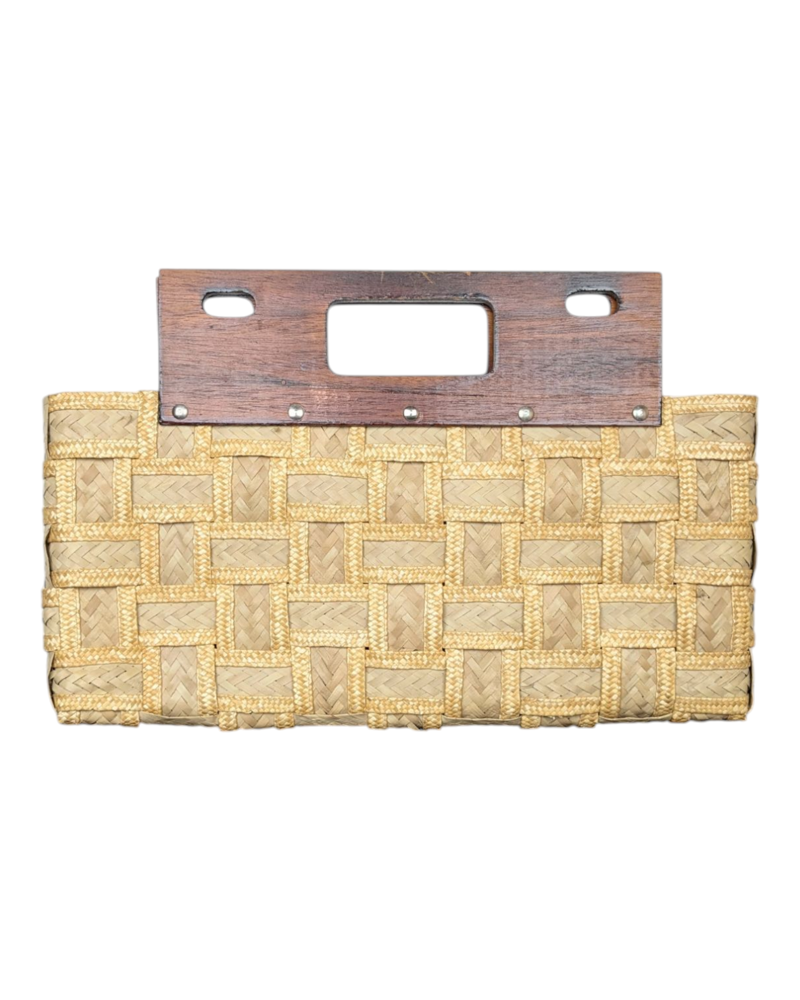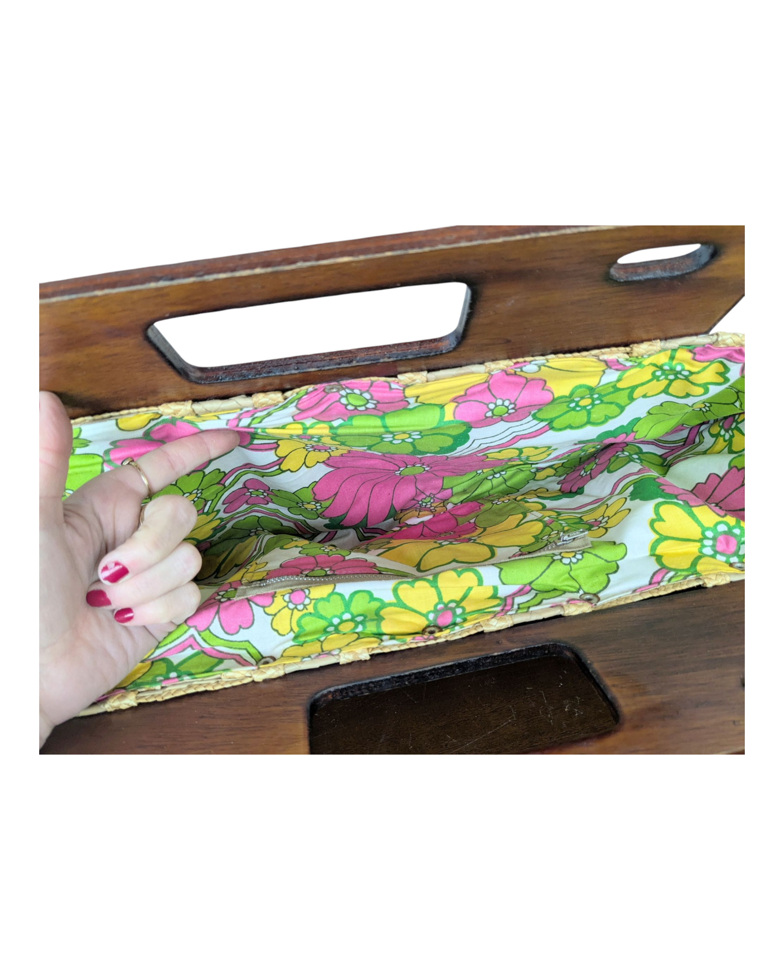 Superbe grand sac rectangle en osier tressé et poignées en bois flower power Vintage authentique Années 70s