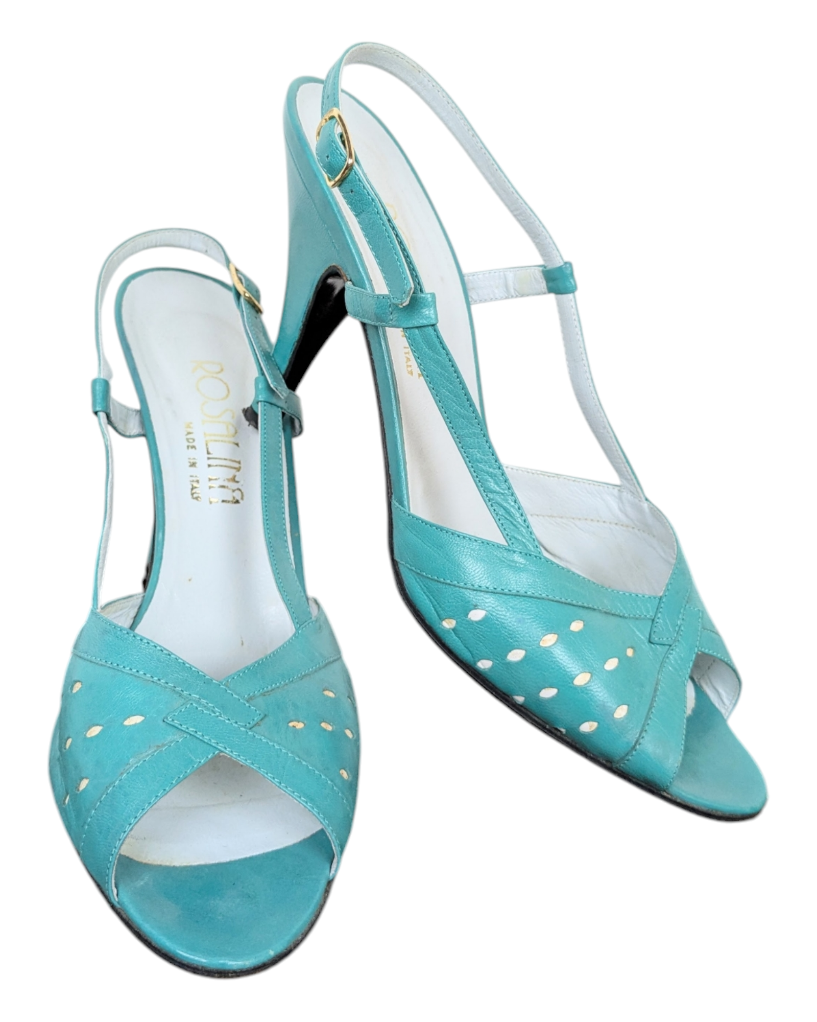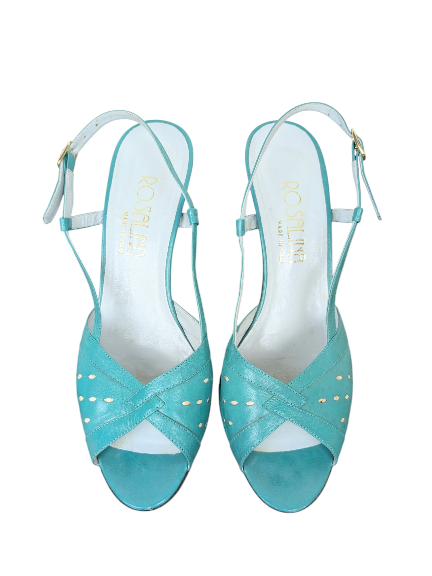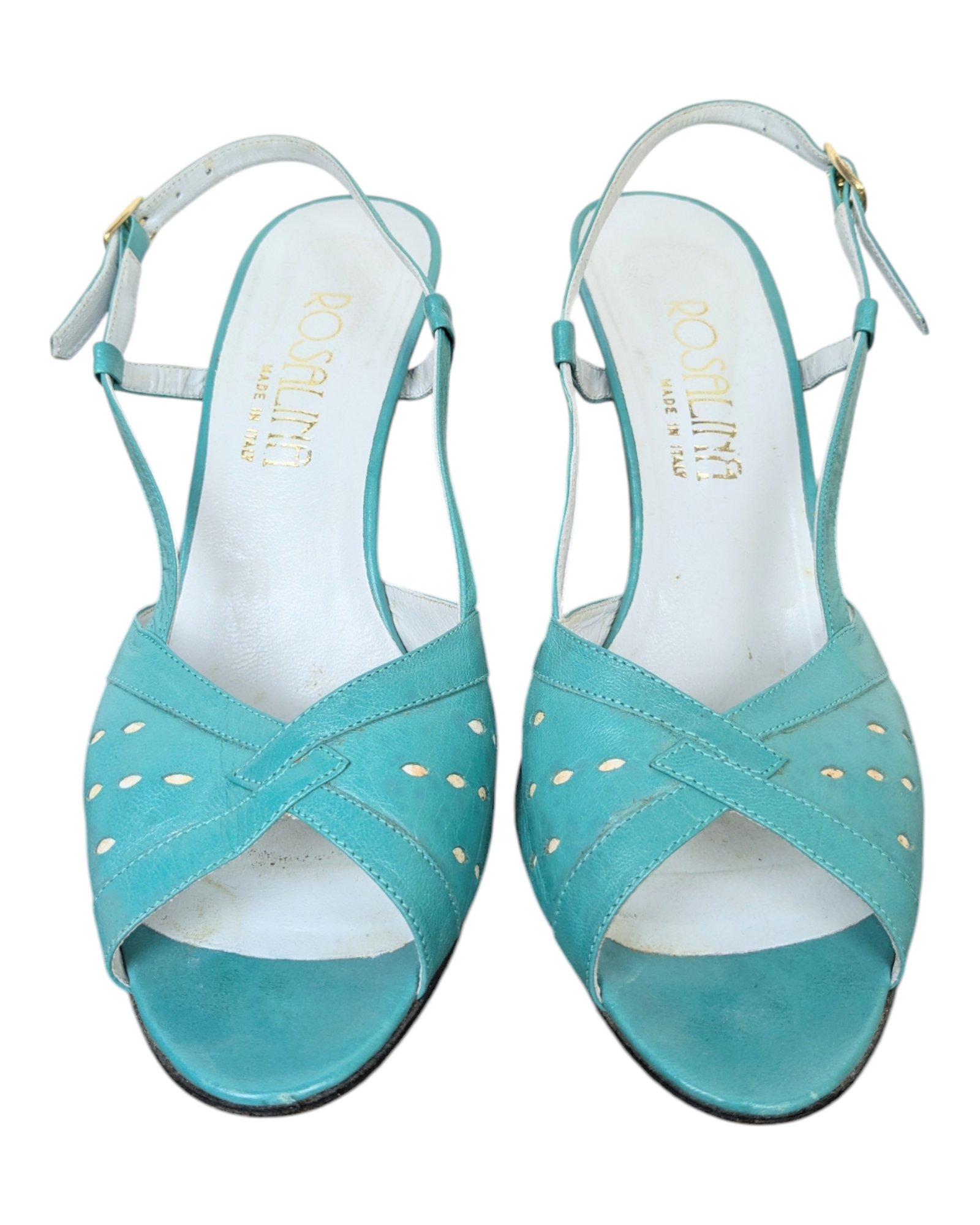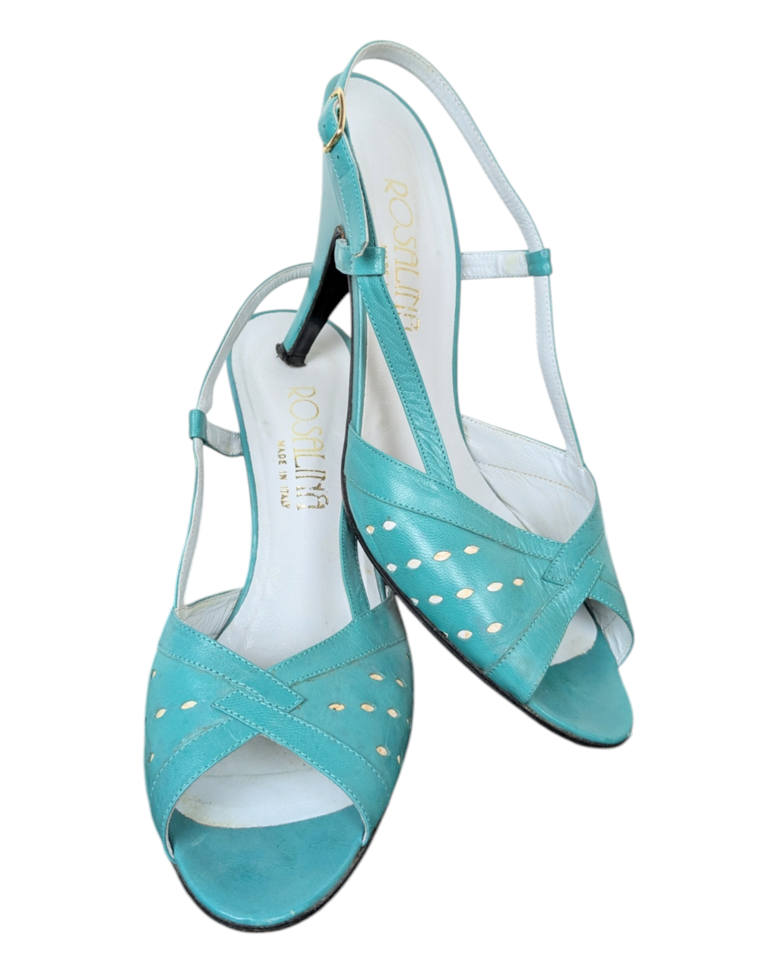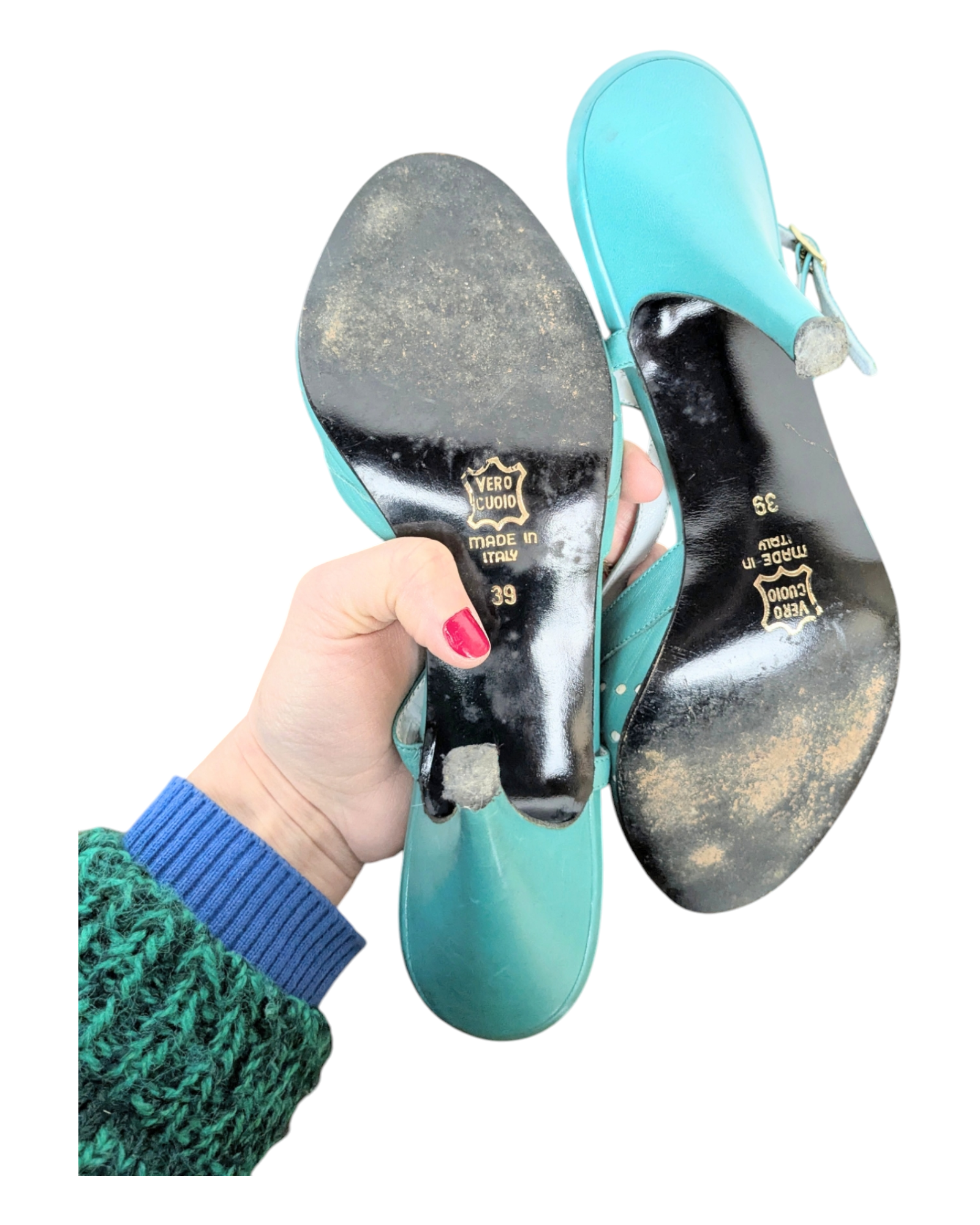 Jolis escarpins sandales vertes turquoises talons aiguilles Vintage authentique Années 80s Marque indiquée : Rosalina Matière indiquée : Cuir. Fabrication : Italie Taille indiquée : 39. Talons : 10 cm.