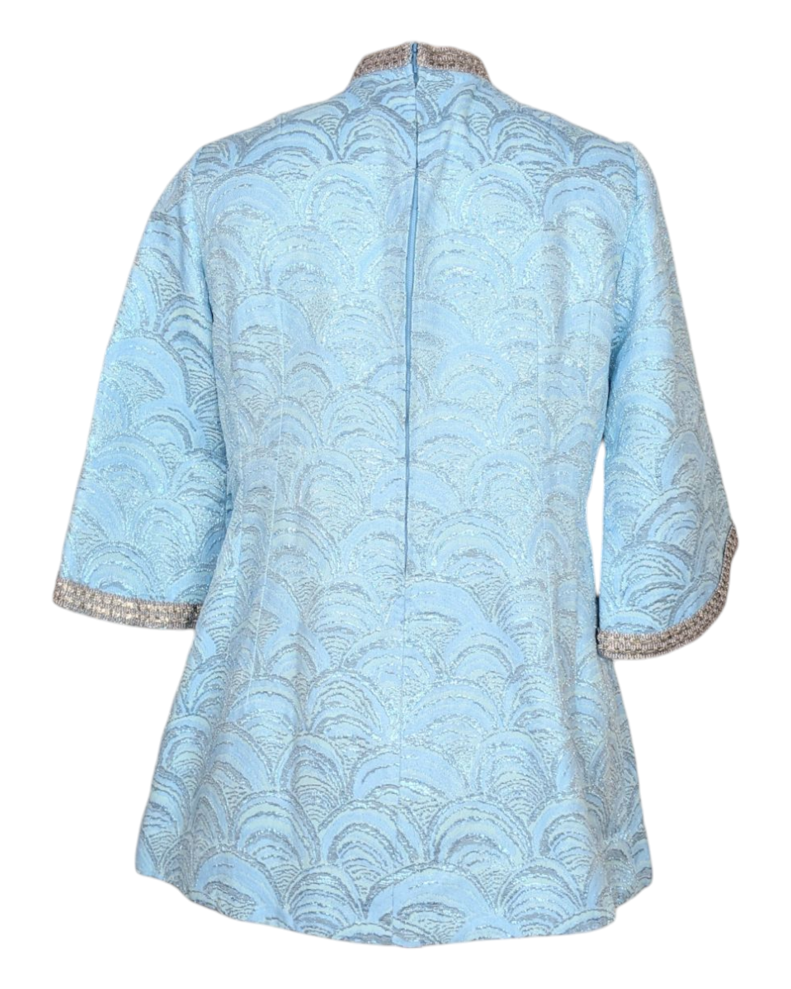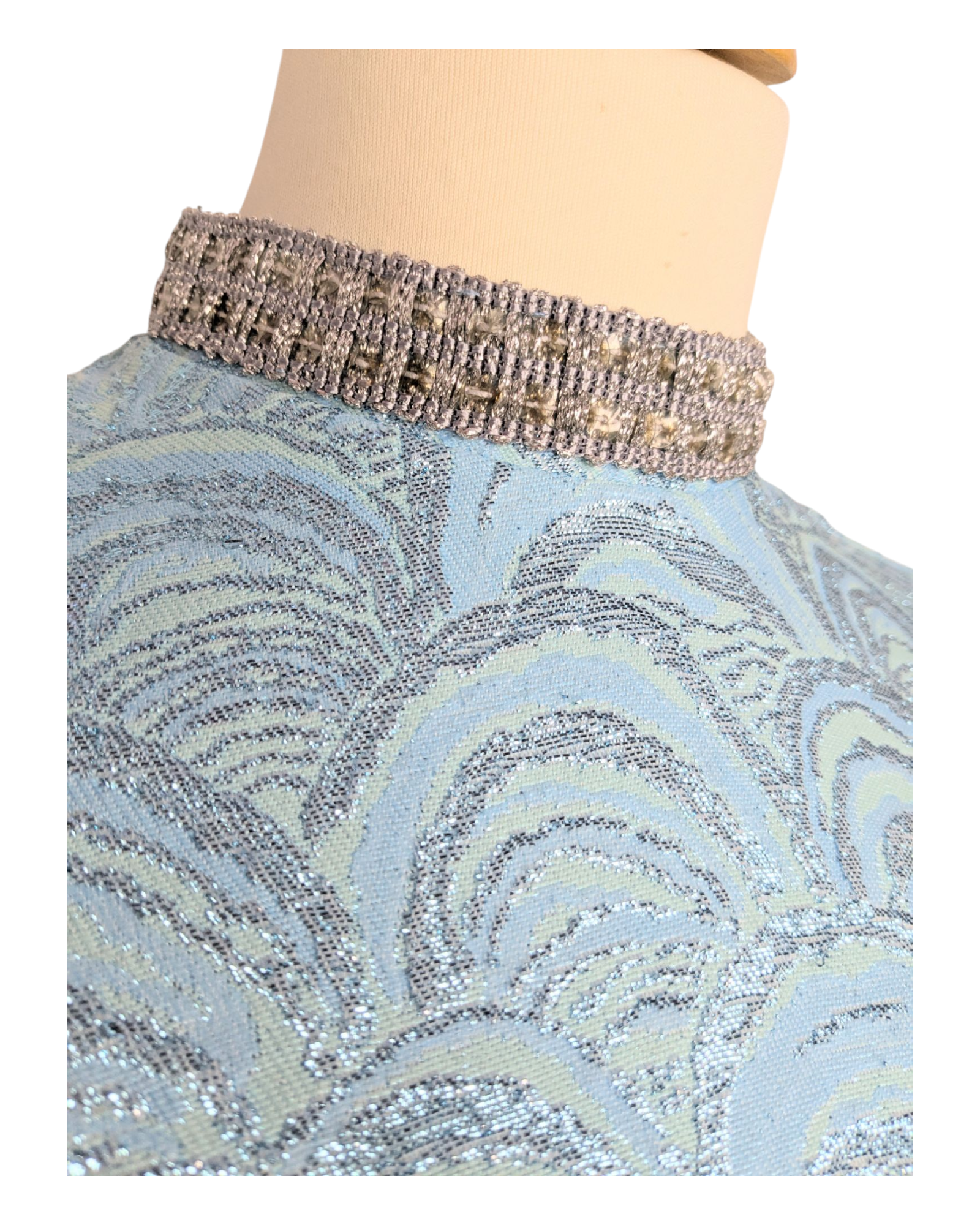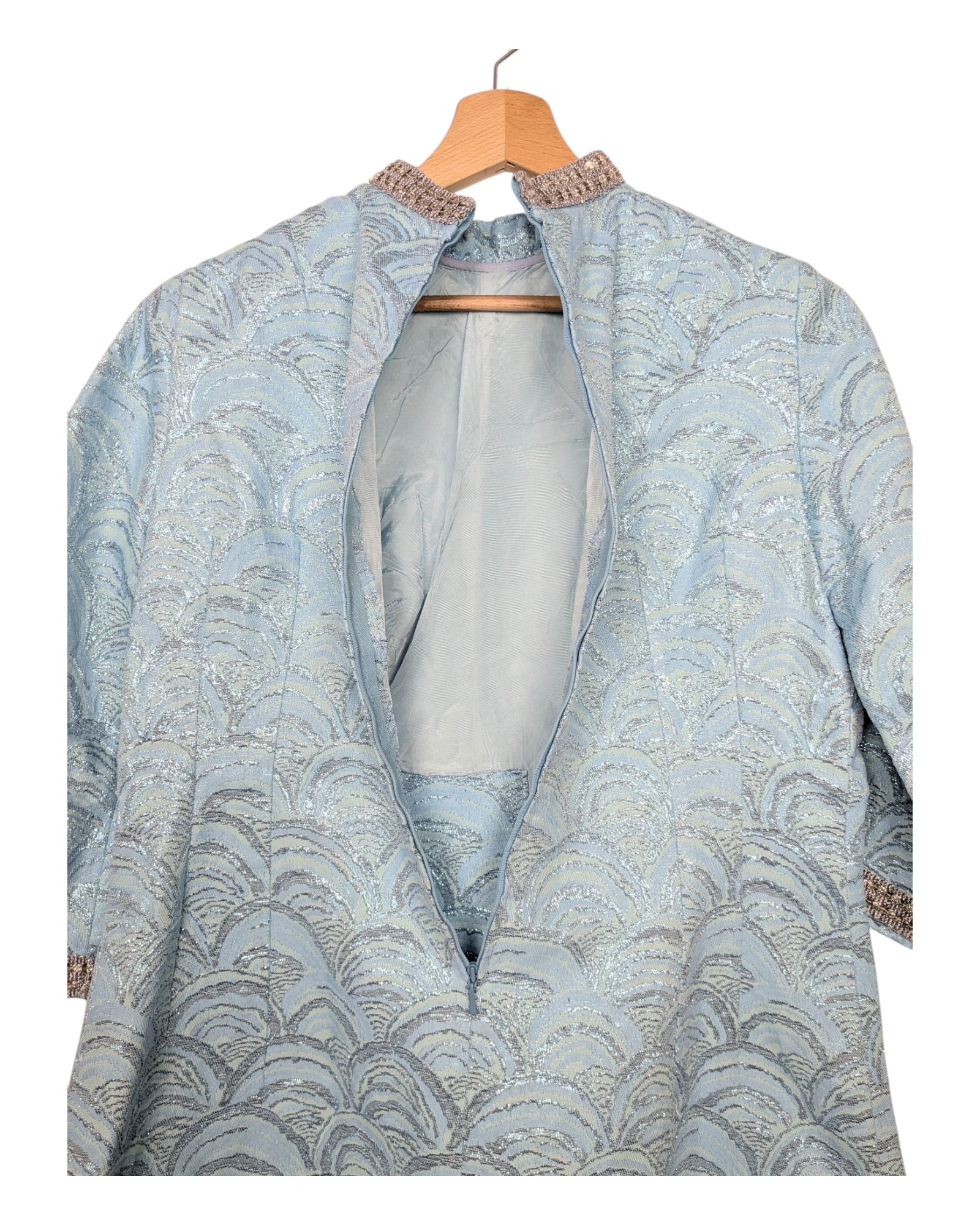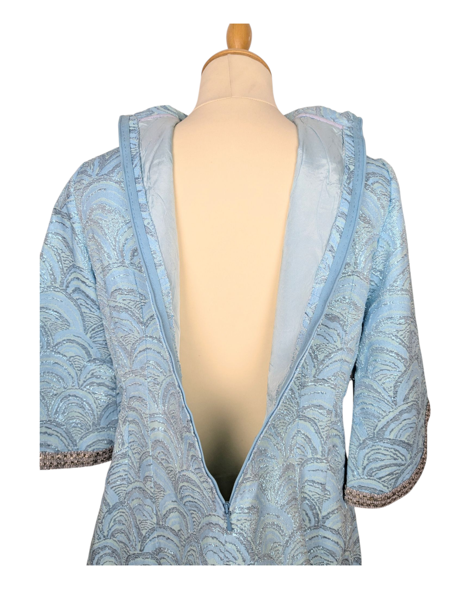La pépite tout droit sortie d'un album des Beatles. Juste magnifique et en parfait état. Tissu fluide avec beaucoup de tenue. Bleu ciel argenté, avec détails argentés. Manches 3/4 évasées, et fente sur le devant de la cuisse.Doublée et zippée dans le dos. Coup de coeur.