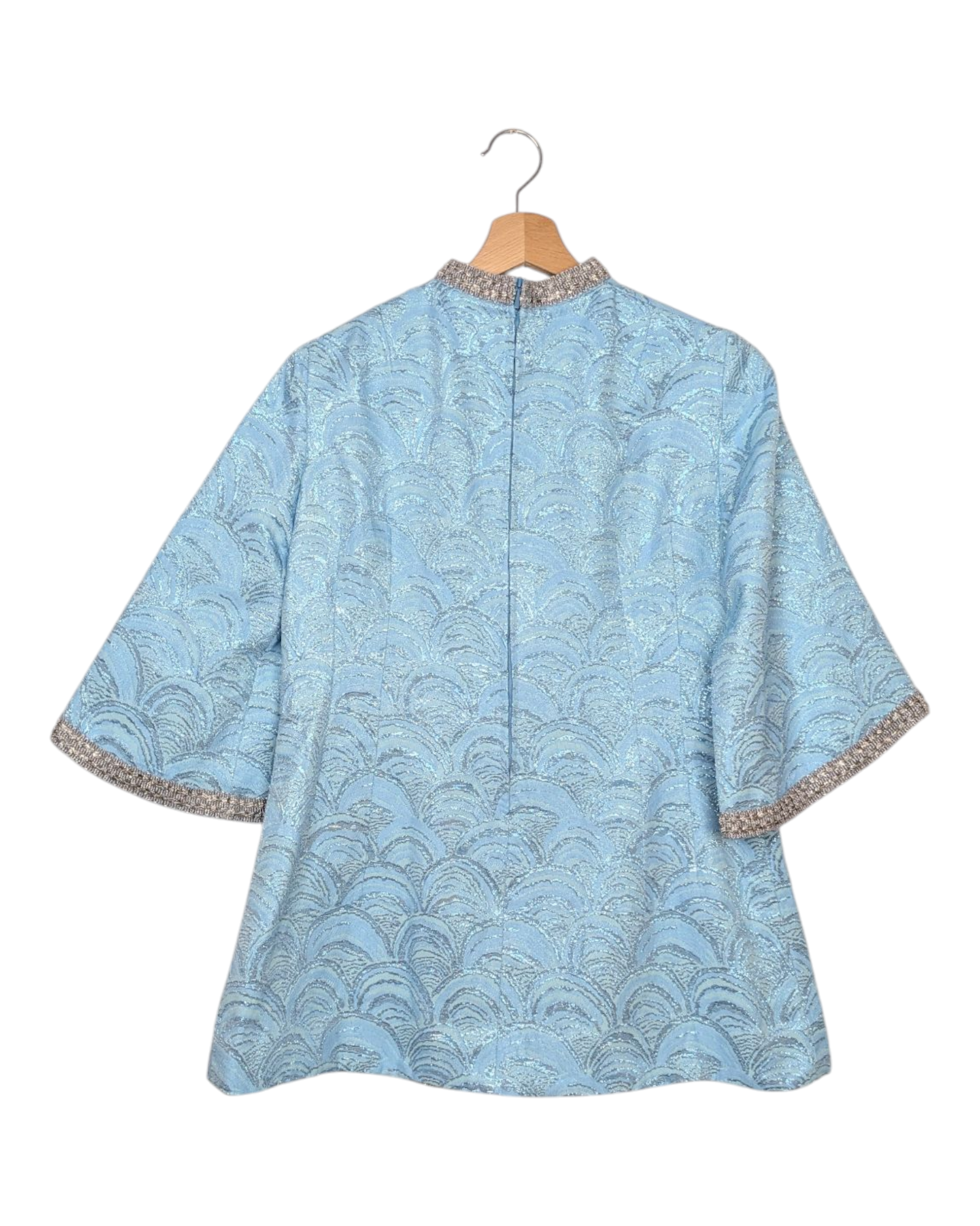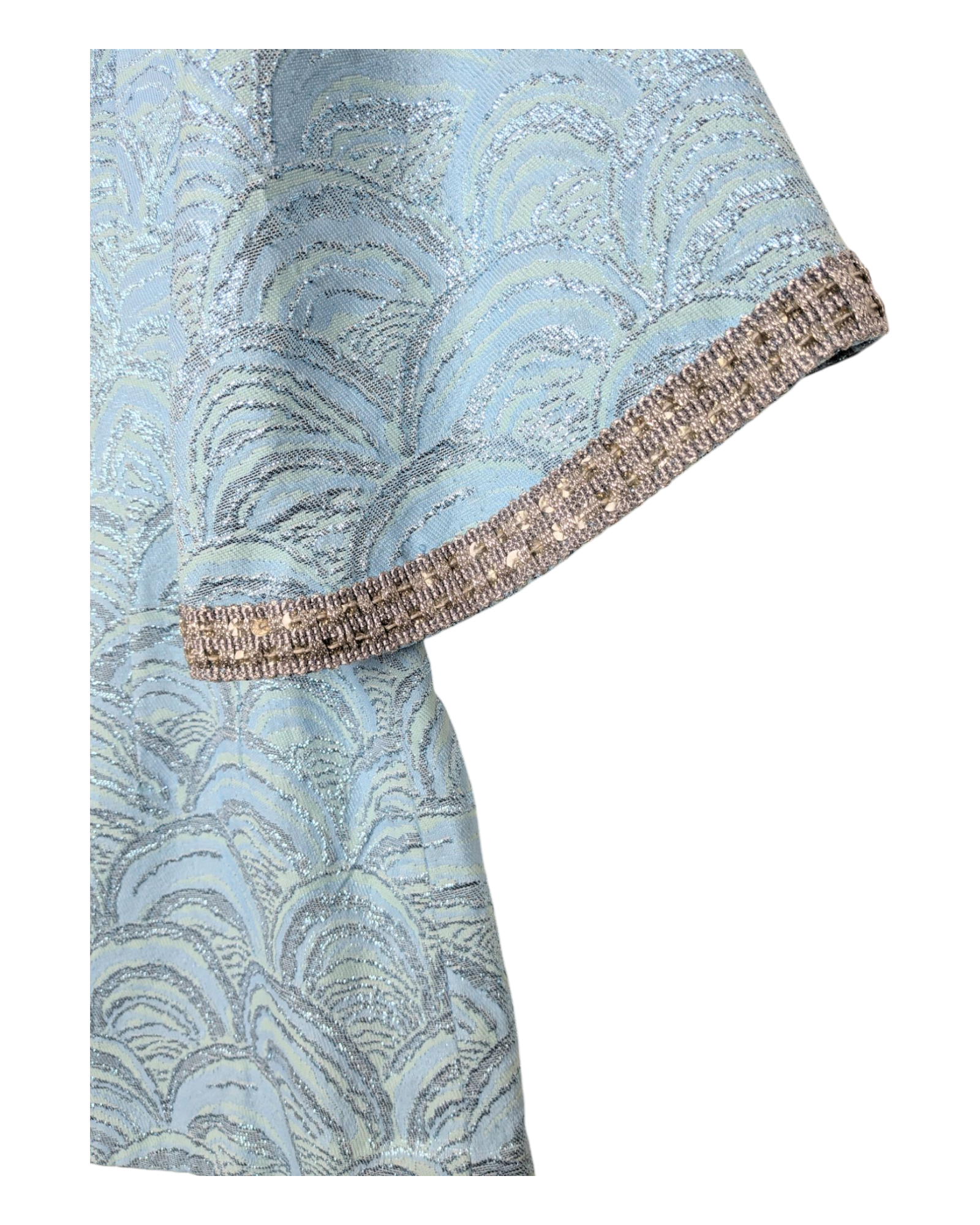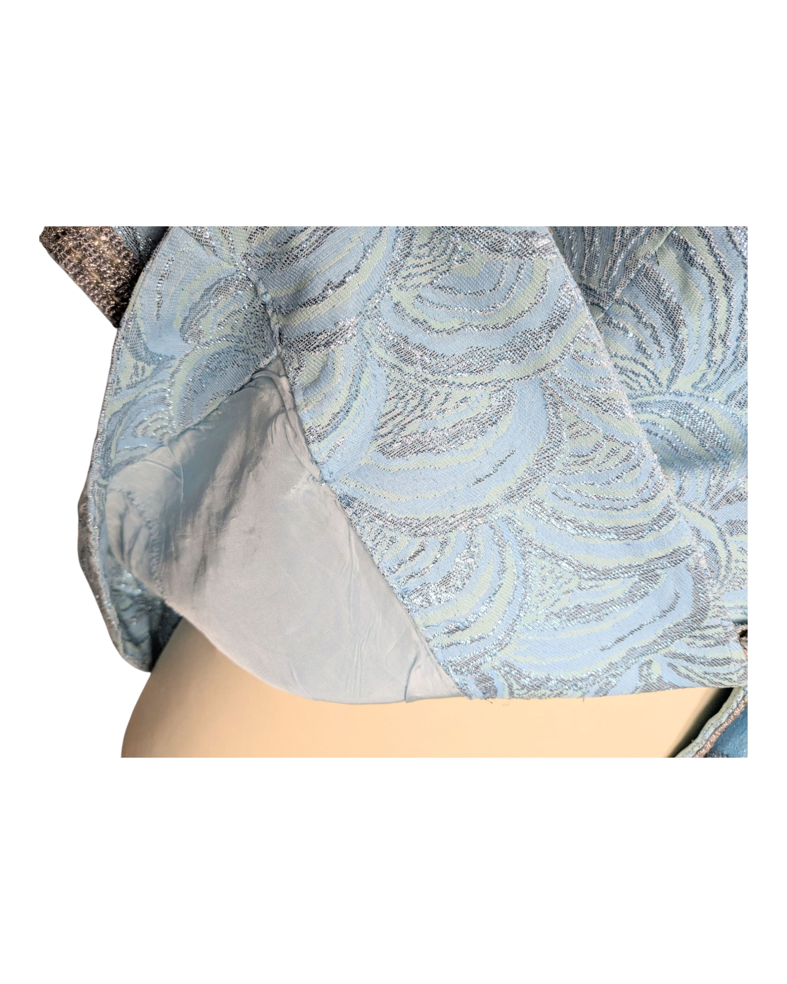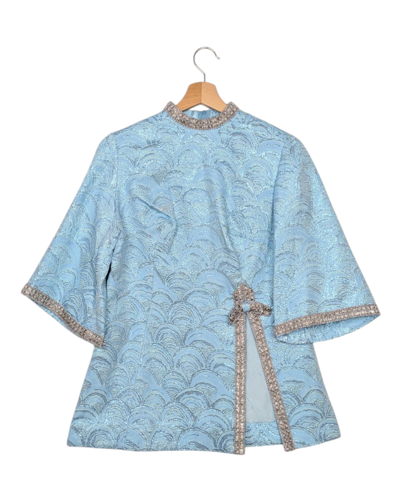 La pépite tout droit sortie d'un album des Beatles. Juste magnifique et en parfait état. Tissu fluide avec beaucoup de tenue. Bleu ciel argenté, avec détails argentés. Manches 3/4 évasées, et fente sur le devant de la cuisse.Doublée et zippée dans le dos. Coup de coeur.