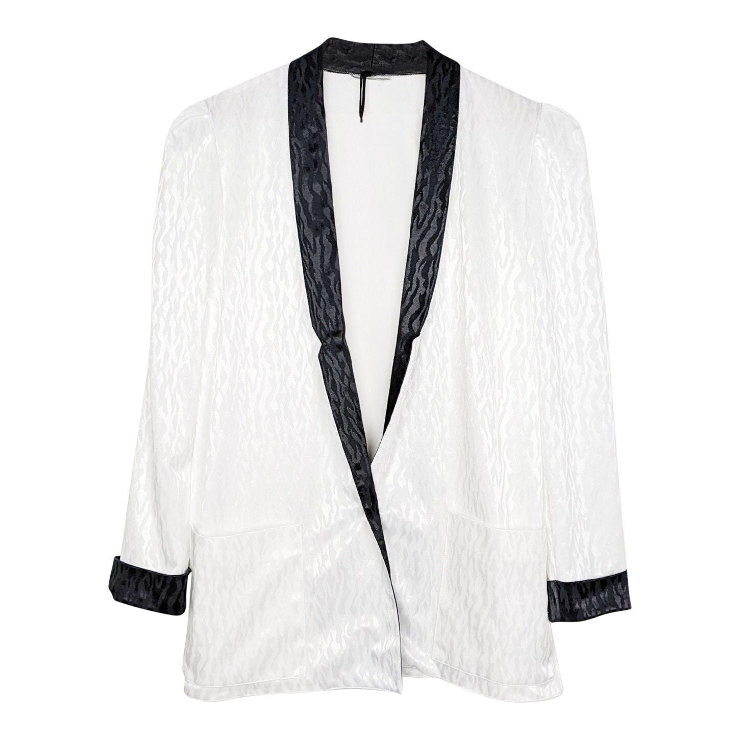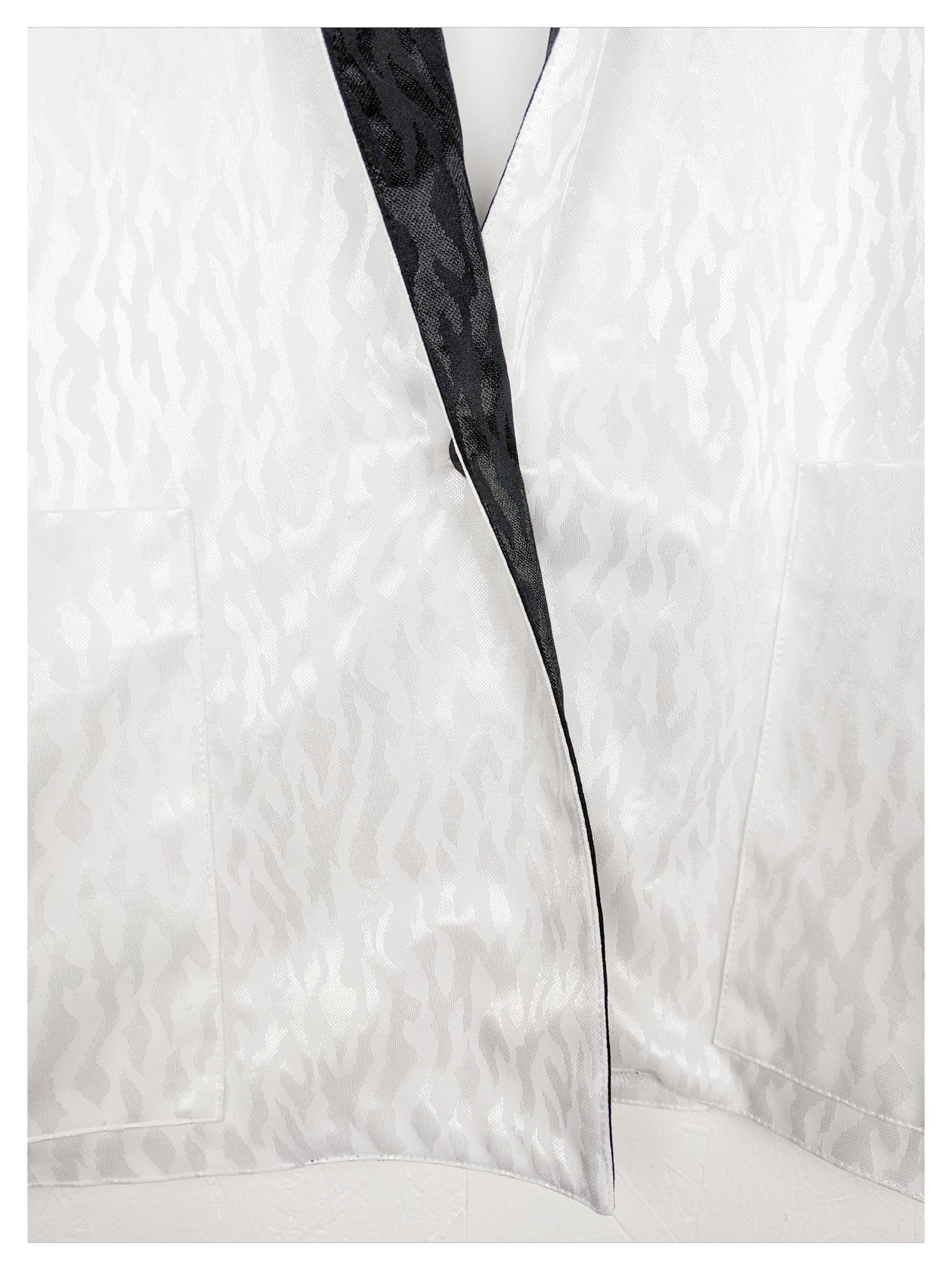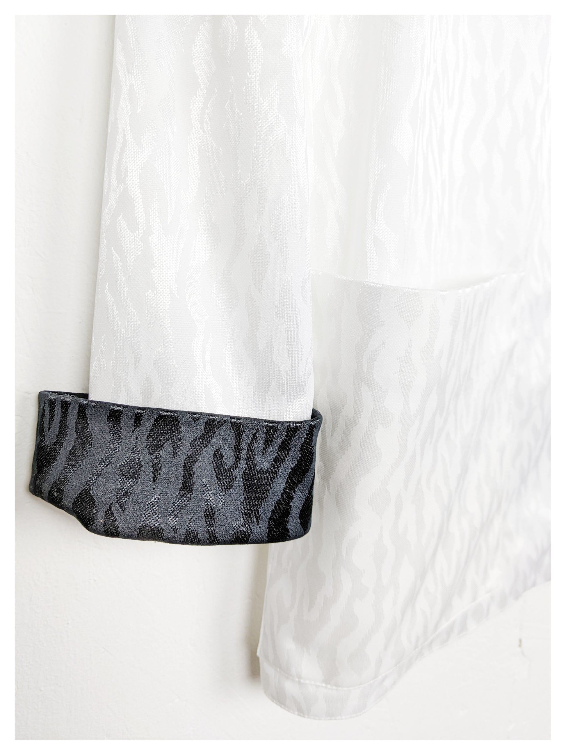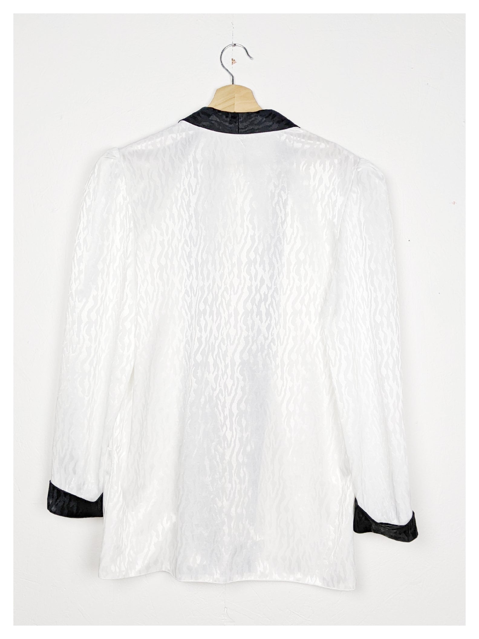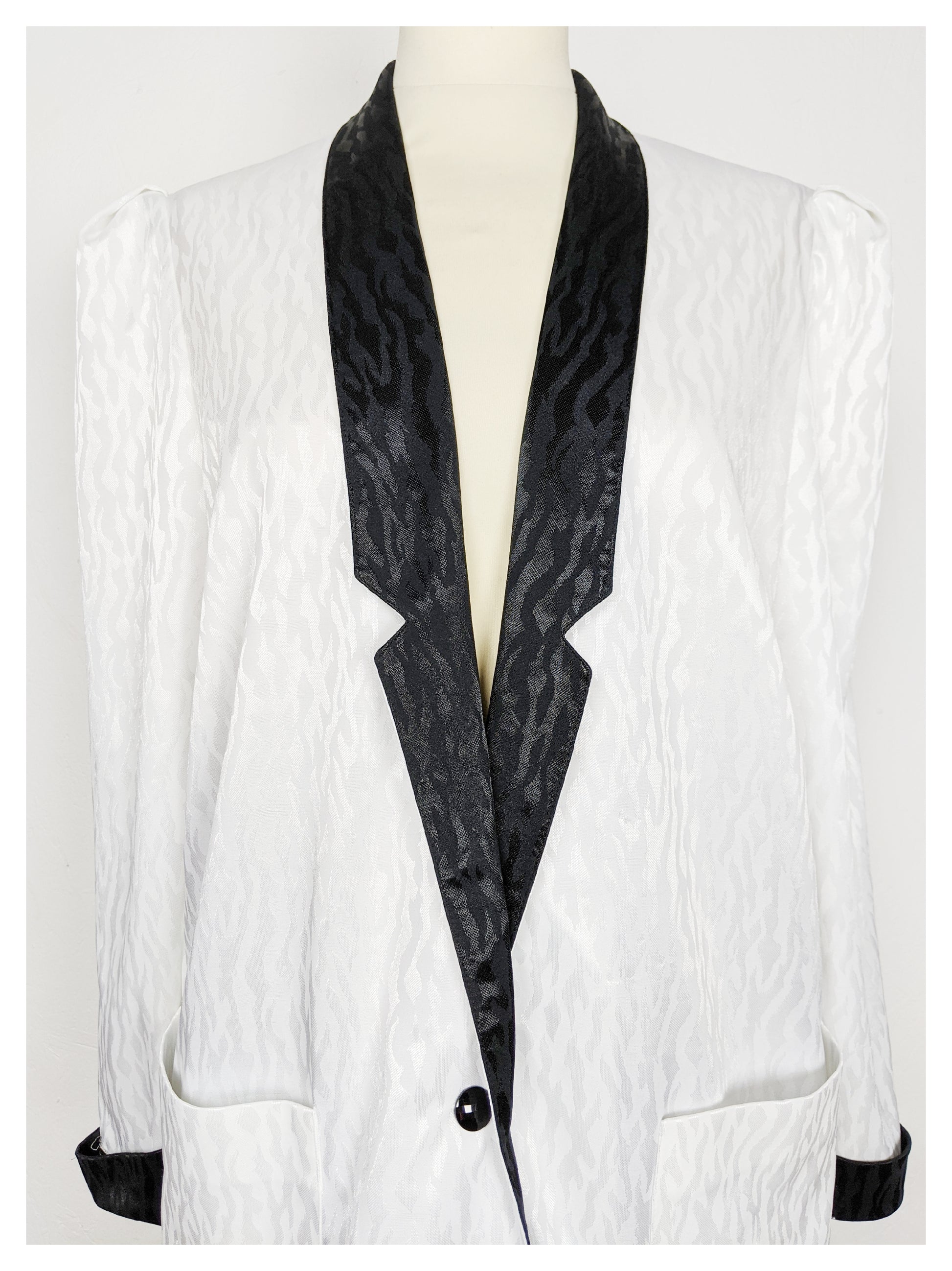 Jolie veste légère, type smoking dans les tons blancs et noir, avec motifs brillants "zèbre". Épaules légèrement ballon avec renfort molletonné pour plus de tenue. Deux poches plaquées de chaque côté. Poignets retournés. Coupe droite. Un bouton noir facetté au niveau de la taille en guise de fermeture.
