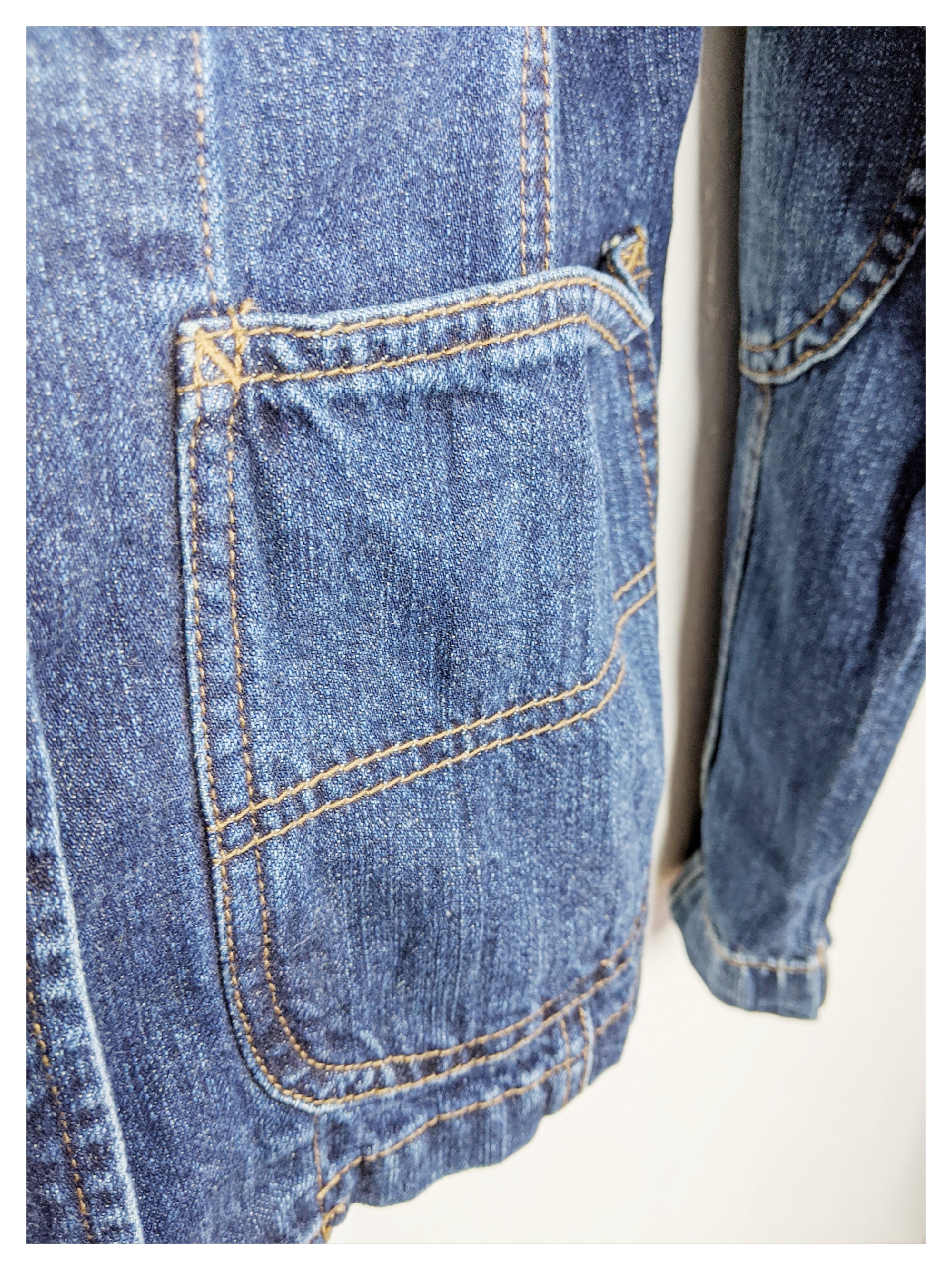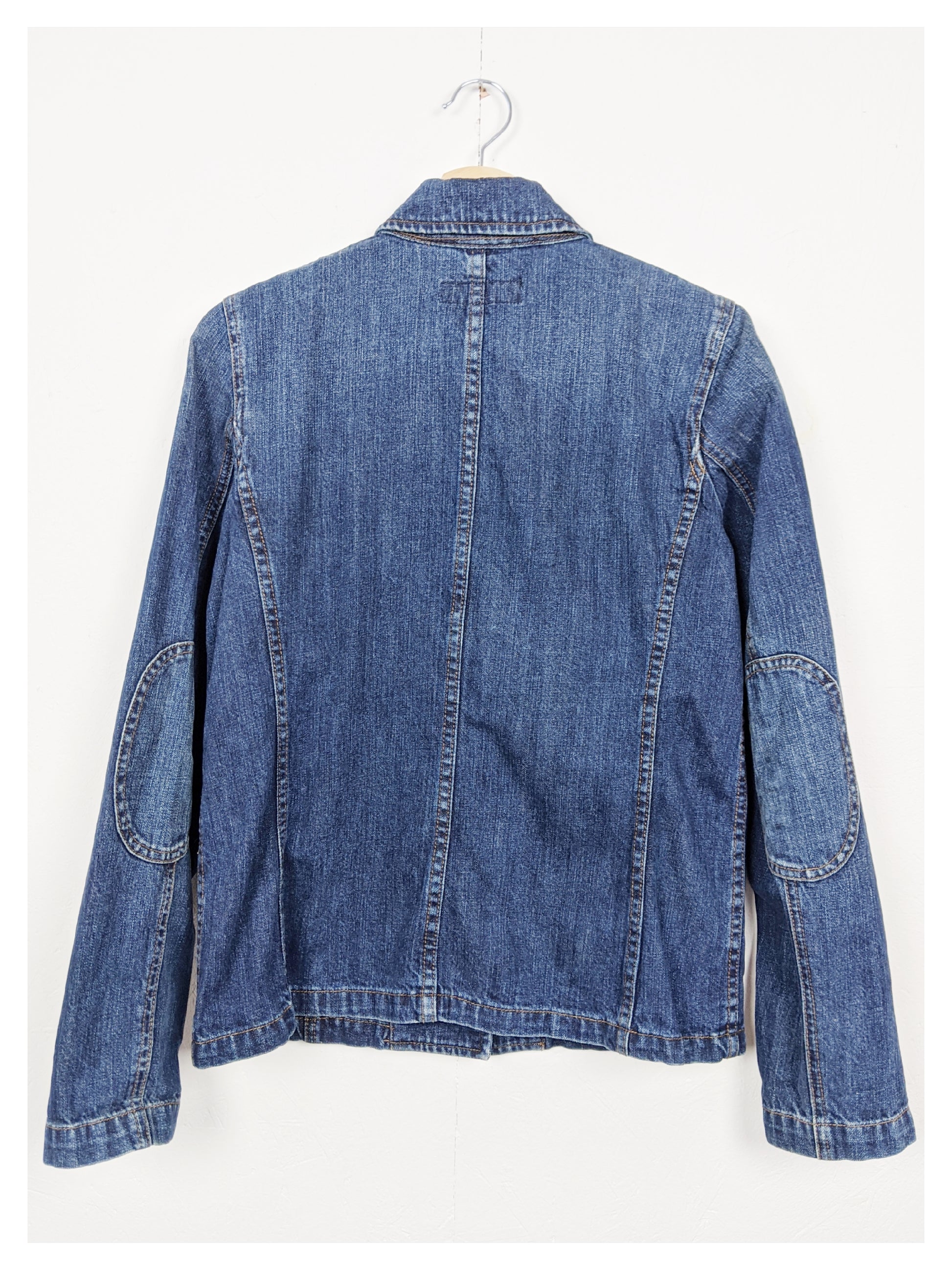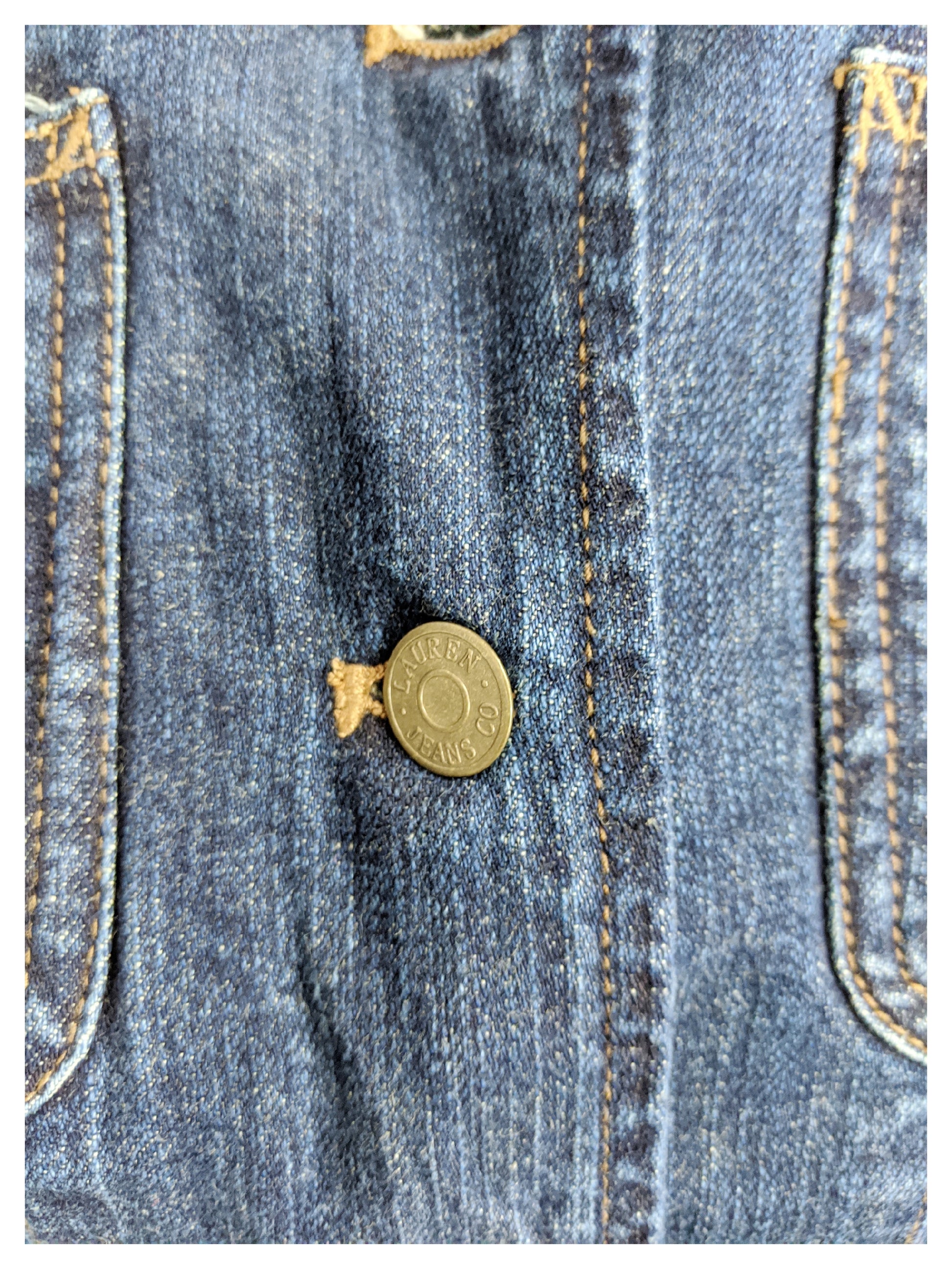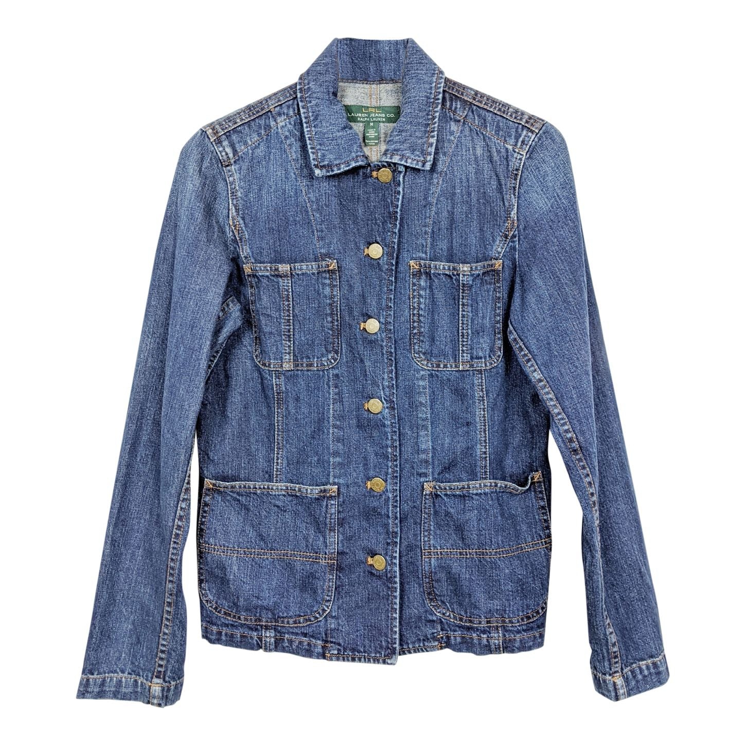 Veste, griffée Ralph Lauren, en jean bleu foncé. Encolure chemise, boutonnée sur le devant par 6 boutons. Deux poches plaquées de chaque côté de la poitrine, ainsi qu'au niveau de la taille. Coupe droite, légèrement cintrée. Jean assez souple.