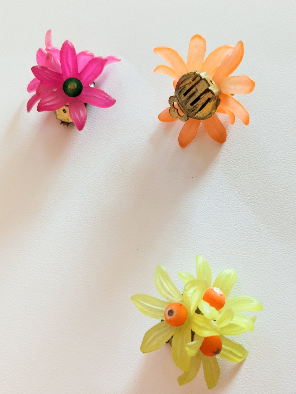 Boucles d'oreilles clips, en forme de fleur. Bicolore en trois couleurs. En plastique. Mon gros coups de coeur !