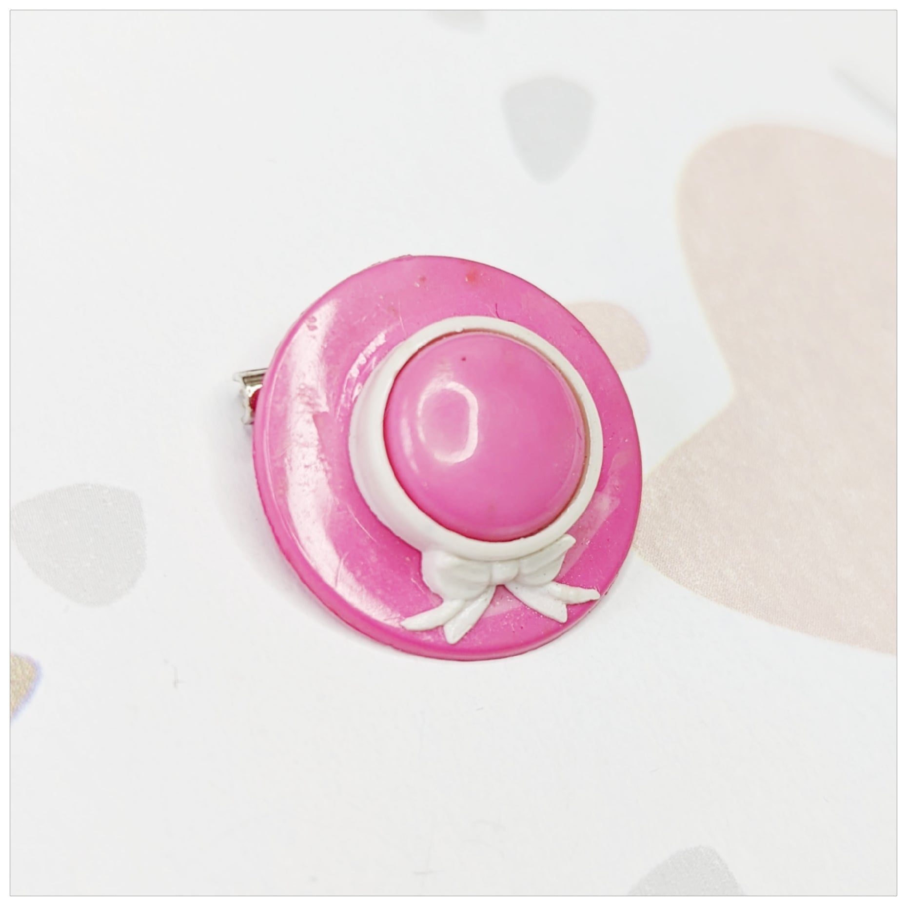 Petite broche en forme de chapeau rond. Fuchsia avec noeud blanc.