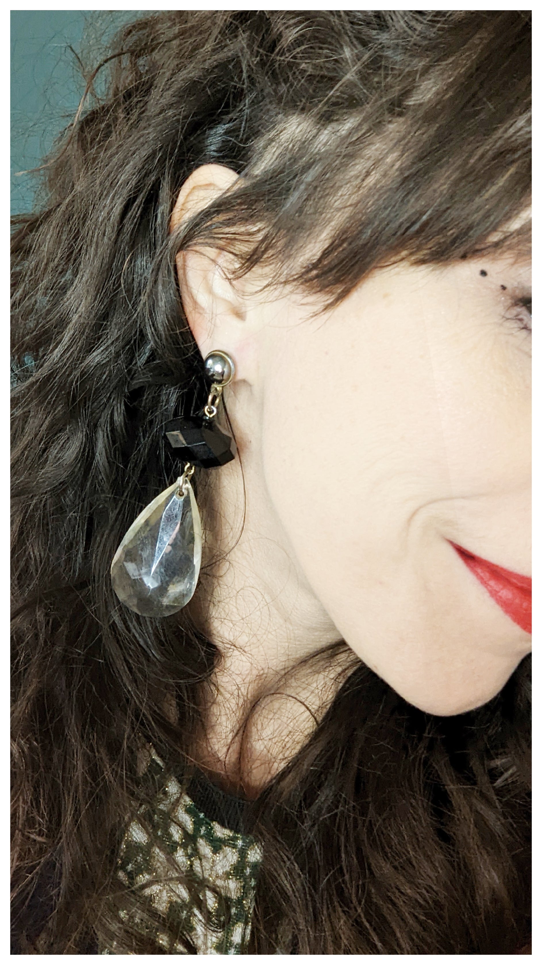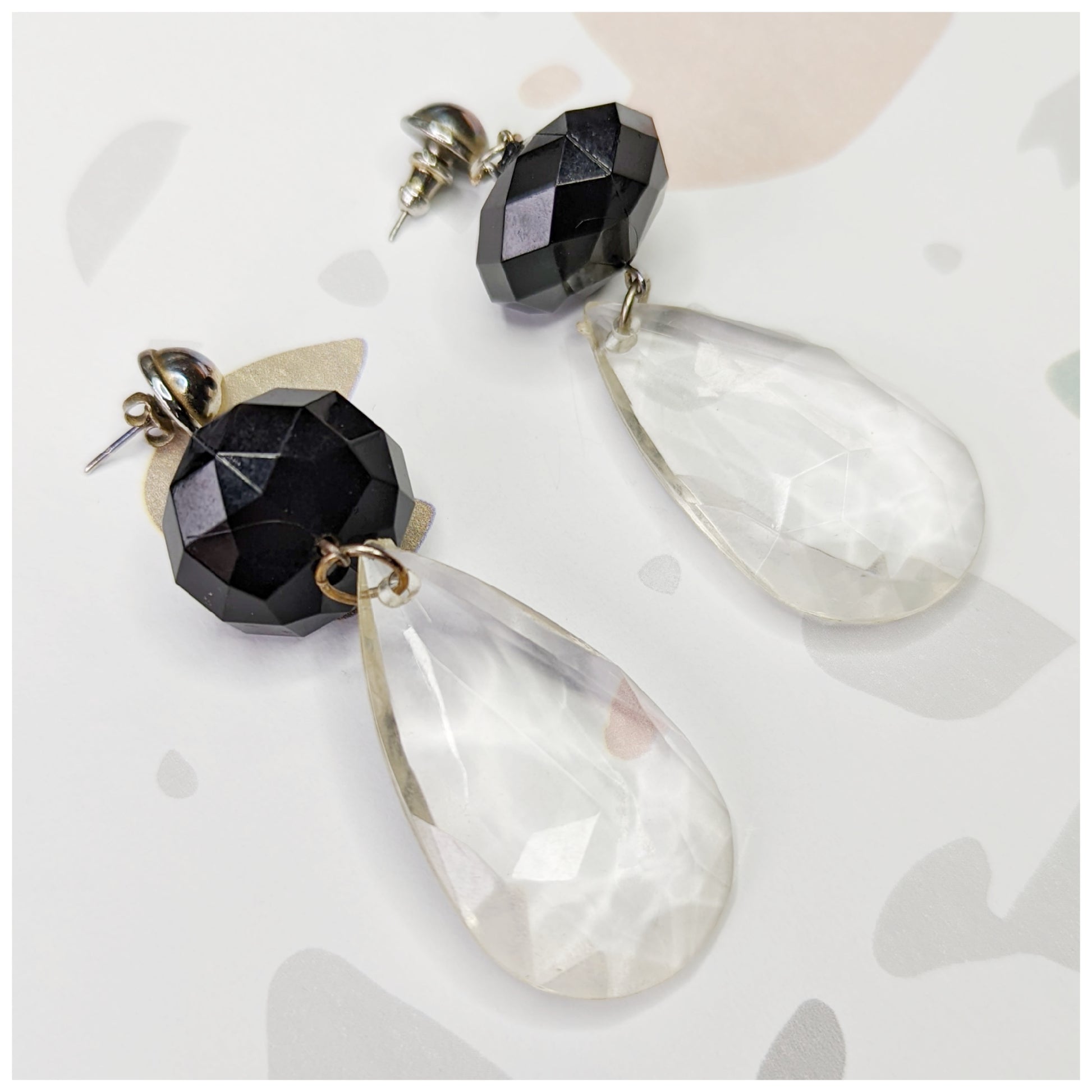 Boucles d'oreilles, attaches "clous", avec perle en losange facettée transparentes et perles noires à facettes.