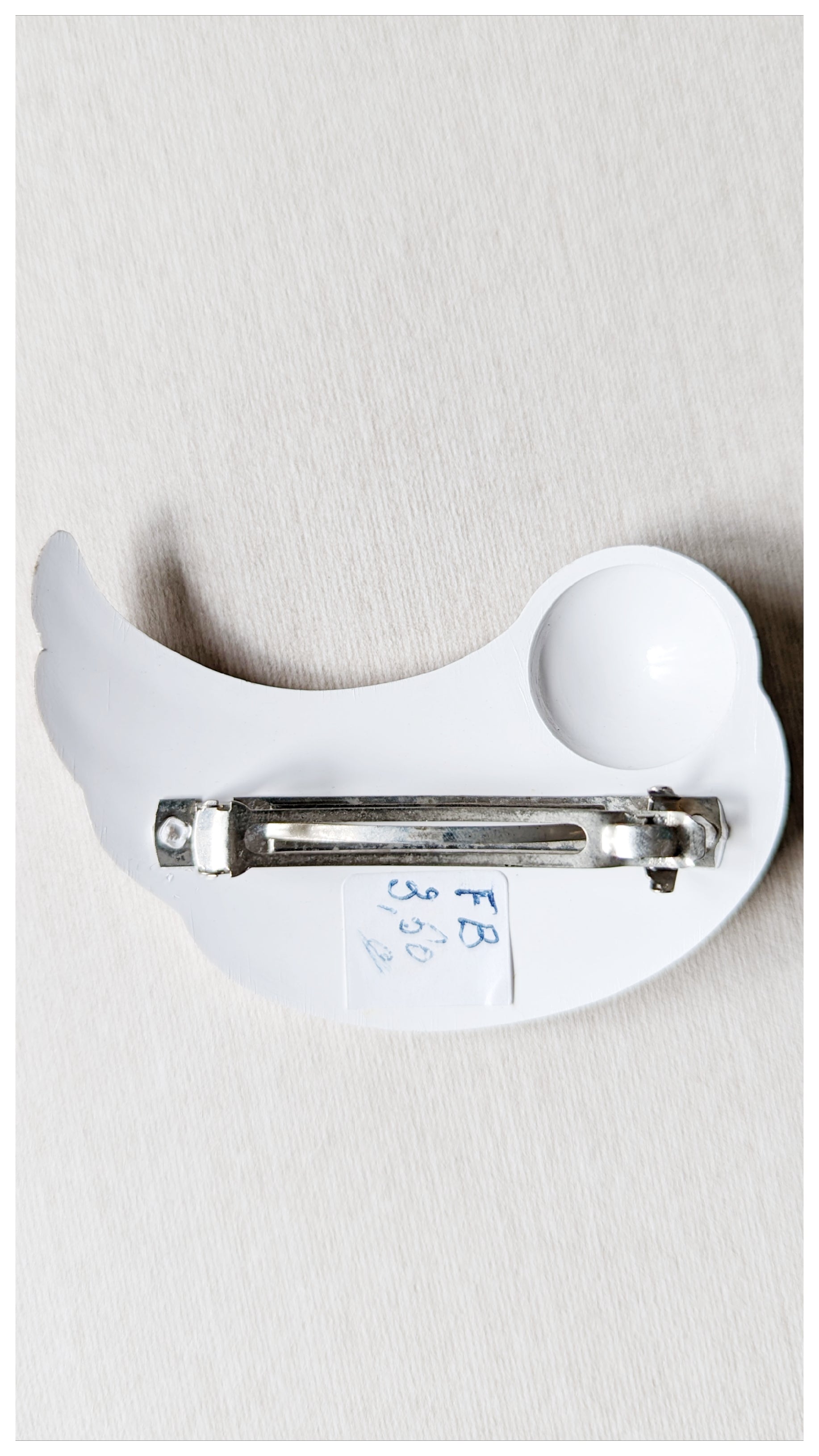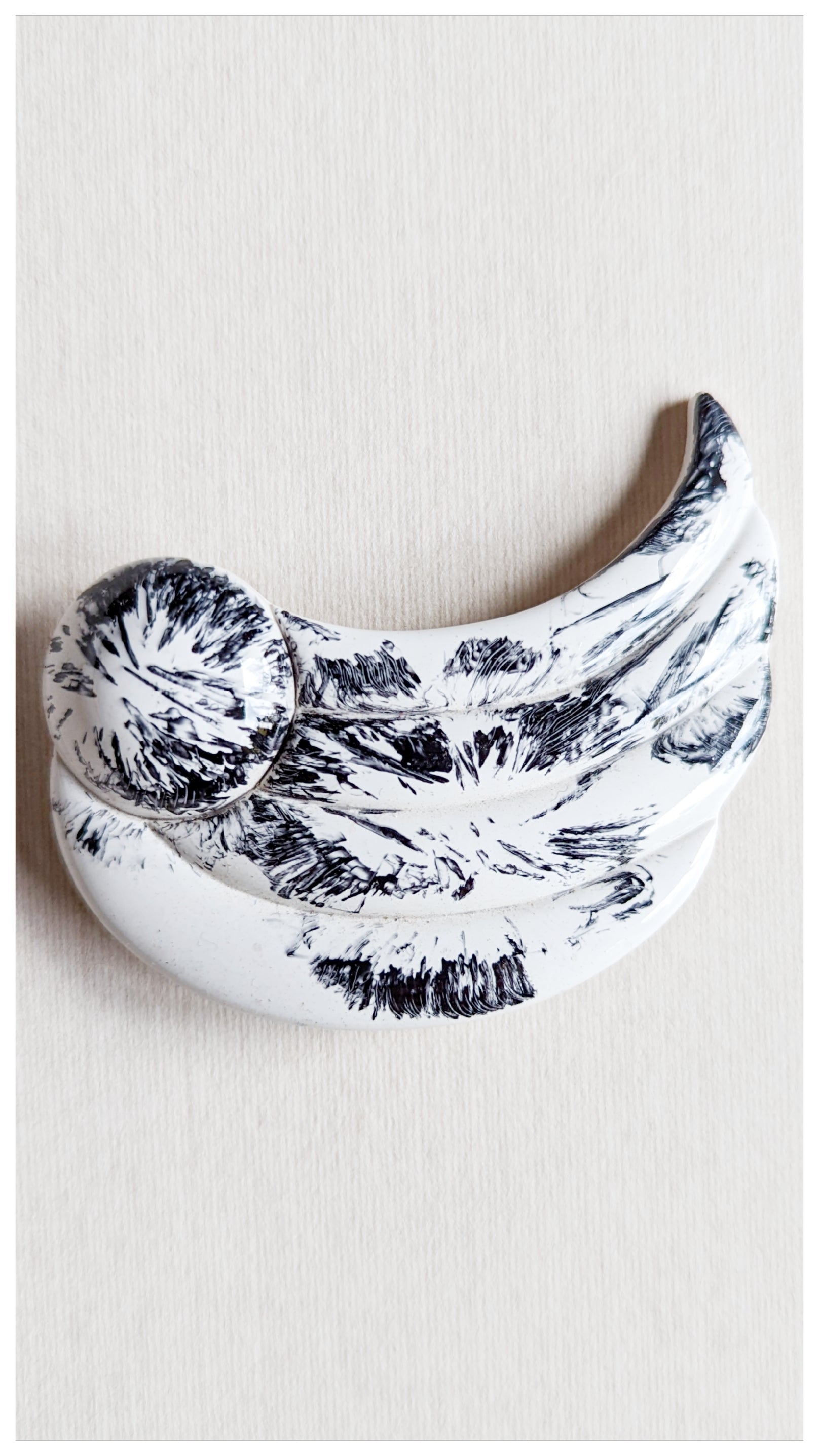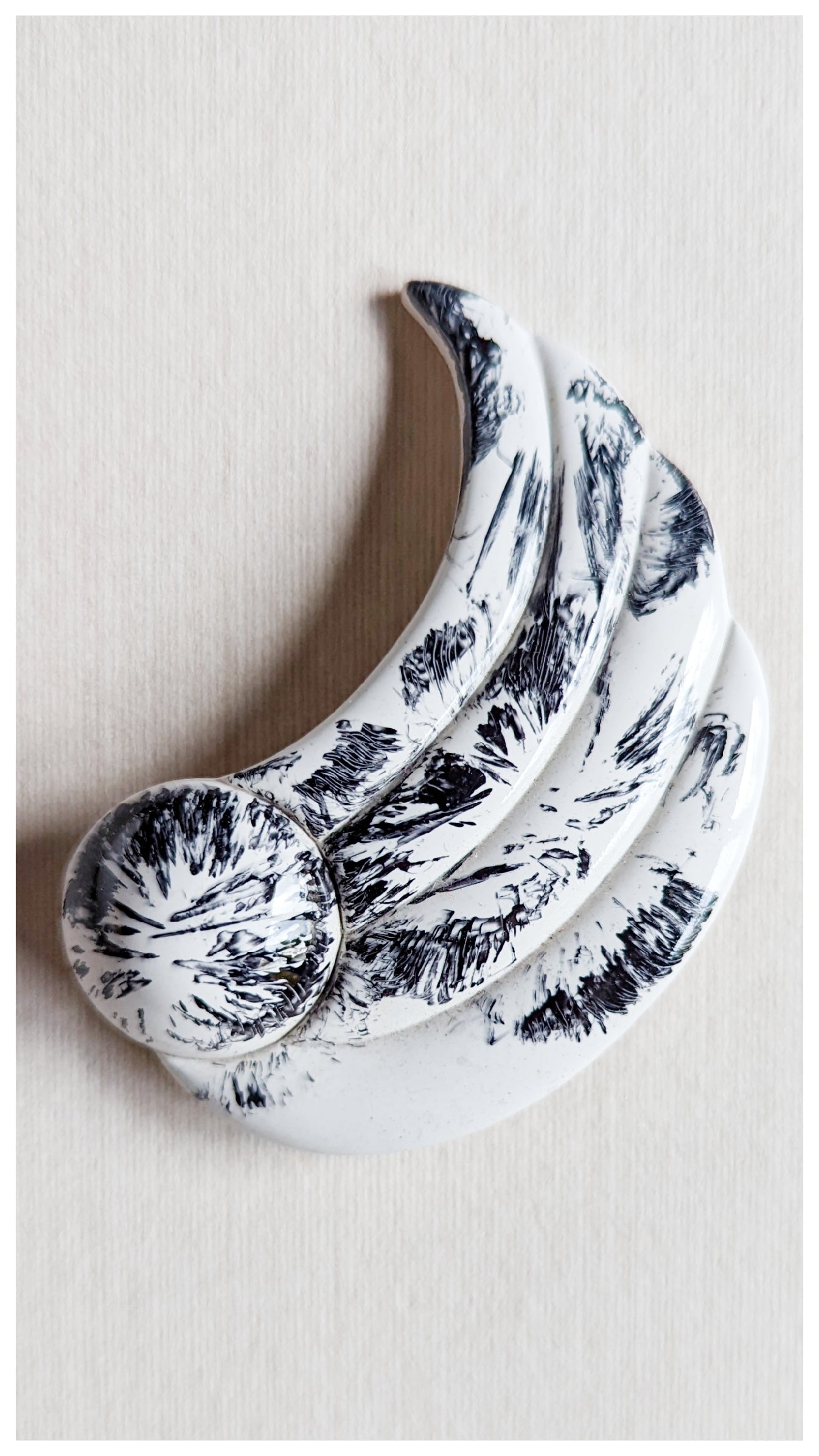Grosse pince à cheveux en plastique blanc et noir, forme plume, pince métalique.