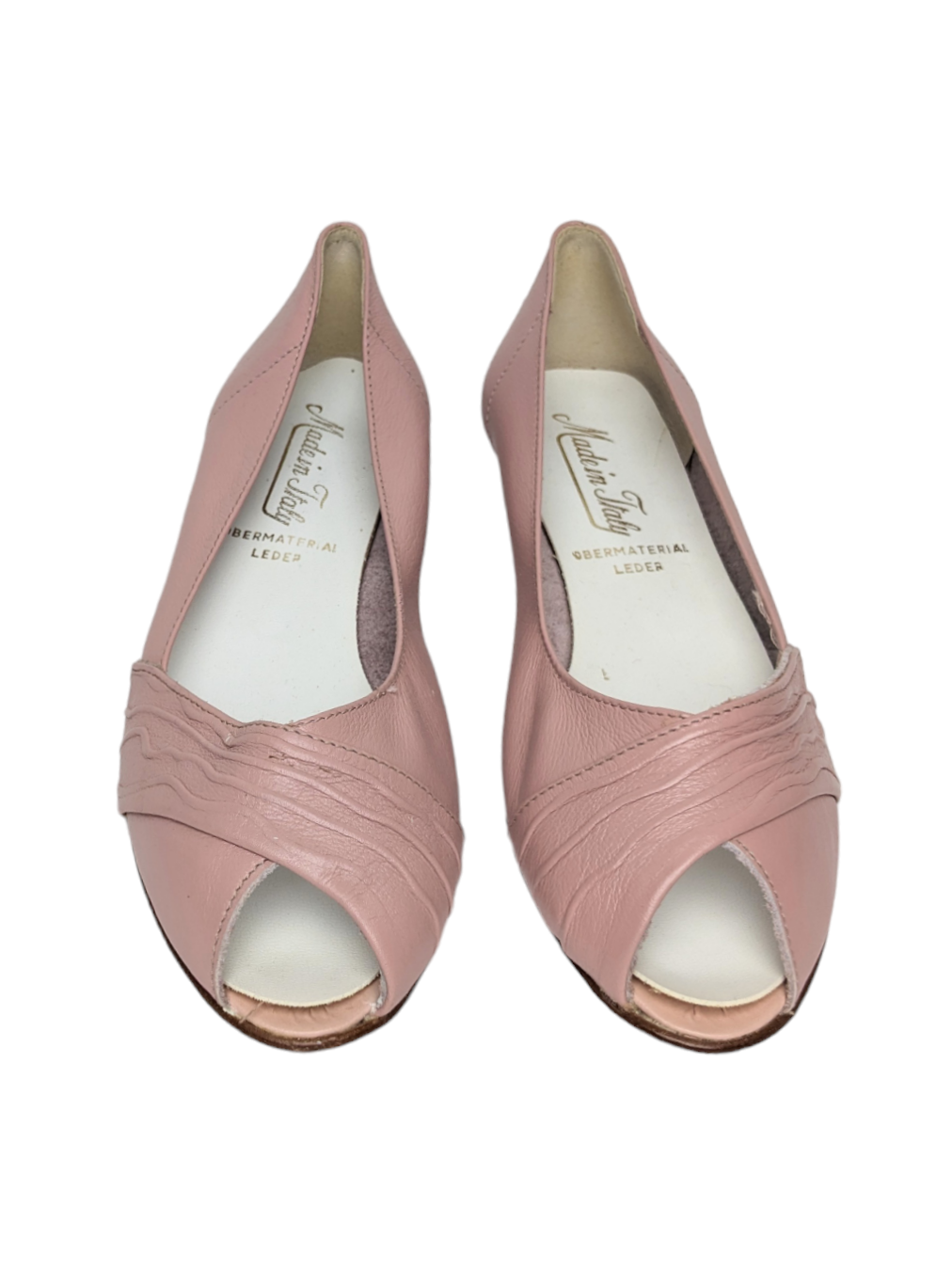 Très jolies ballerines-sandales en cuir vieux rose. Ouvertes sur le devant, avec drappé.