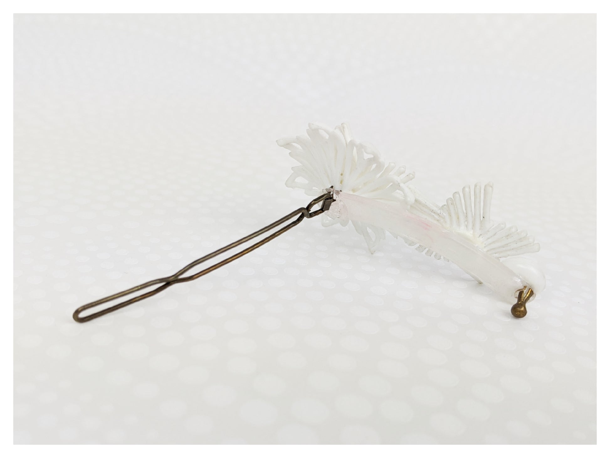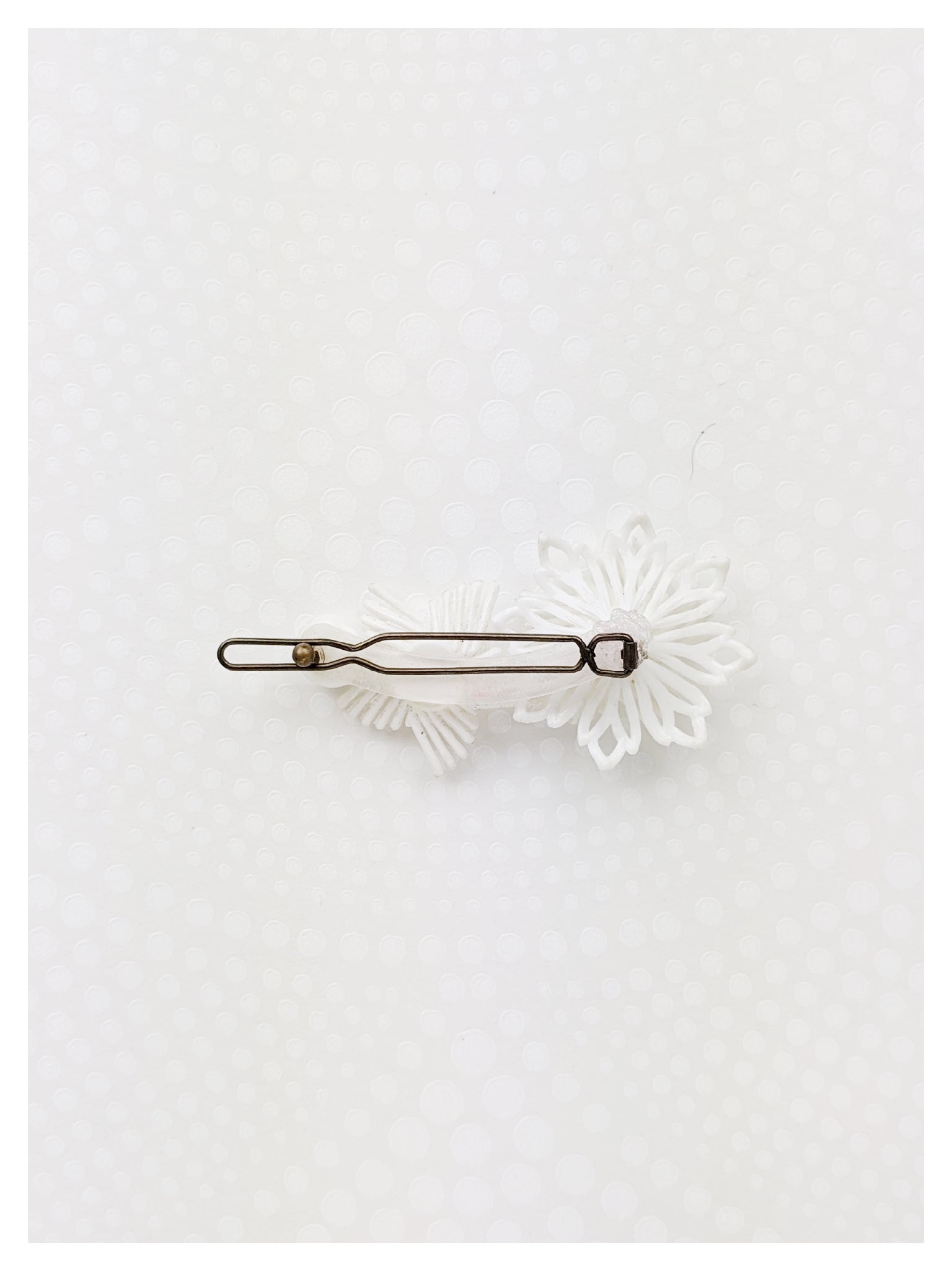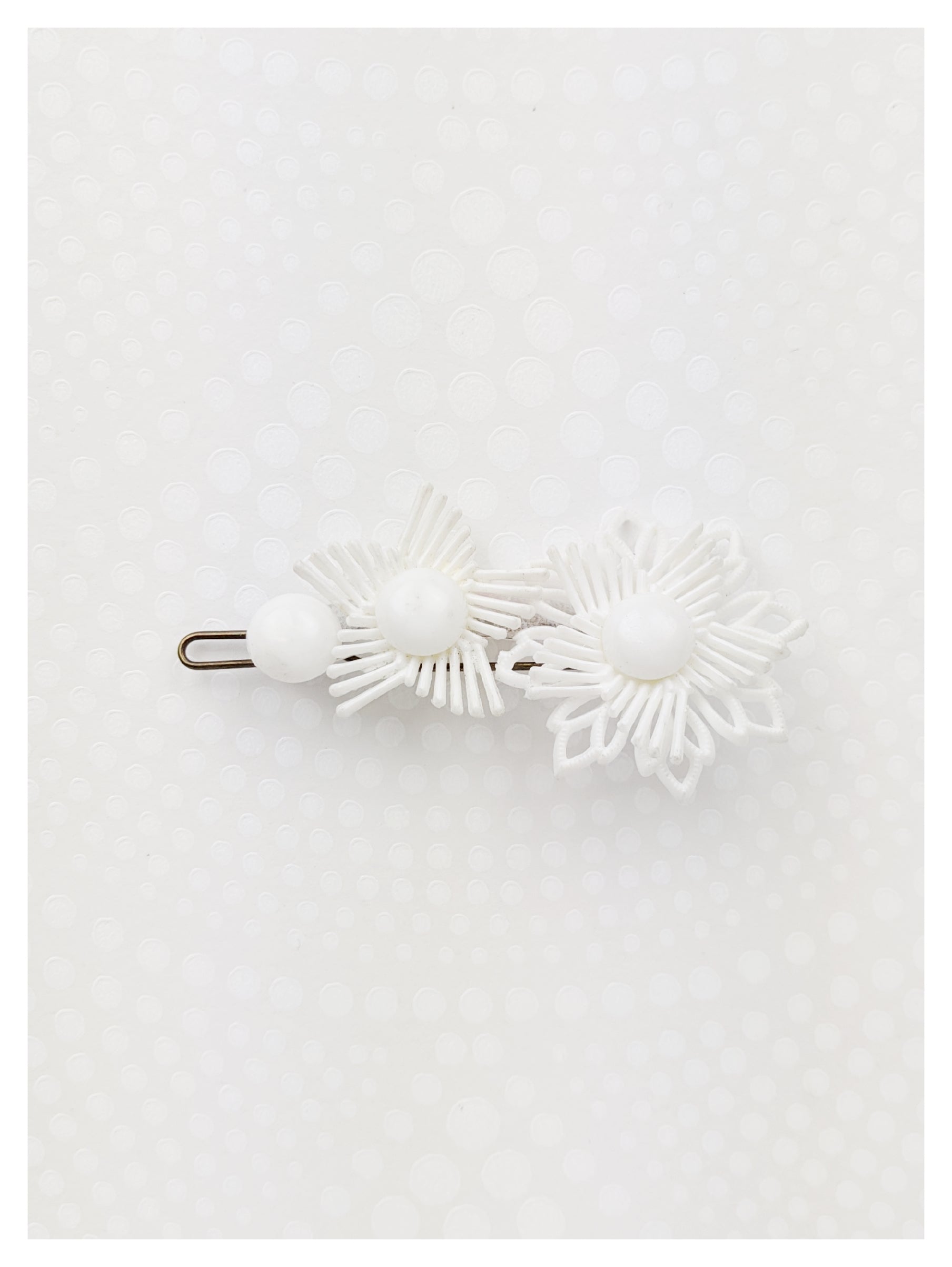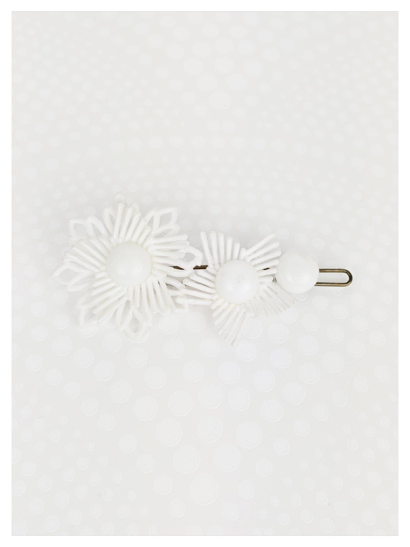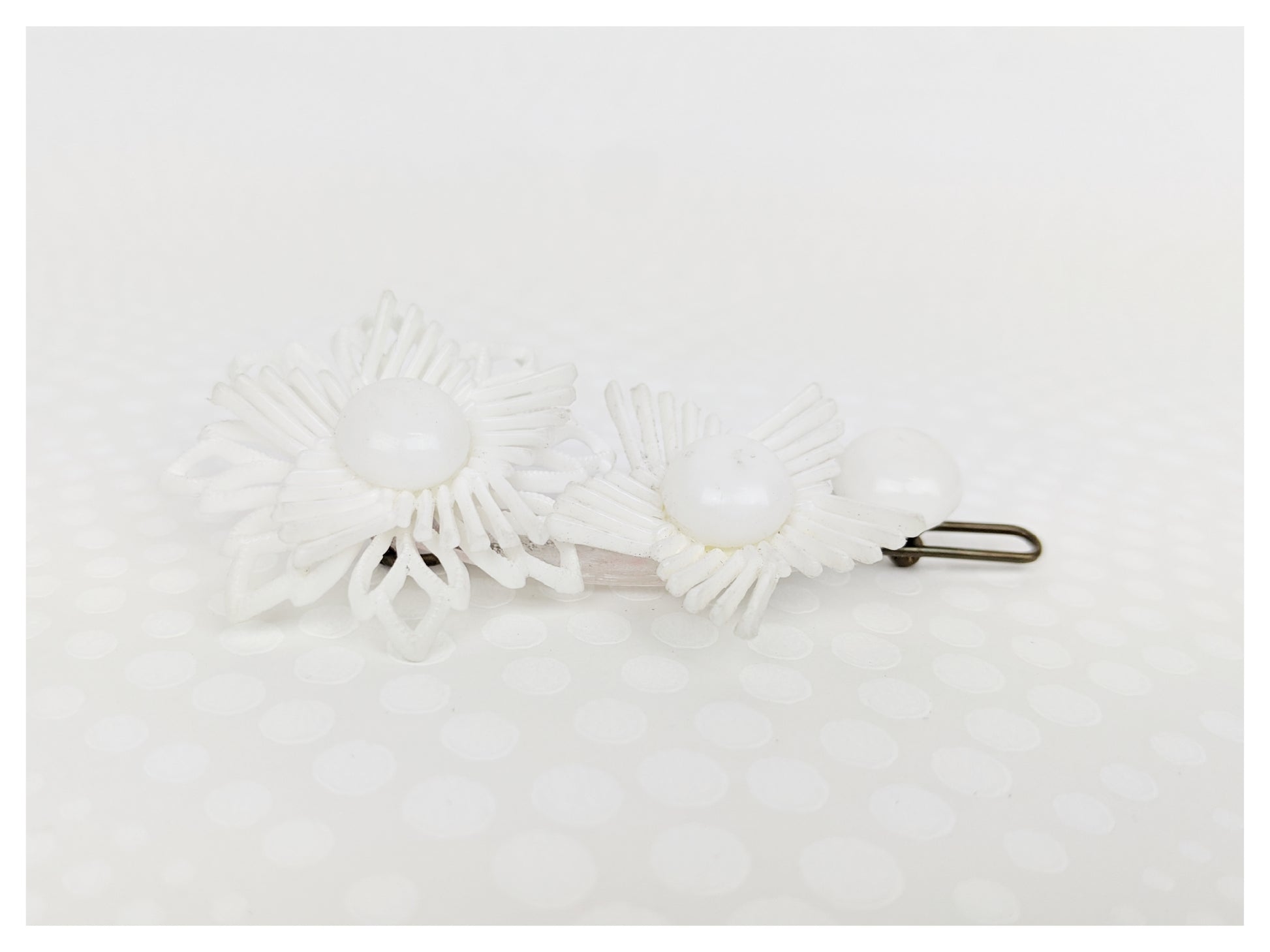Pince à cheveux plate. Fleurs et demi-sphères stylisées en plastique blanc.