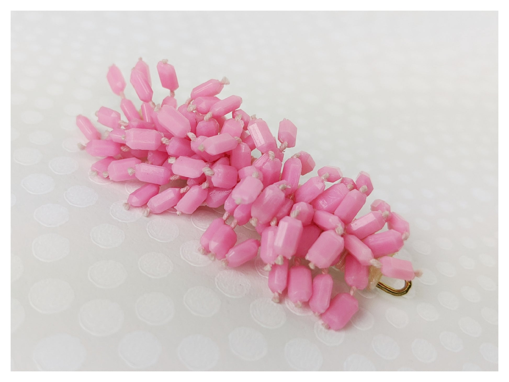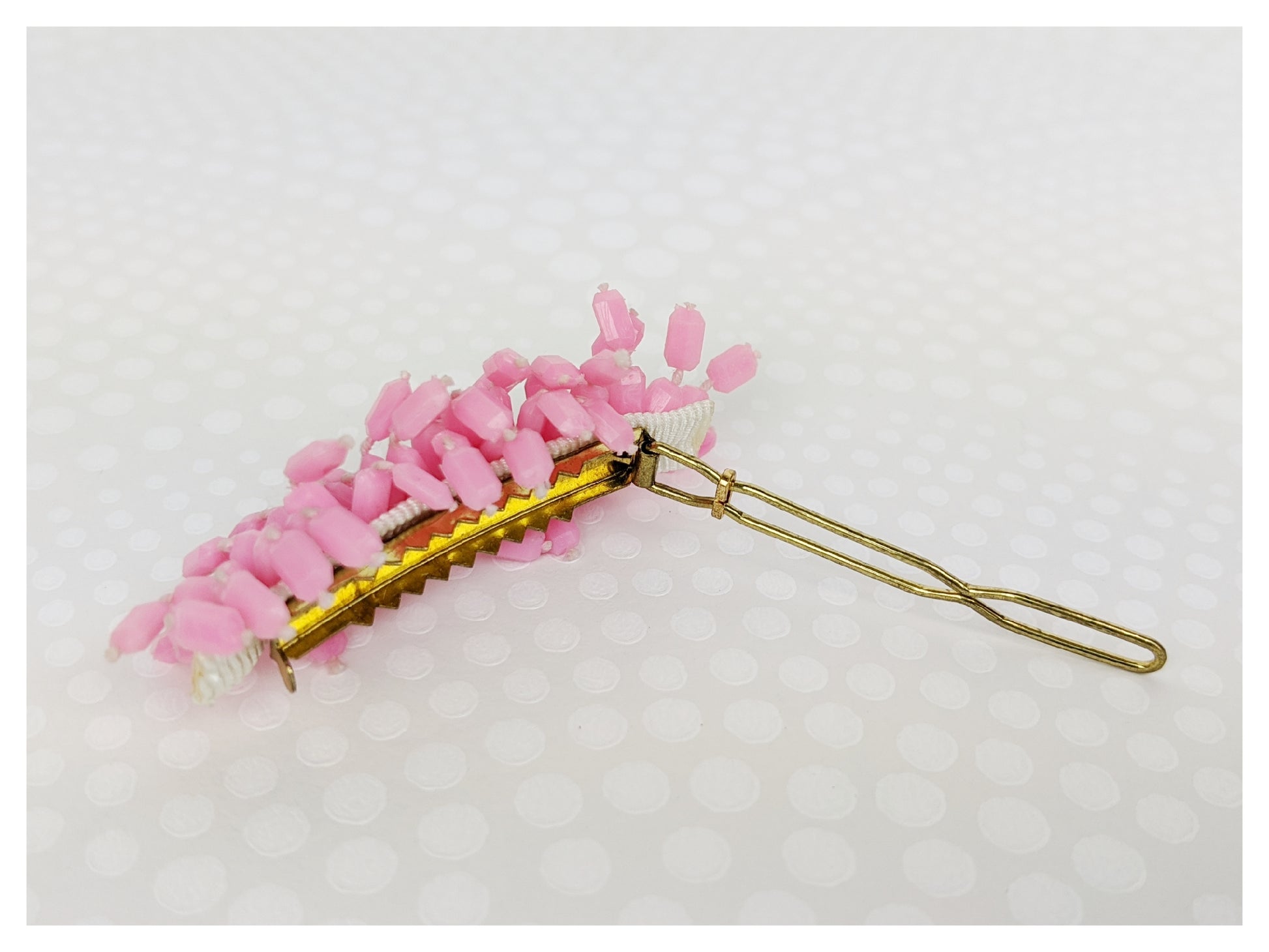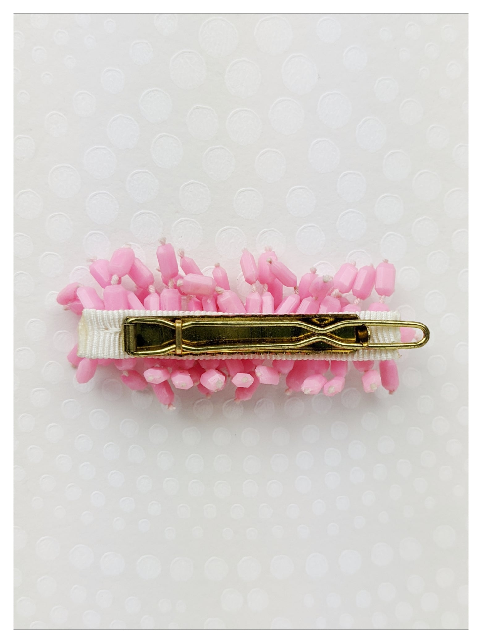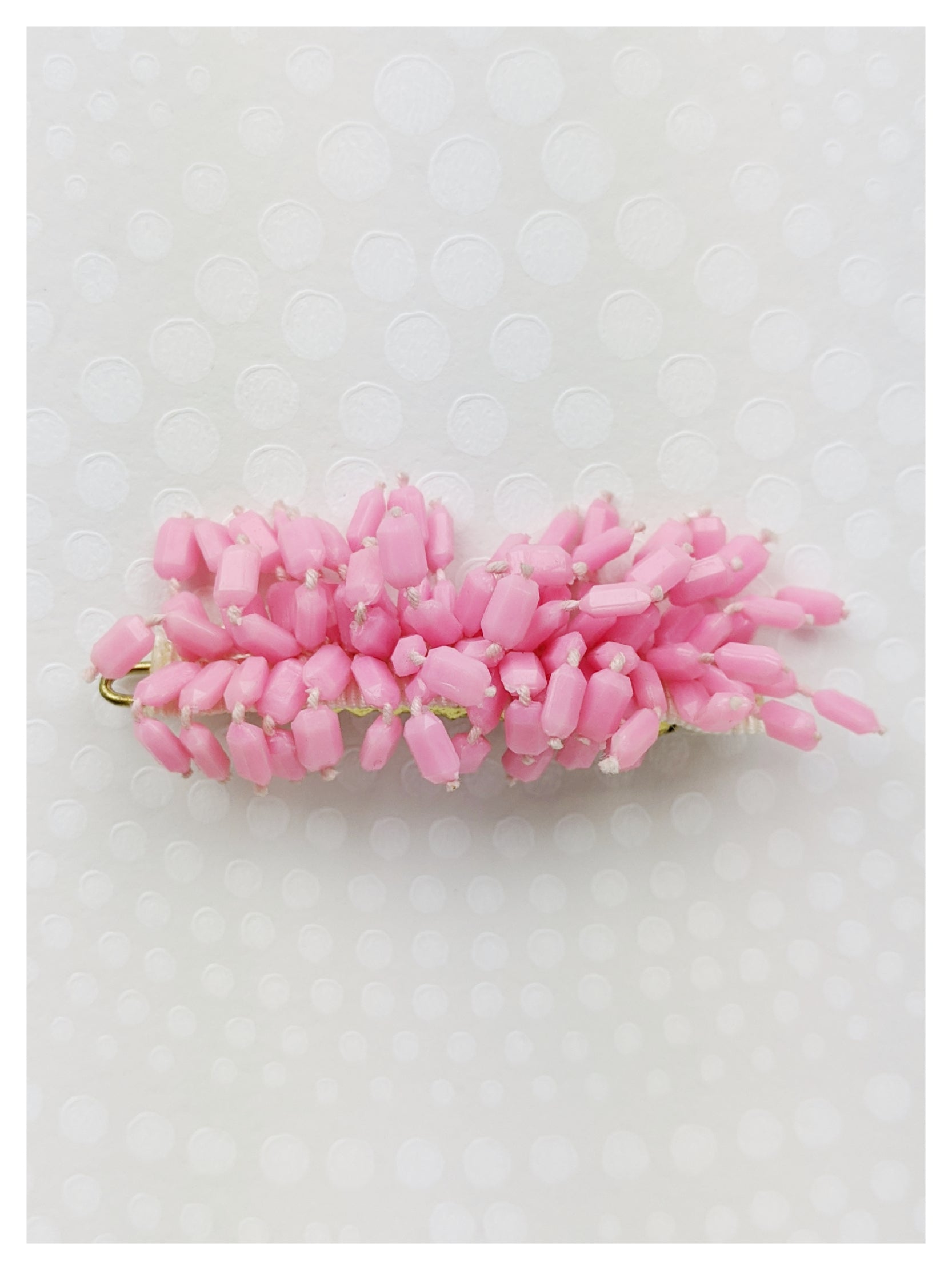 Pince à cheveux plate. Petites perles cylindres à facettes de couleur rose.