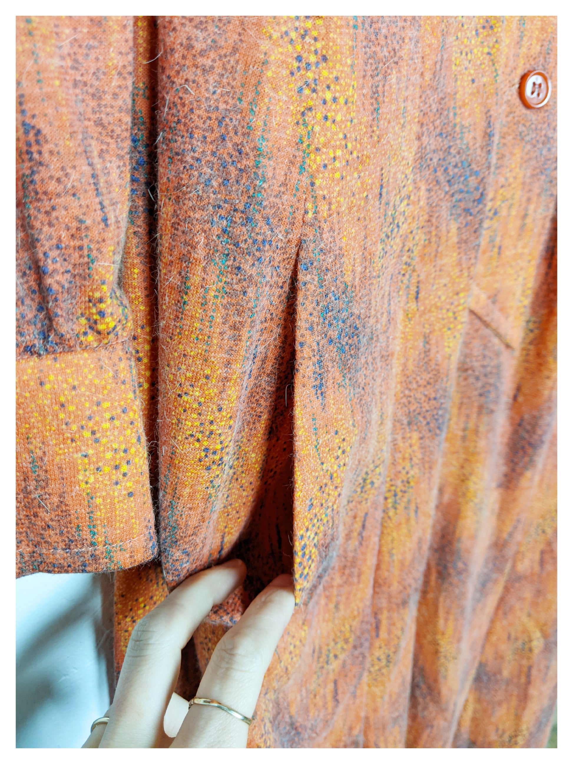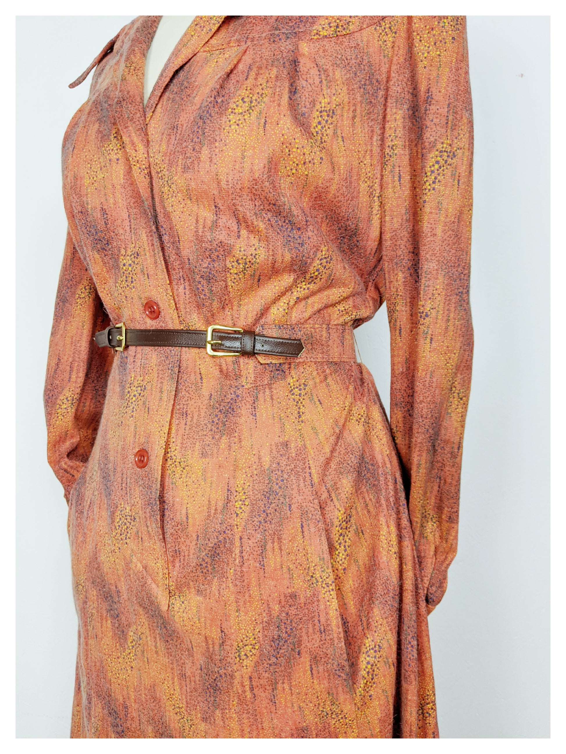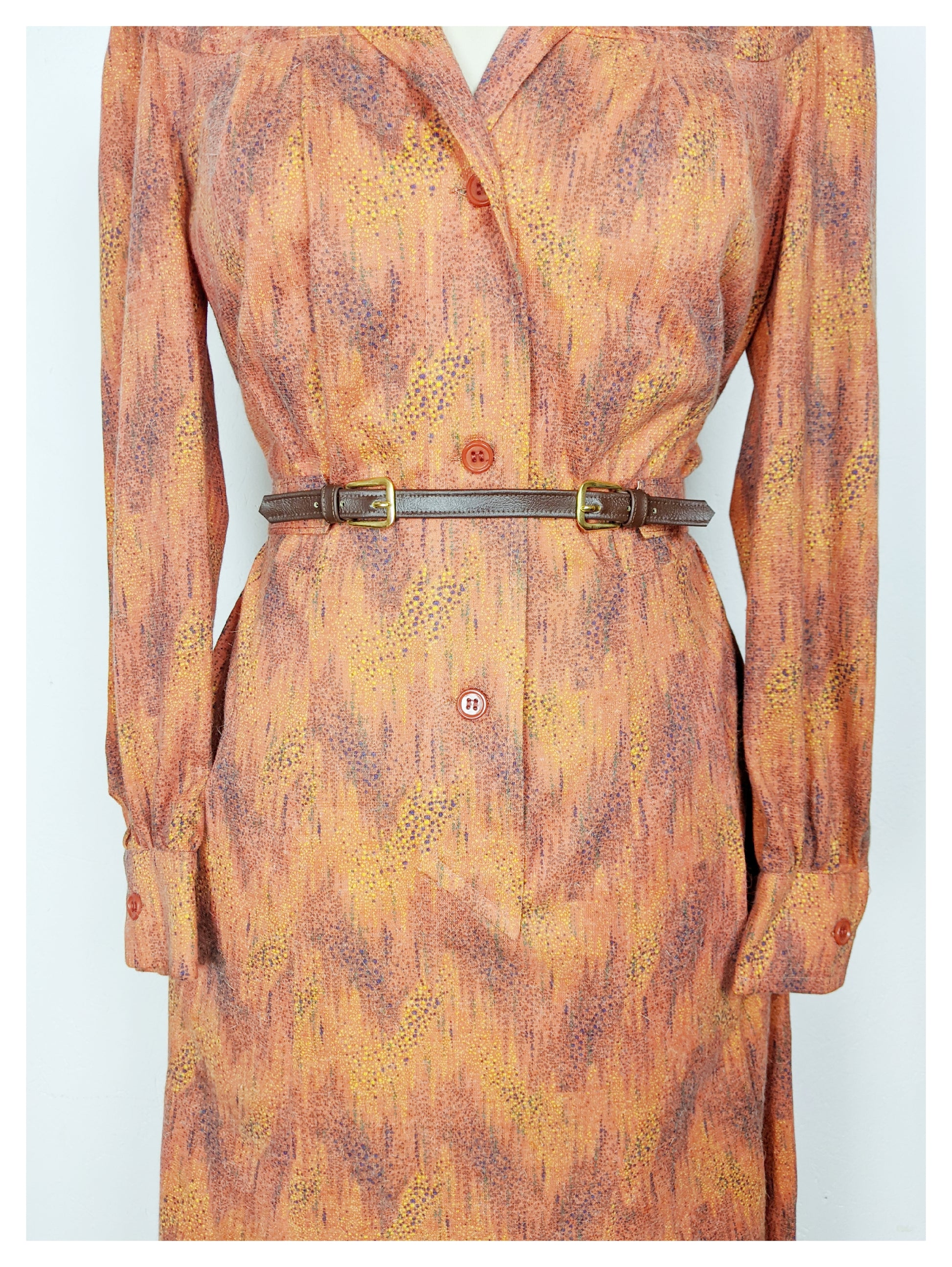 Superbe robe fluide en angora, dans les tons orangé, moutarde, noir et vert.Col cavalier et pelle à tarte. Encolure donnant sur un corsage boutonné jusqu'en dessous de la taille par trois boutons orange, finissant en pointe. Épaules légèrement froncées et manches resserrées aux poignets (chemisiers) avec un bouton orange. Empiècement au niveau des épaules avec fronçage au dessus de la poitrine pour un effet blousant. Pinces à la taille pour marquer celle ci, ainsi qu'une ceinture en tissu et similicuir et boucles dorées avec passants de chaque côté. Jupe trapèze à plusieurs pans. Deux poches invisibles à la verticale de chaque côté (au niveau de la jupe). Elle est très douce au touché.