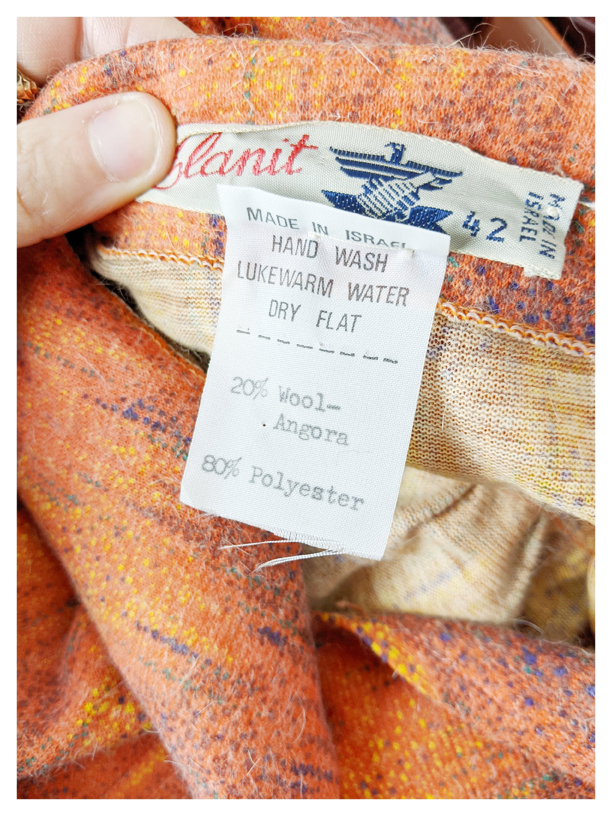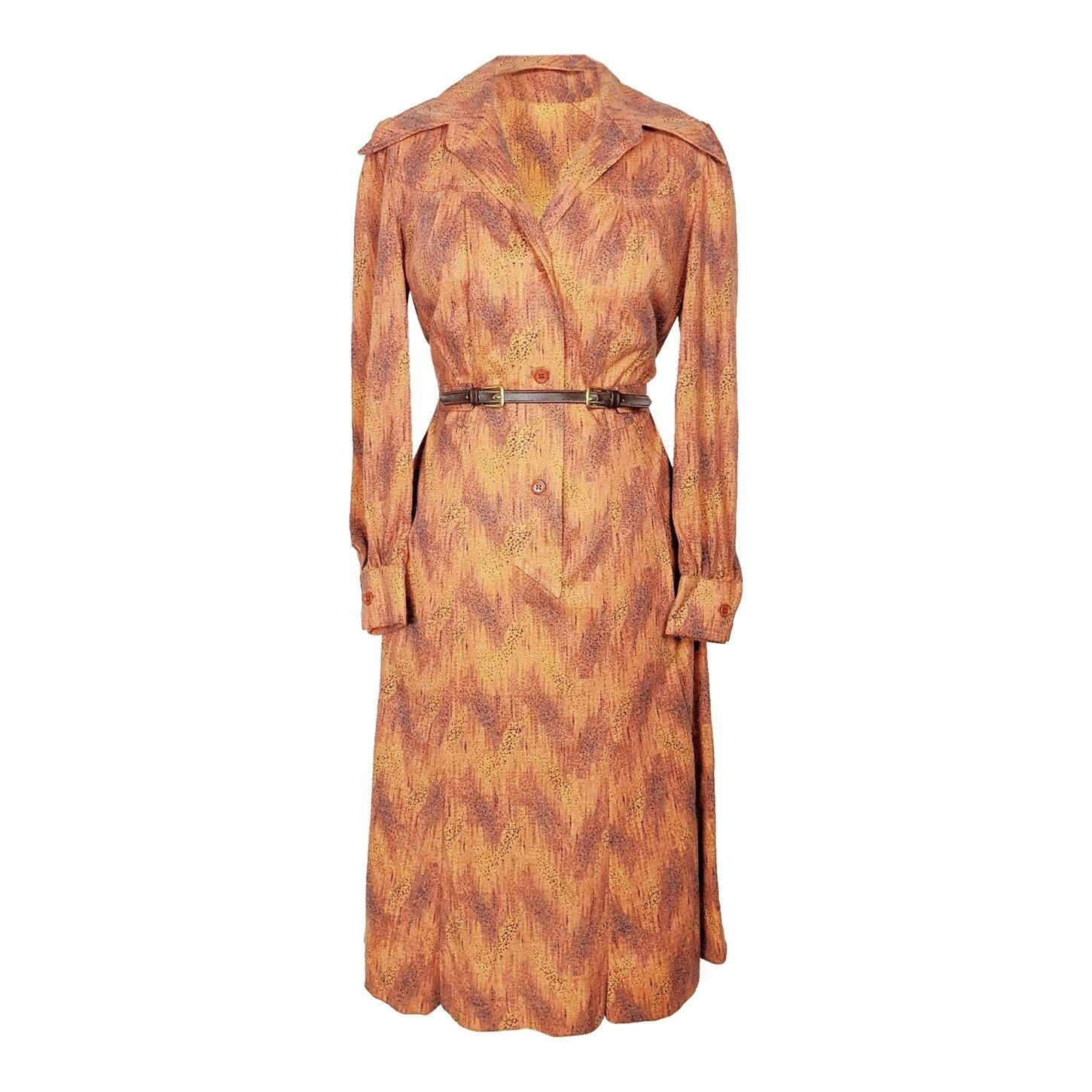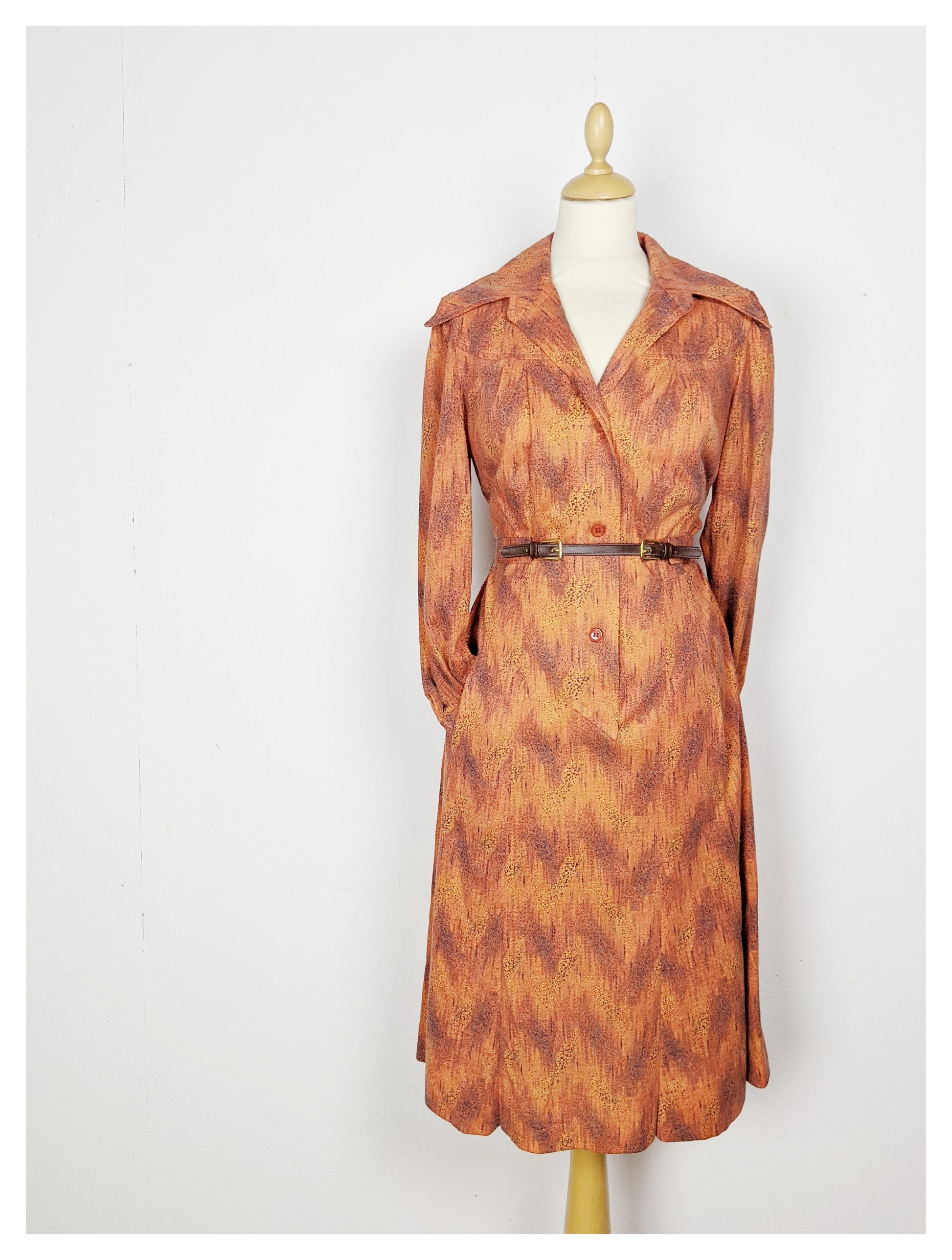 Superbe robe fluide en angora, dans les tons orangé, moutarde, noir et vert.Col cavalier et pelle à tarte. Encolure donnant sur un corsage boutonné jusqu'en dessous de la taille par trois boutons orange, finissant en pointe. Épaules légèrement froncées et manches resserrées aux poignets (chemisiers) avec un bouton orange. Empiècement au niveau des épaules avec fronçage au dessus de la poitrine pour un effet blousant. Pinces à la taille pour marquer celle ci, ainsi qu'une ceinture en tissu et similicuir et boucles dorées avec passants de chaque côté. Jupe trapèze à plusieurs pans. Deux poches invisibles à la verticale de chaque côté (au niveau de la jupe). Elle est très douce au touché.