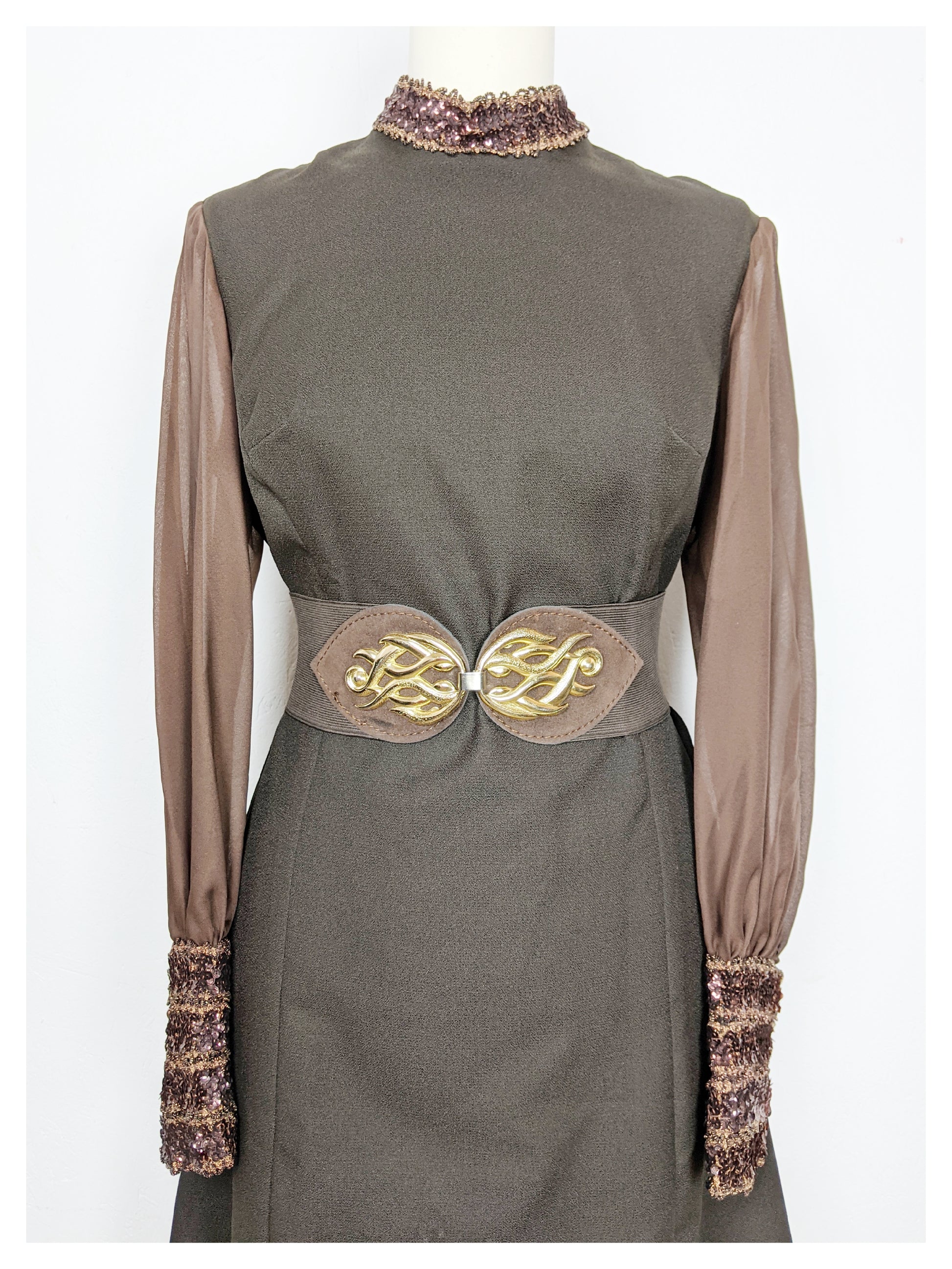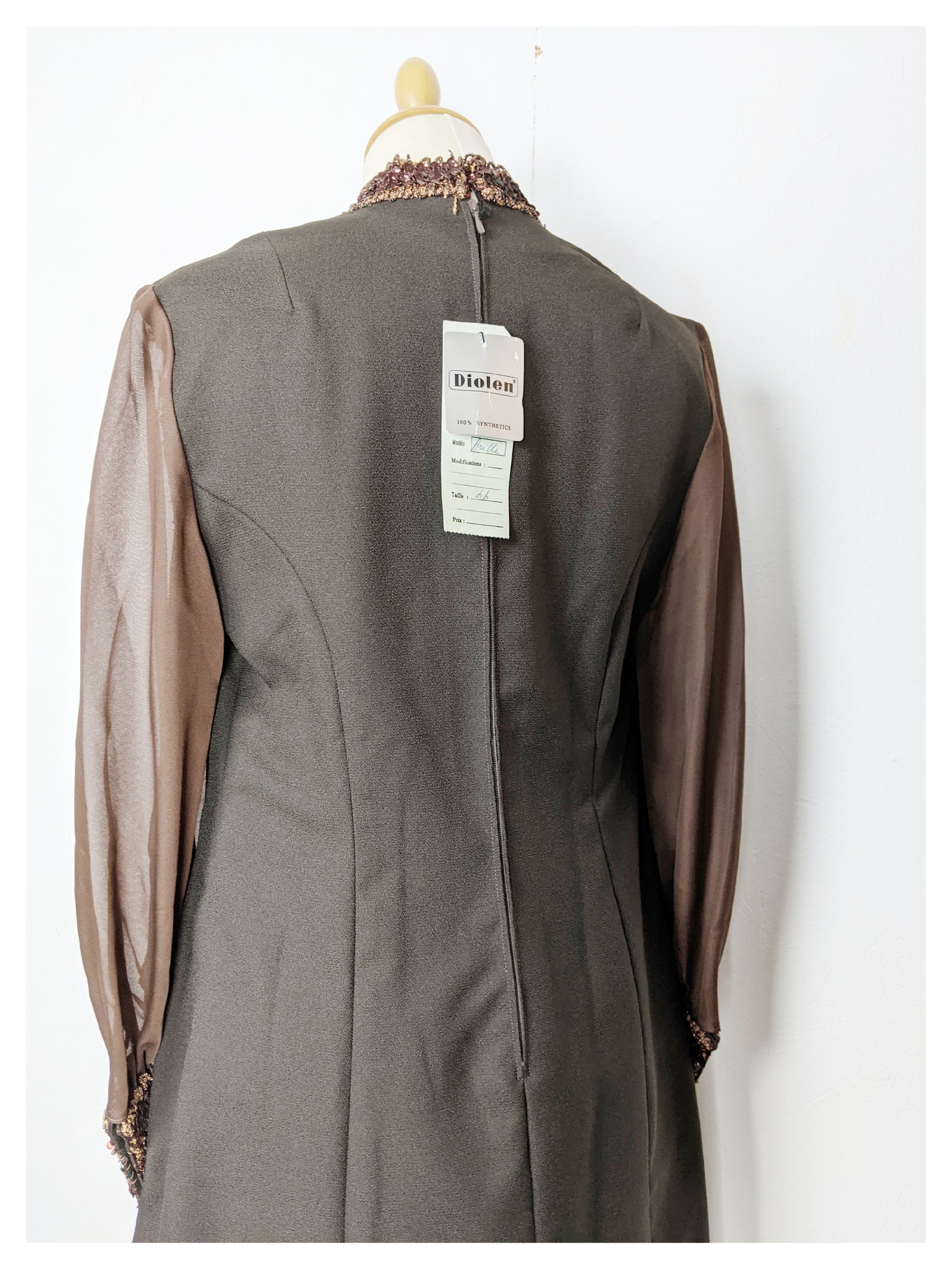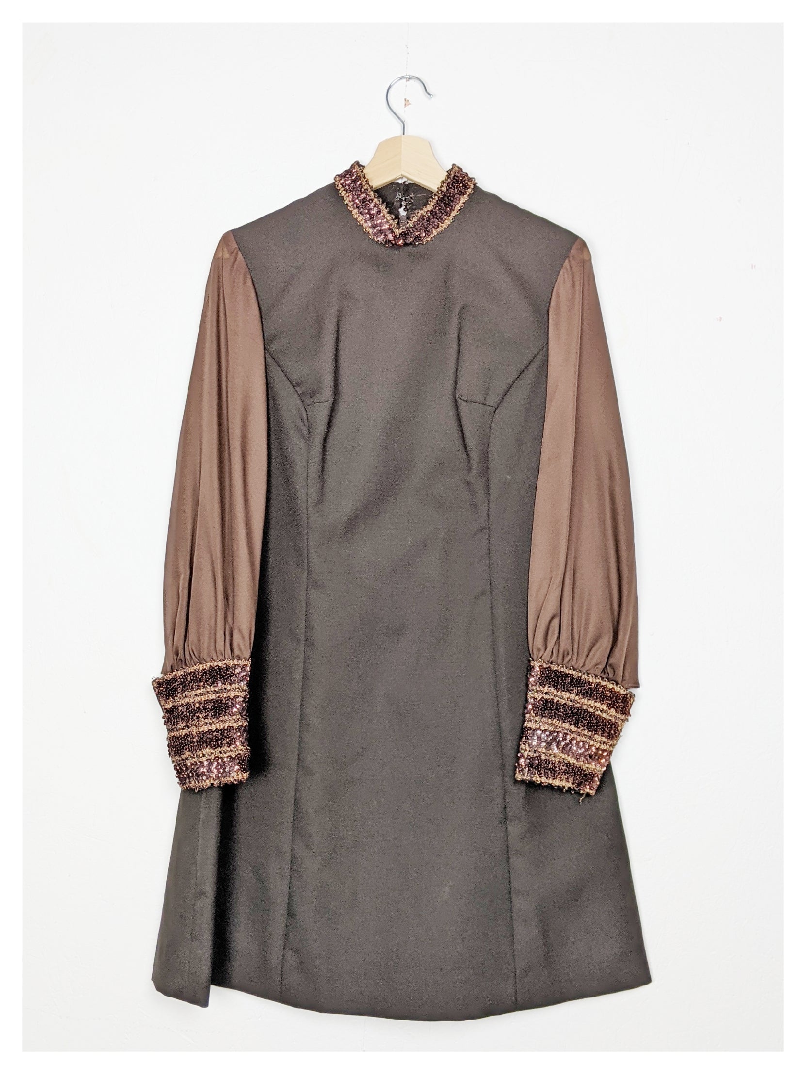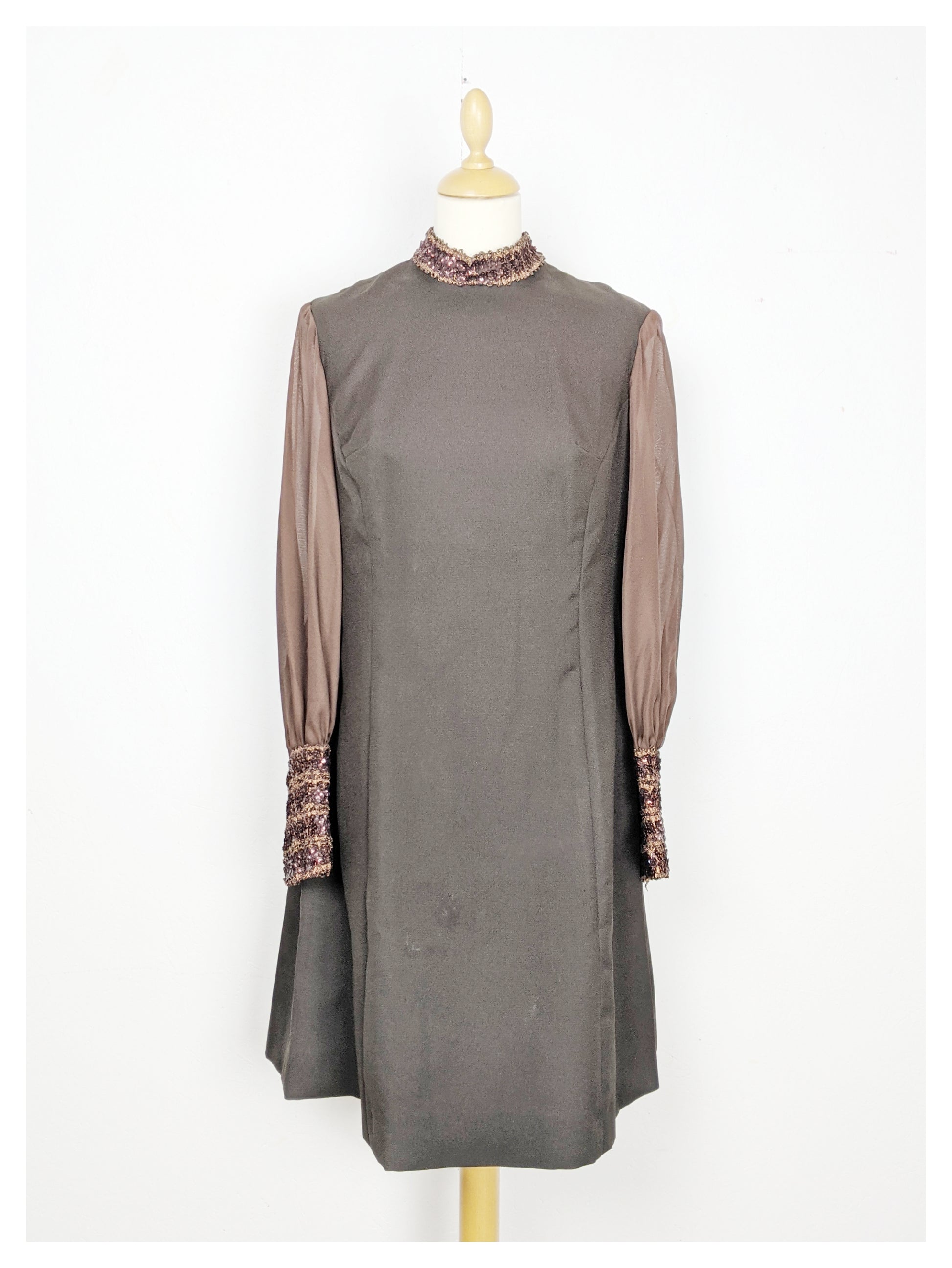 Authentique robe sixties de couleurs bruns, avec voile, sequins et perles. Col montant en passementerie, brodé de sequins et de perles. Manches longues en voile avec de magnifique poignets très larges en passementerie, brodés de sequins et de perles. Fermeture de ceux-ci grâce à 3 boutons pression intérieurs. Coupe trapèze avec des pinces à la poitrine. Longueur genoux. Fermeture éclaire dans le dos terminé par une agrafe au col. Digne d'être portée dans la série Mad Men !