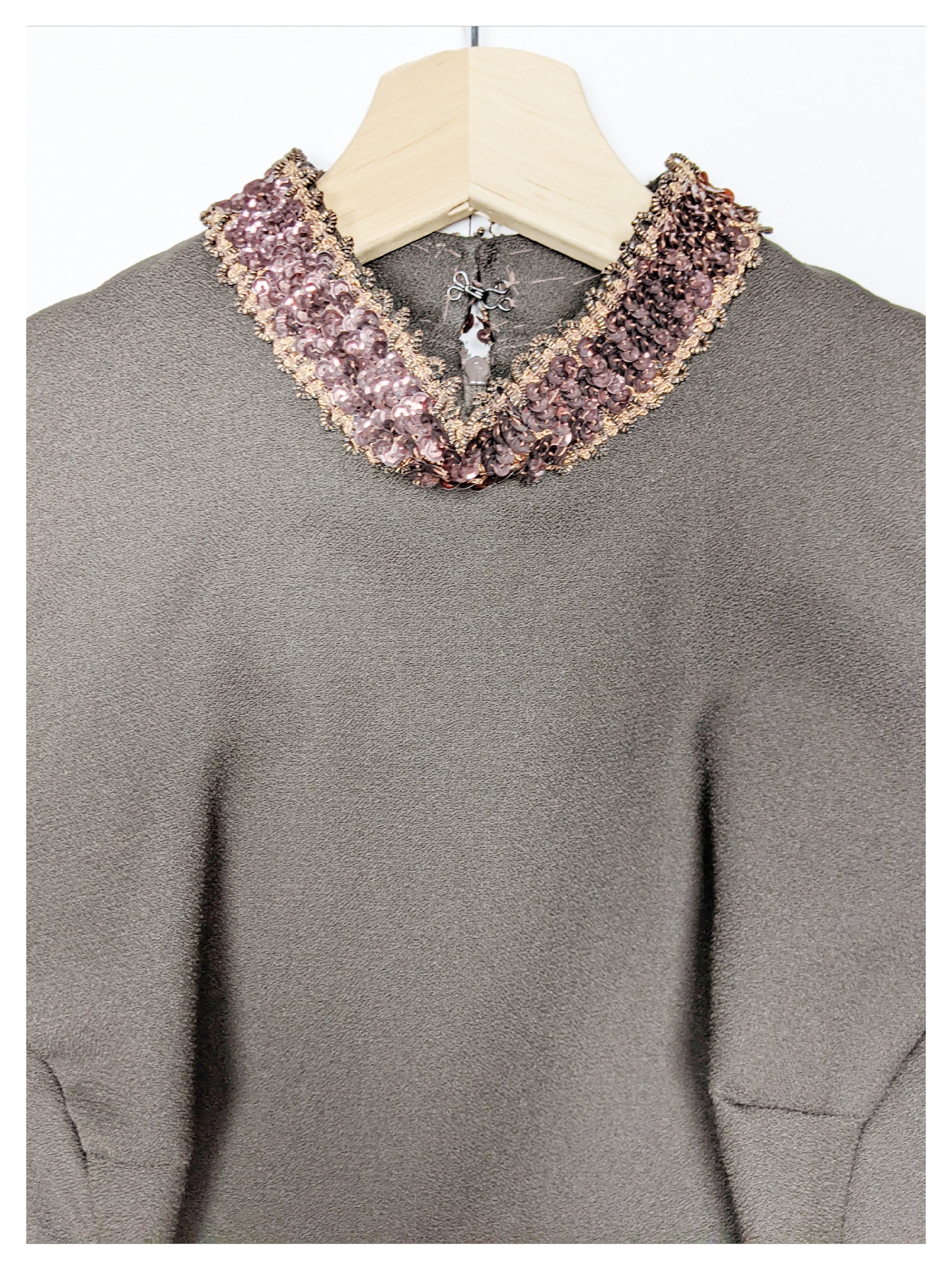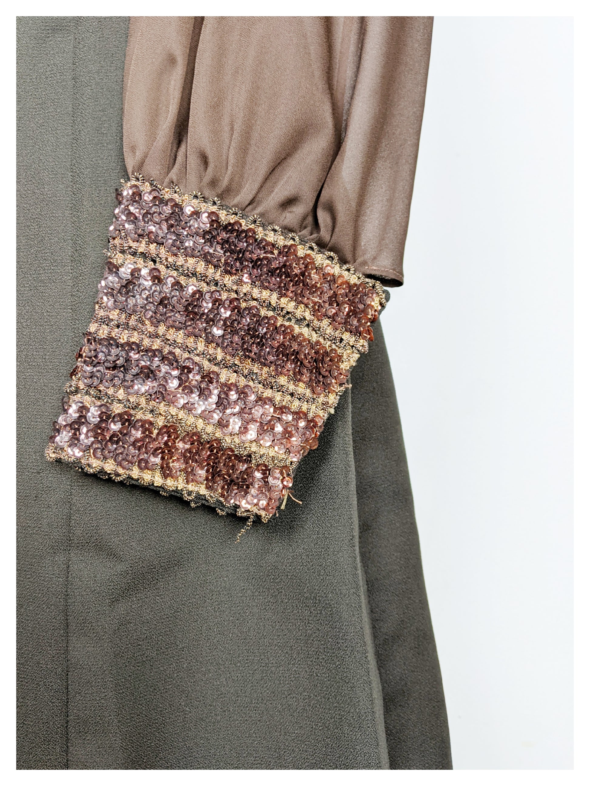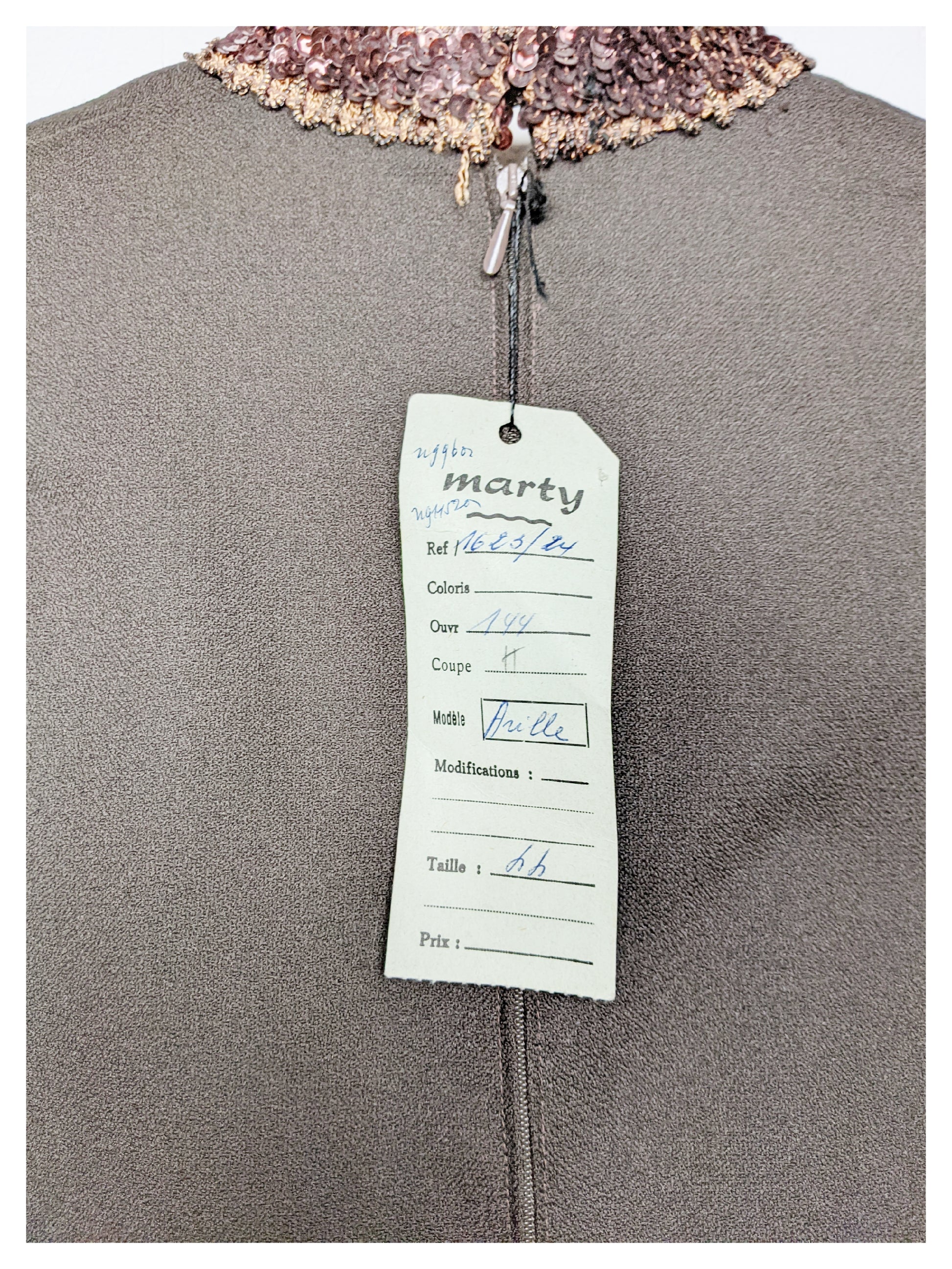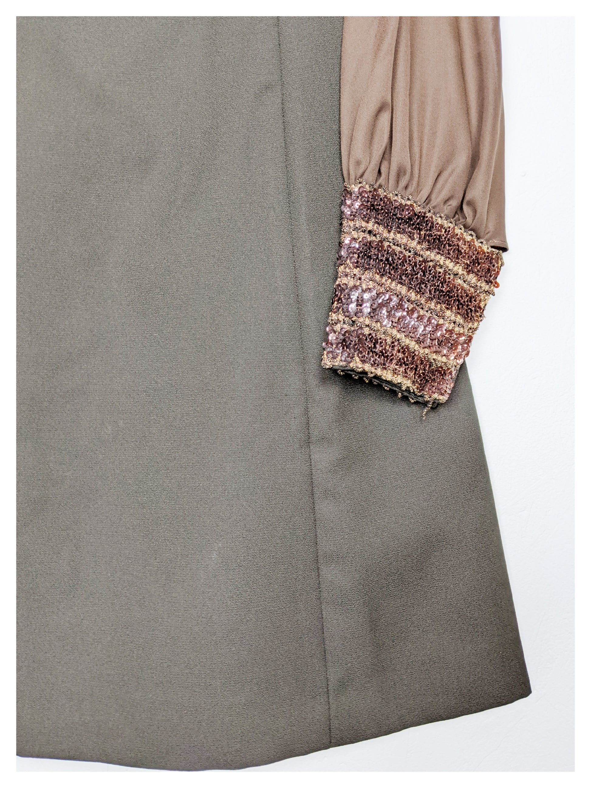 Authentique robe sixties de couleurs bruns, avec voile, sequins et perles. Col montant en passementerie, brodé de sequins et de perles. Manches longues en voile avec de magnifique poignets très larges en passementerie, brodés de sequins et de perles. Fermeture de ceux-ci grâce à 3 boutons pression intérieurs. Coupe trapèze avec des pinces à la poitrine. Longueur genoux. Fermeture éclaire dans le dos terminé par une agrafe au col. Digne d'être portée dans la série Mad Men !