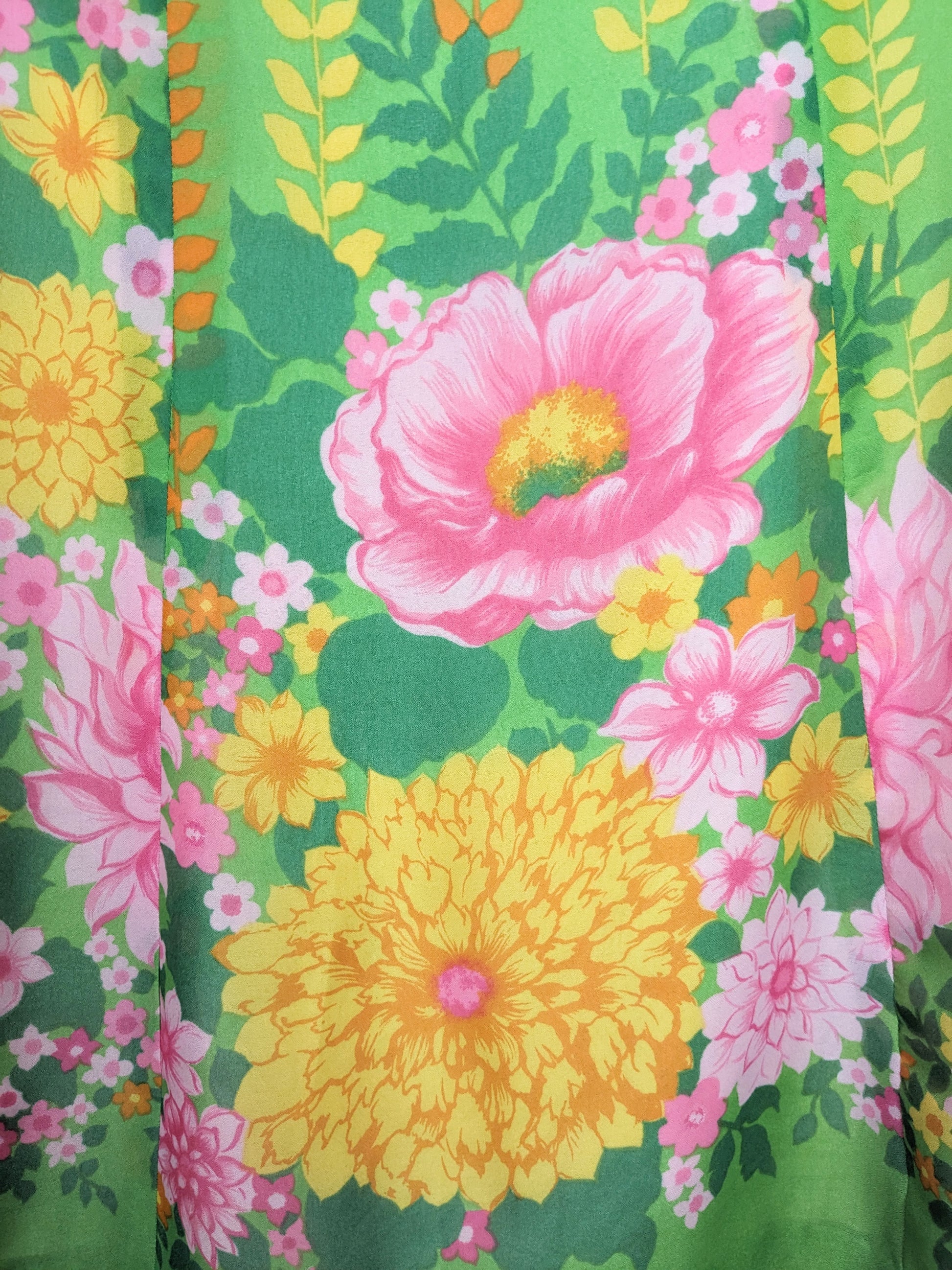Jolie robe en voile, entièrement doublée, vert pomme avec motifs de feuilles et fleurs dans les tons jaune, orange, rose et fuchsia. Encolure arrondie avec biais, un volant sur tout le pourture du col. Petites manches à volants Corsage légèrement cintrée, avec la robe qui finit en trapèze. Fermture éclaire à l'arrière avec une agraffe pour permettre une bonne tenue de la robe.