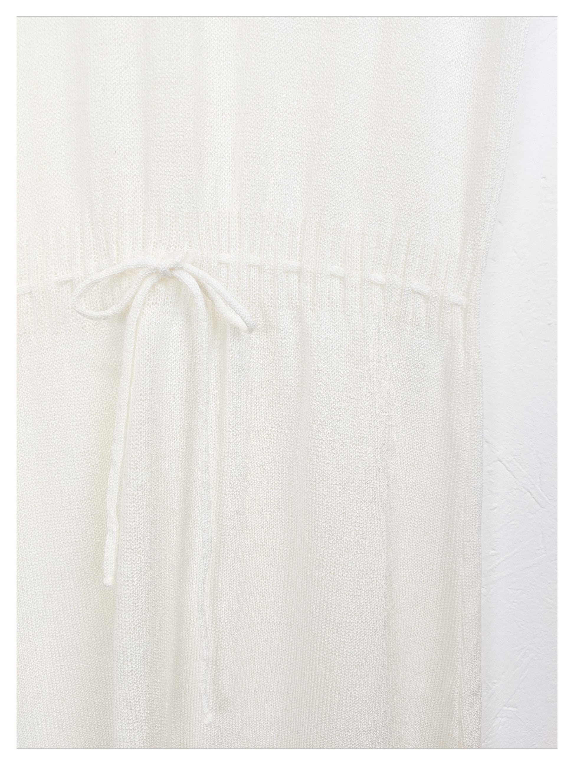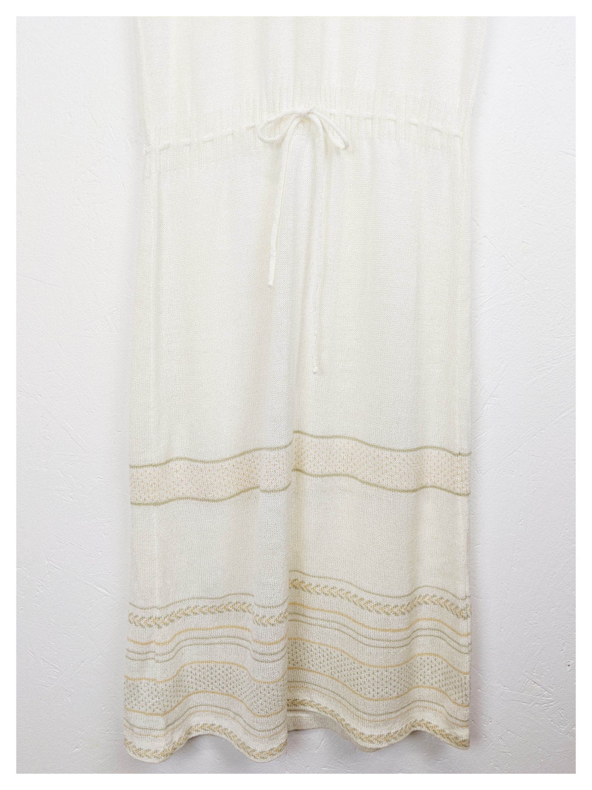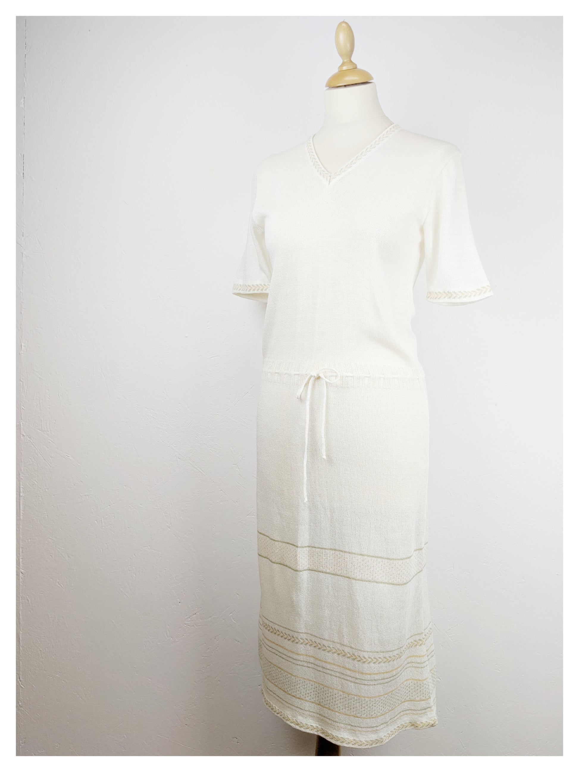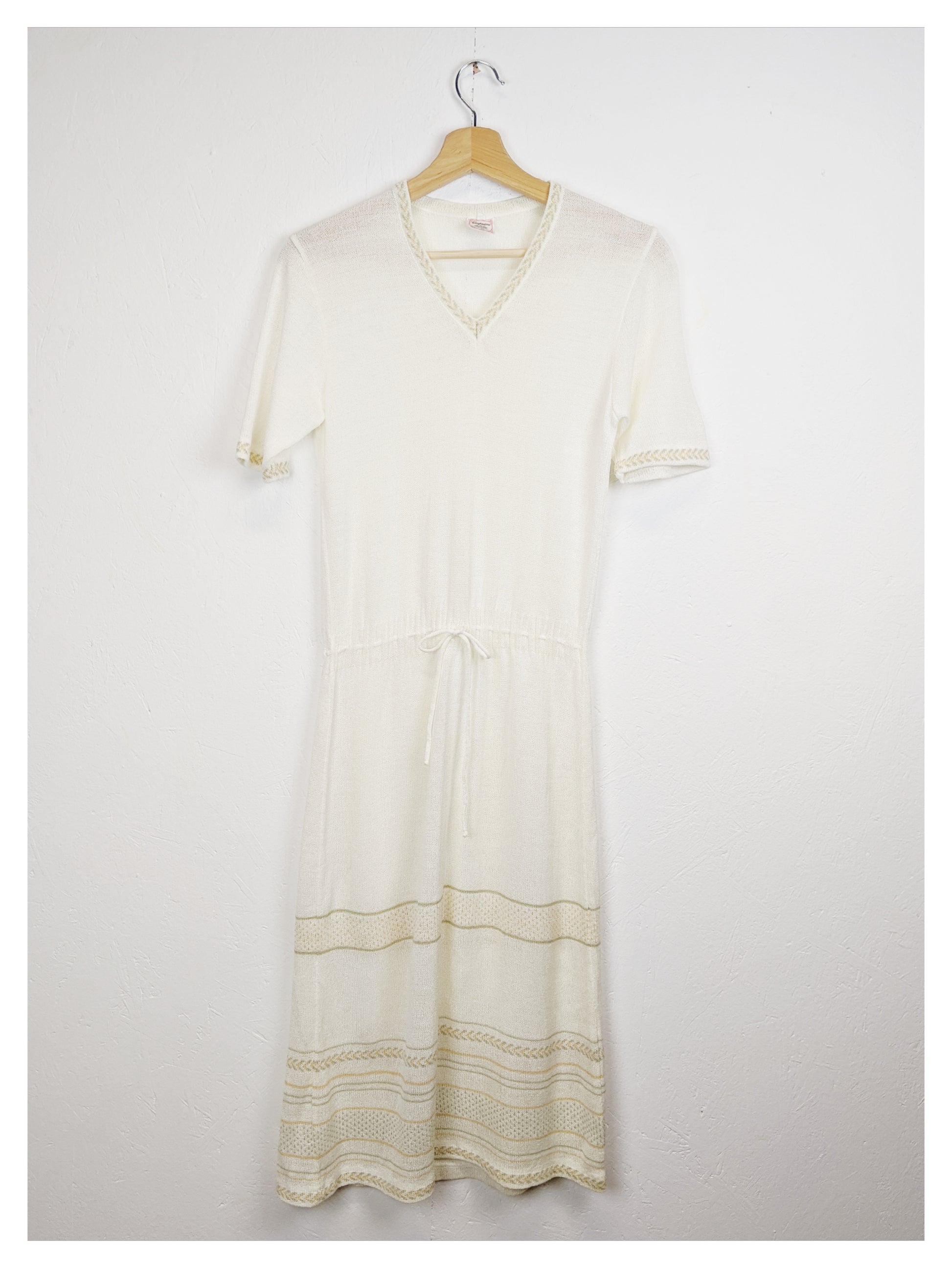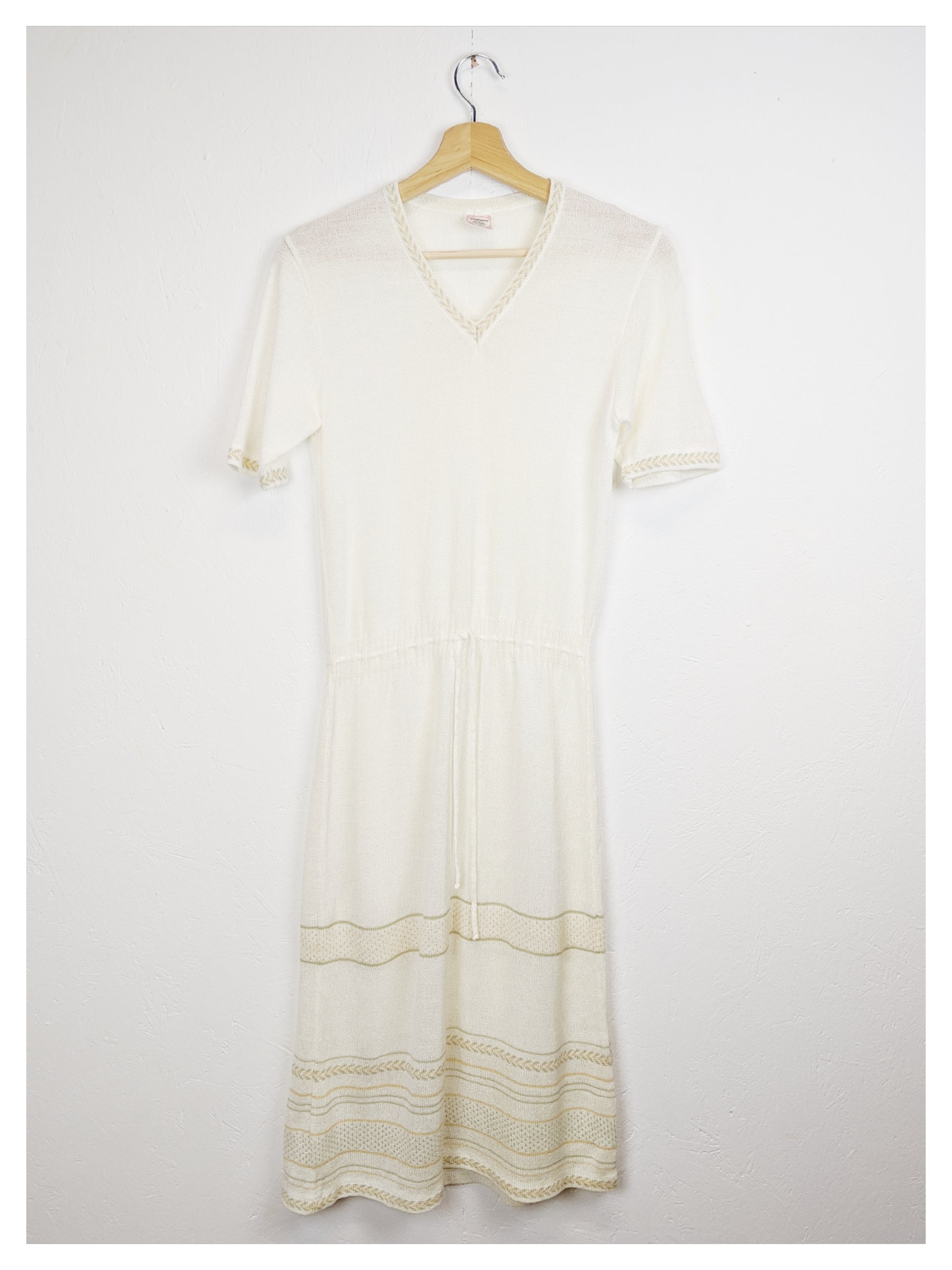 Jolie robe en tricot dans les ton crème, kaki et orange clair. Col en V, manches courtes. Taille ceinturée avec un petit cordon, dans des mailles en côte. Jupe droite. Longueur midi. Tissu légèrement extensible.