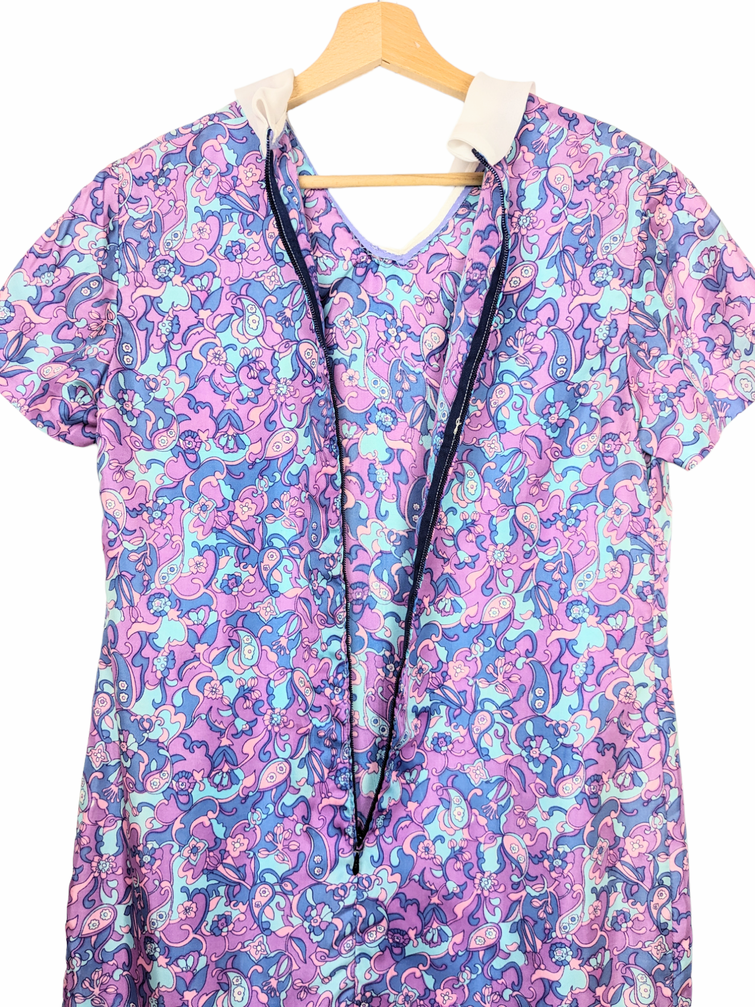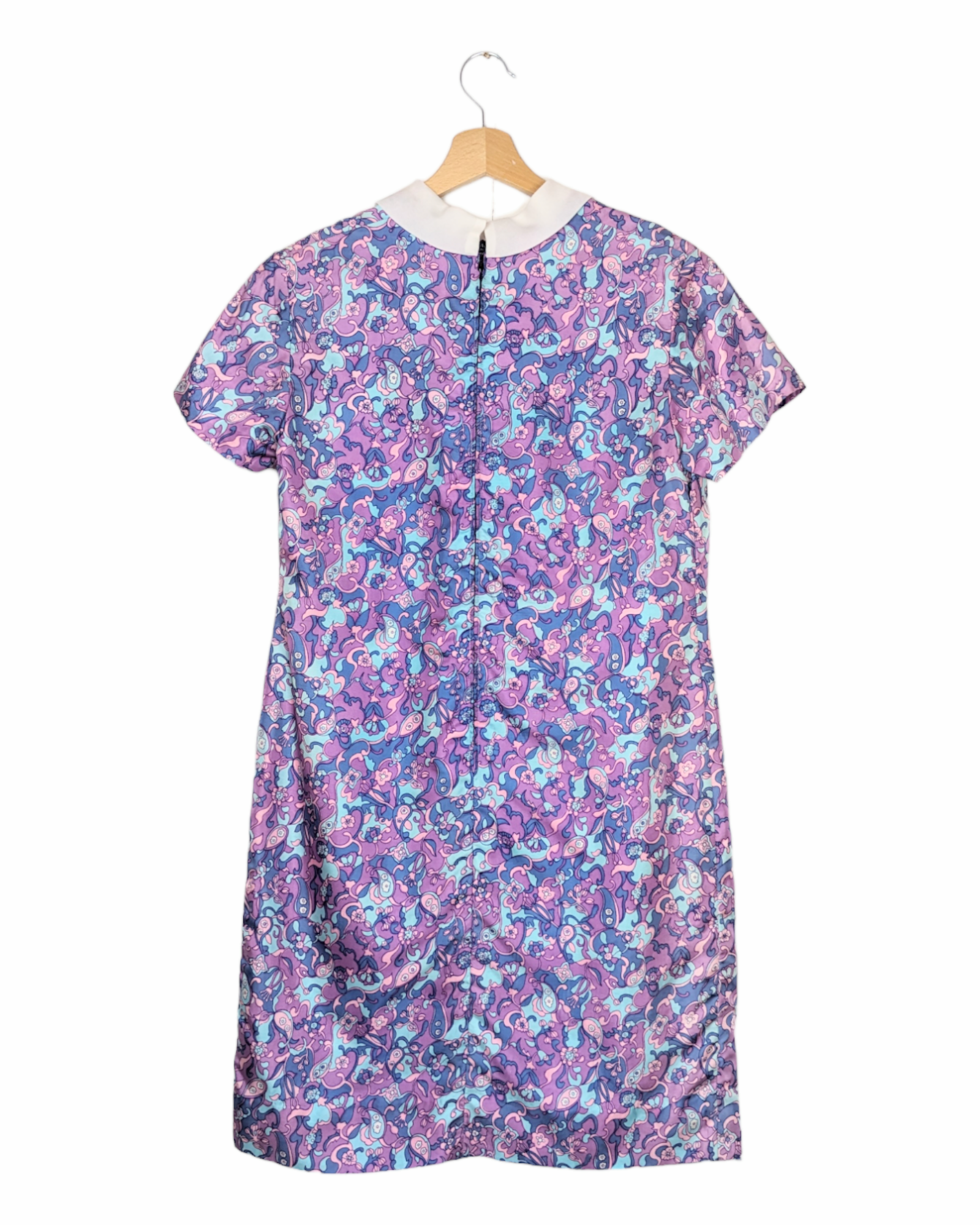Robe "chasuble" dans un tissu fluide dans les tons mauve, bleu et rose. Col foulard blanc à nouer. Manches courtes. Pinces à la poitrine. Coupe plus ou moins droite. Fermture éclaire dans le dos.