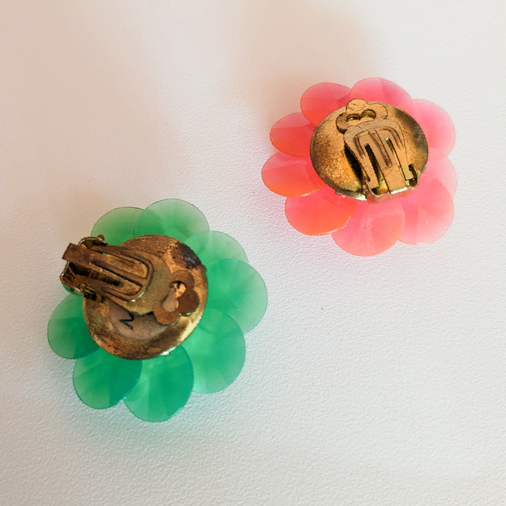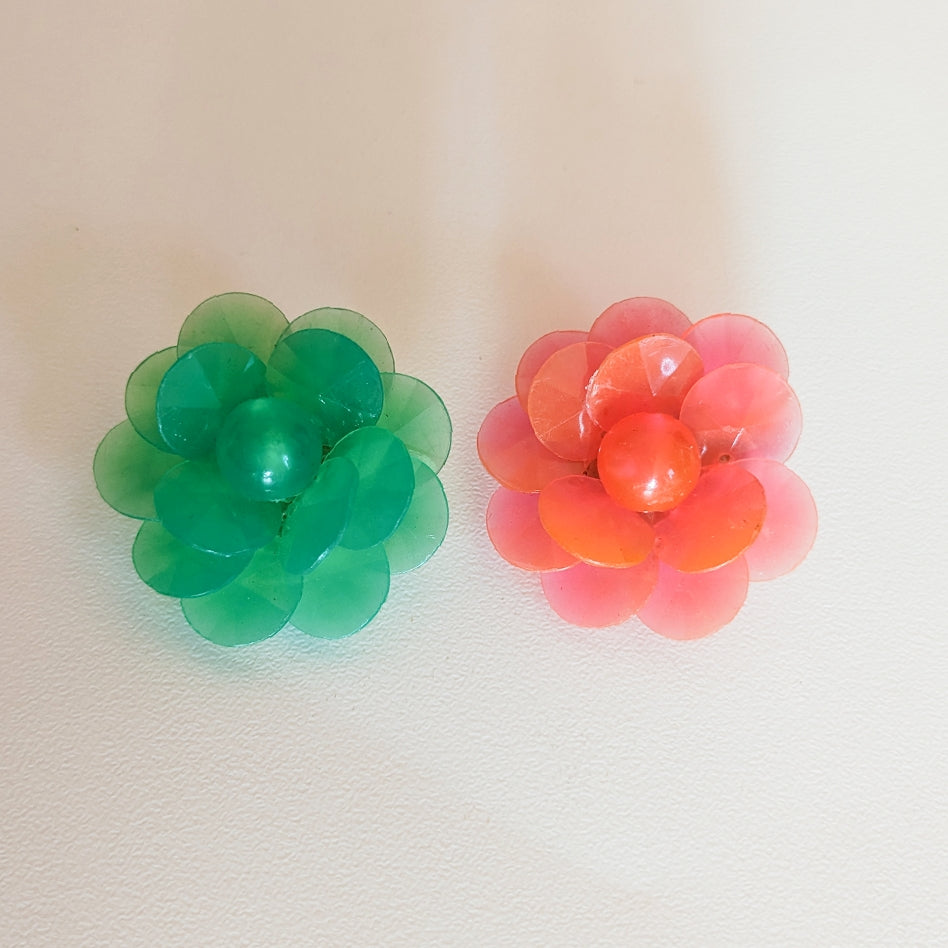 Boucles d'oreilles clips, ronde, fleurs à gros sequins oranges. En plastique. Bicolore vert et orange.