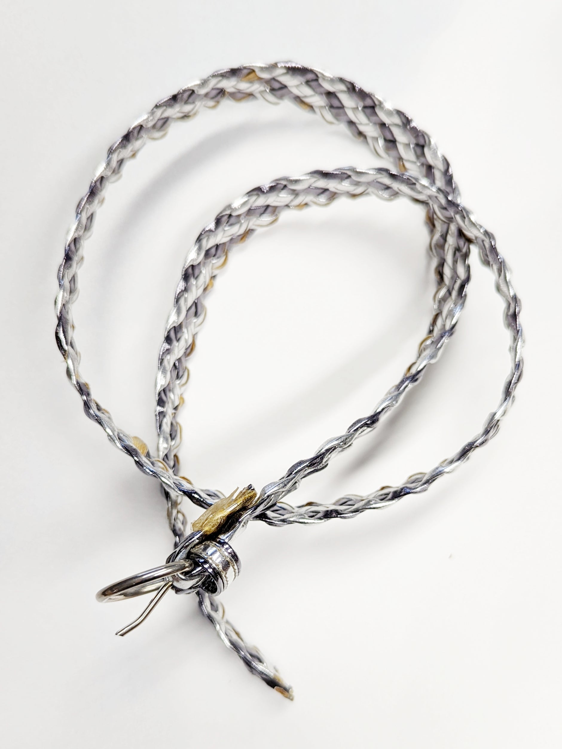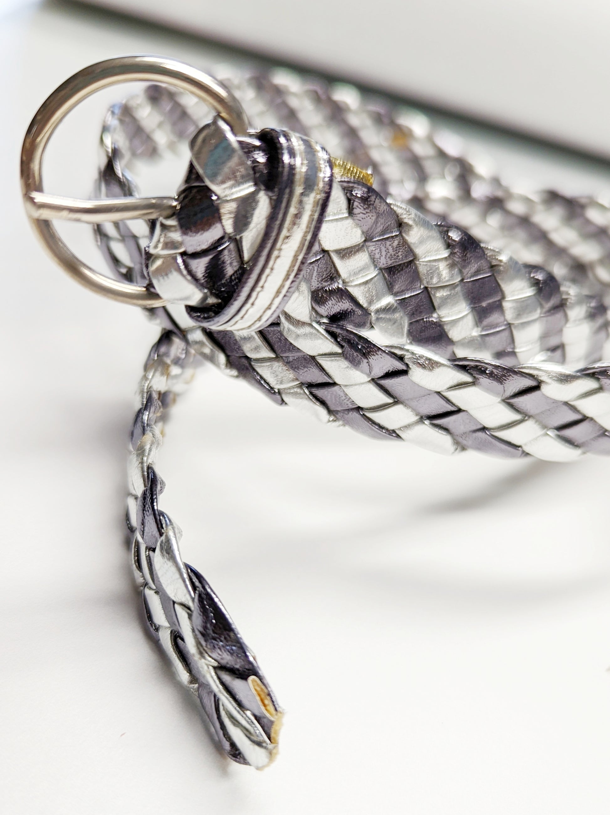 Très jolie ceinture en cuir tressé dans les tons gris argenté. Petite boucle ronde argentée, avec lichette. Elle n'a jamais été portée, juste magnifique !