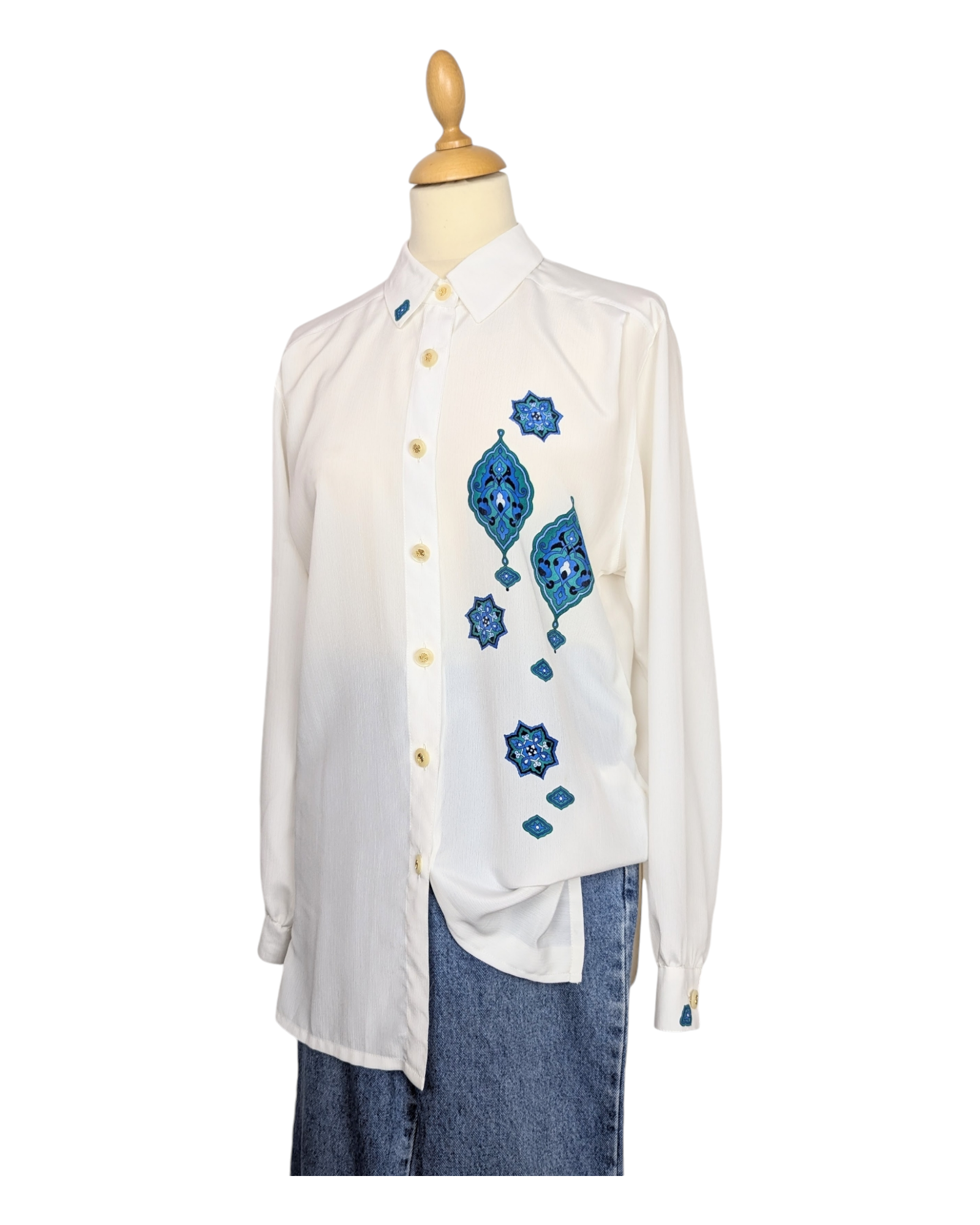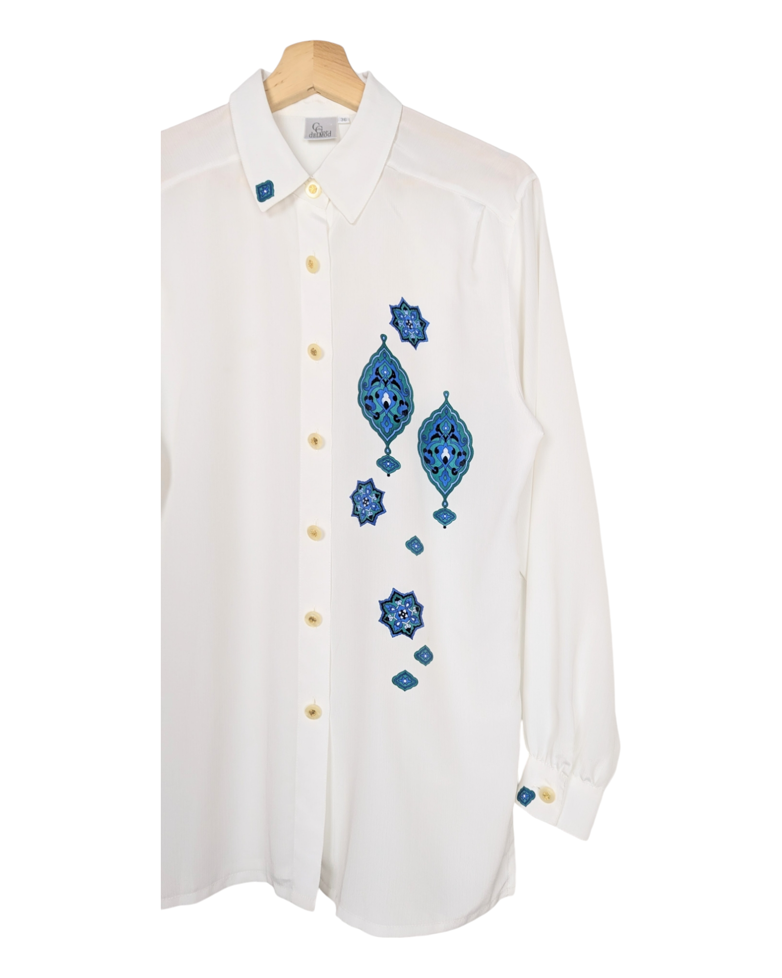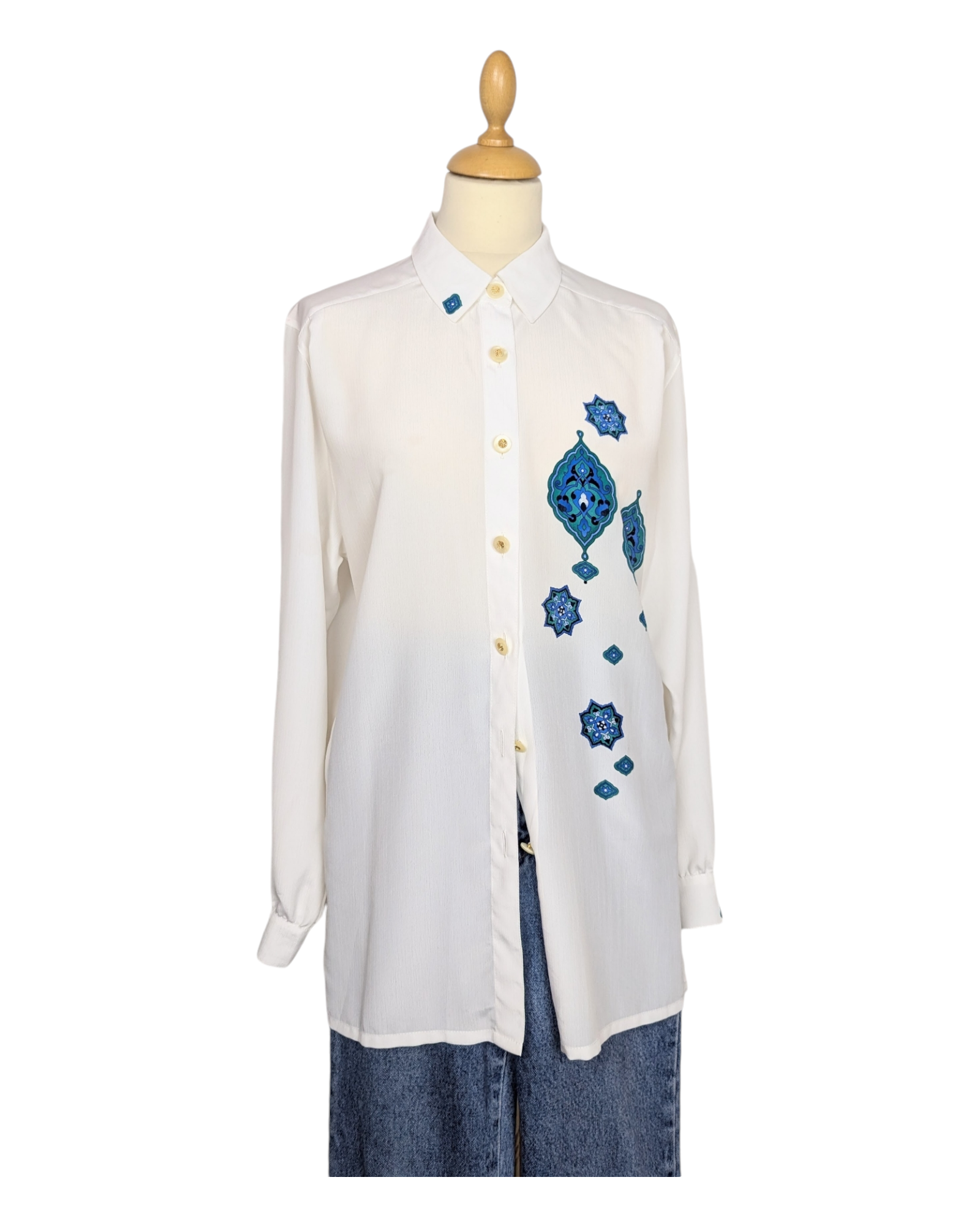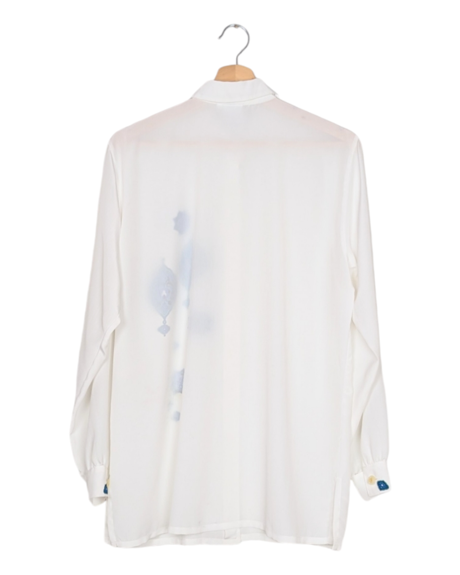 Chemise fluide, blanc avec motifs "talisman". Légèrement transparente. Col chemisier. Boutonnée sur le devant avec jolis boutons. Assez longue. Coupe droite.