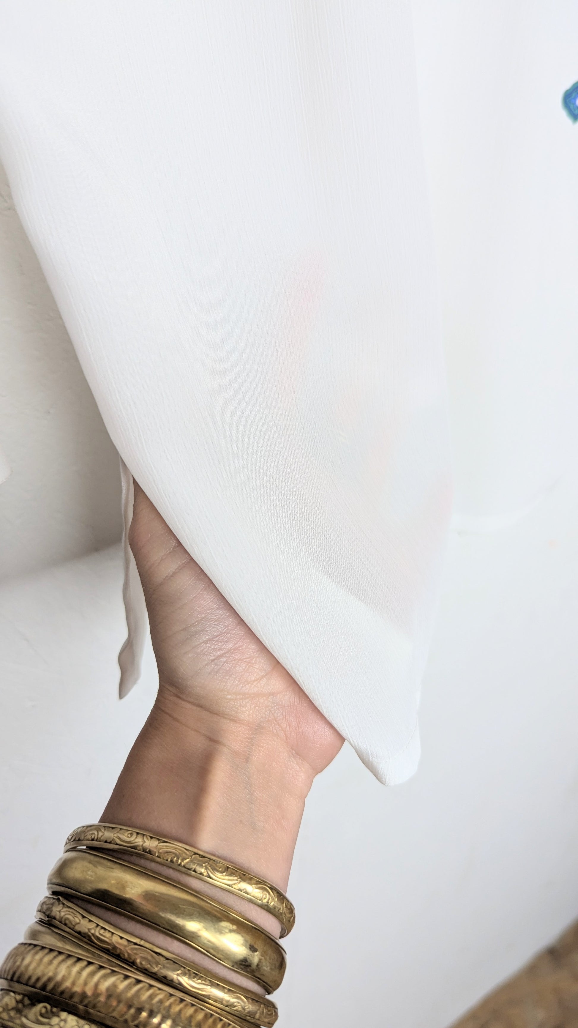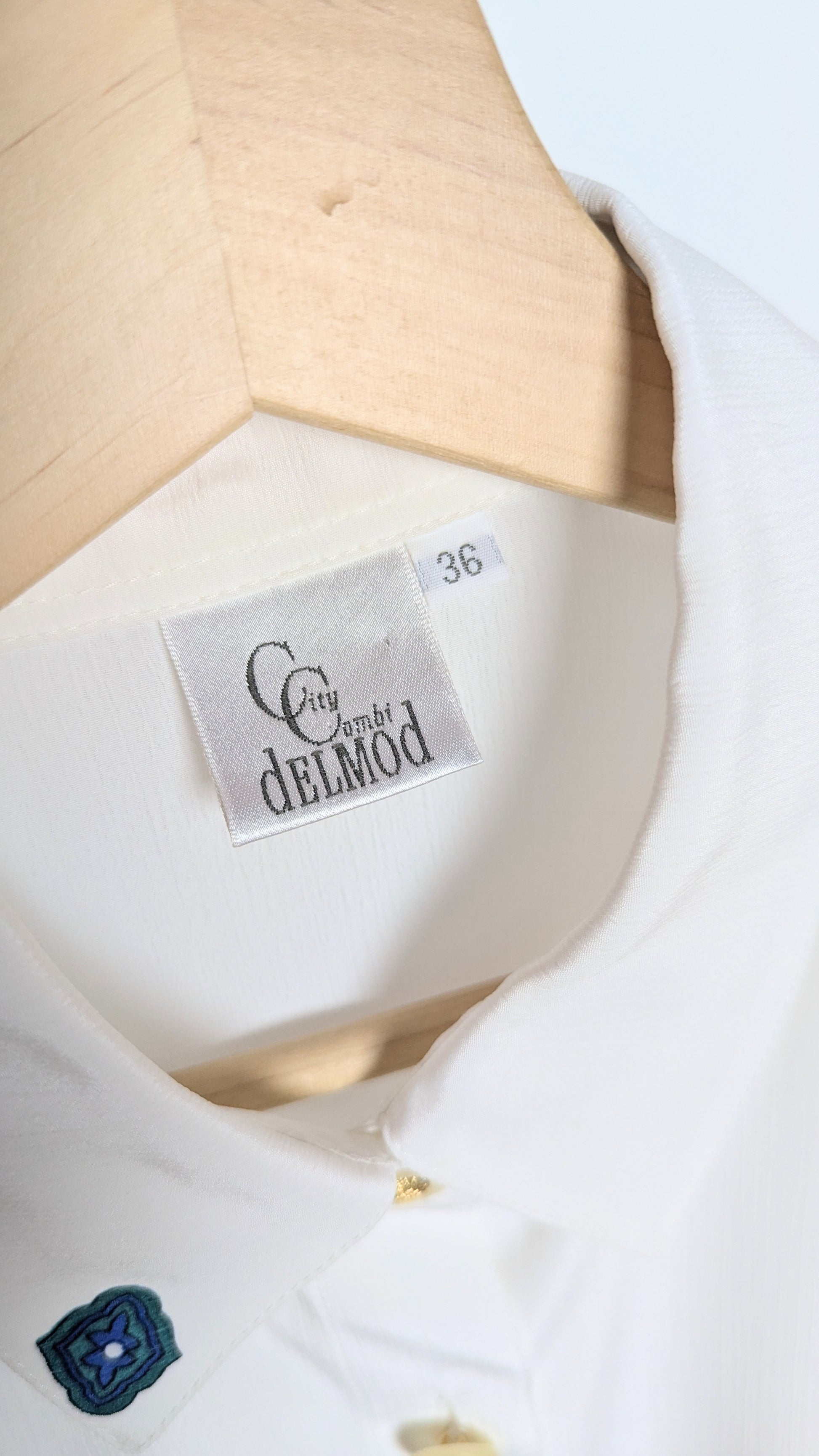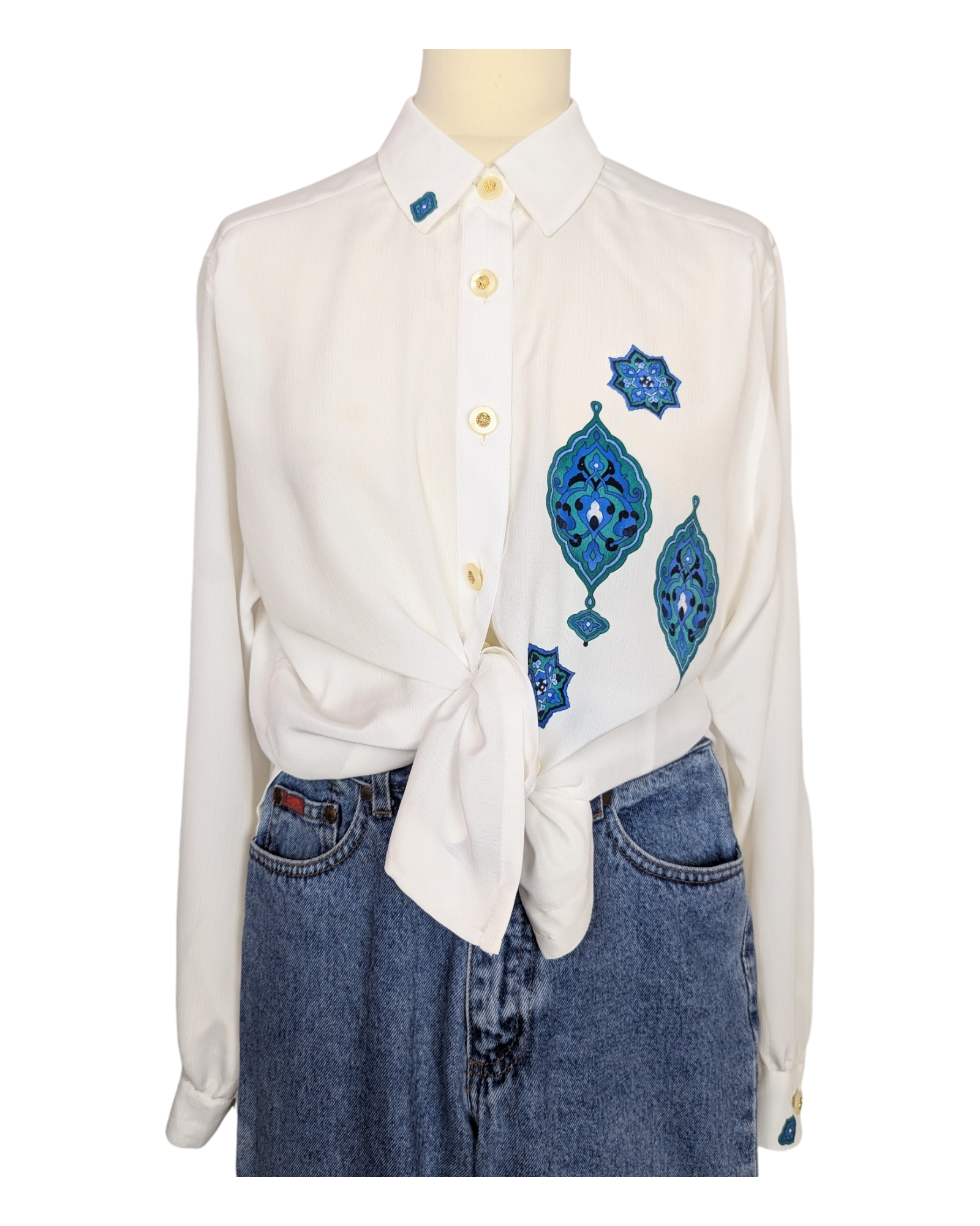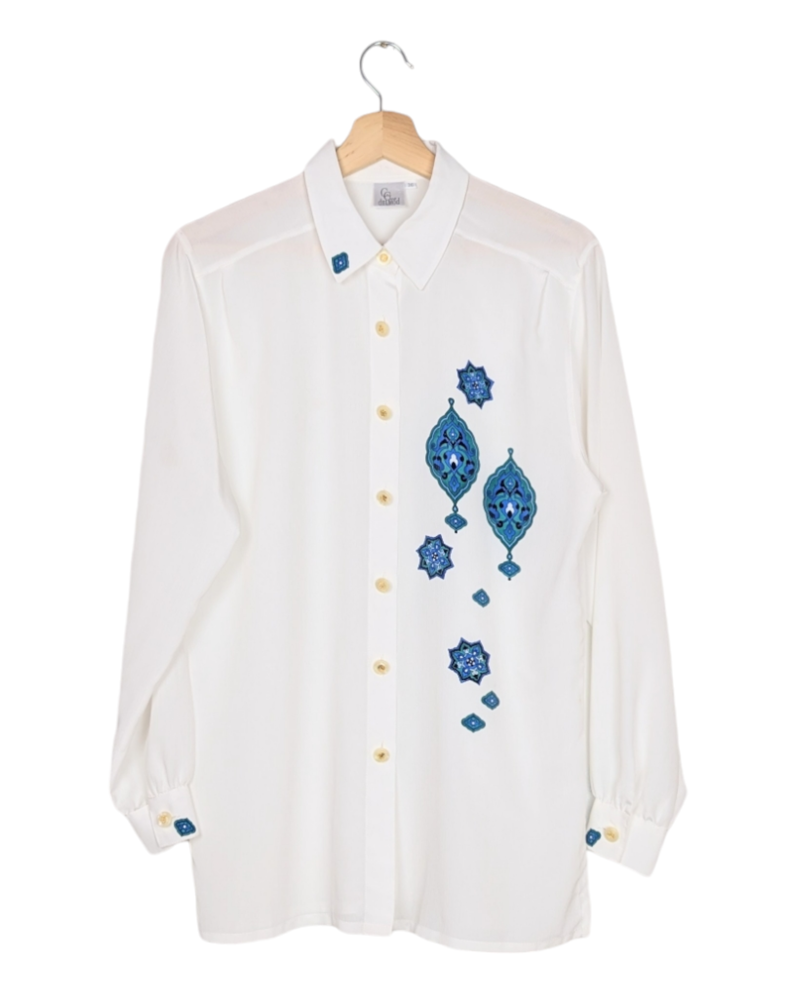 Chemise fluide, blanc avec motifs "talisman". Légèrement transparente. Col chemisier. Boutonnée sur le devant avec jolis boutons. Assez longue. Coupe droite.