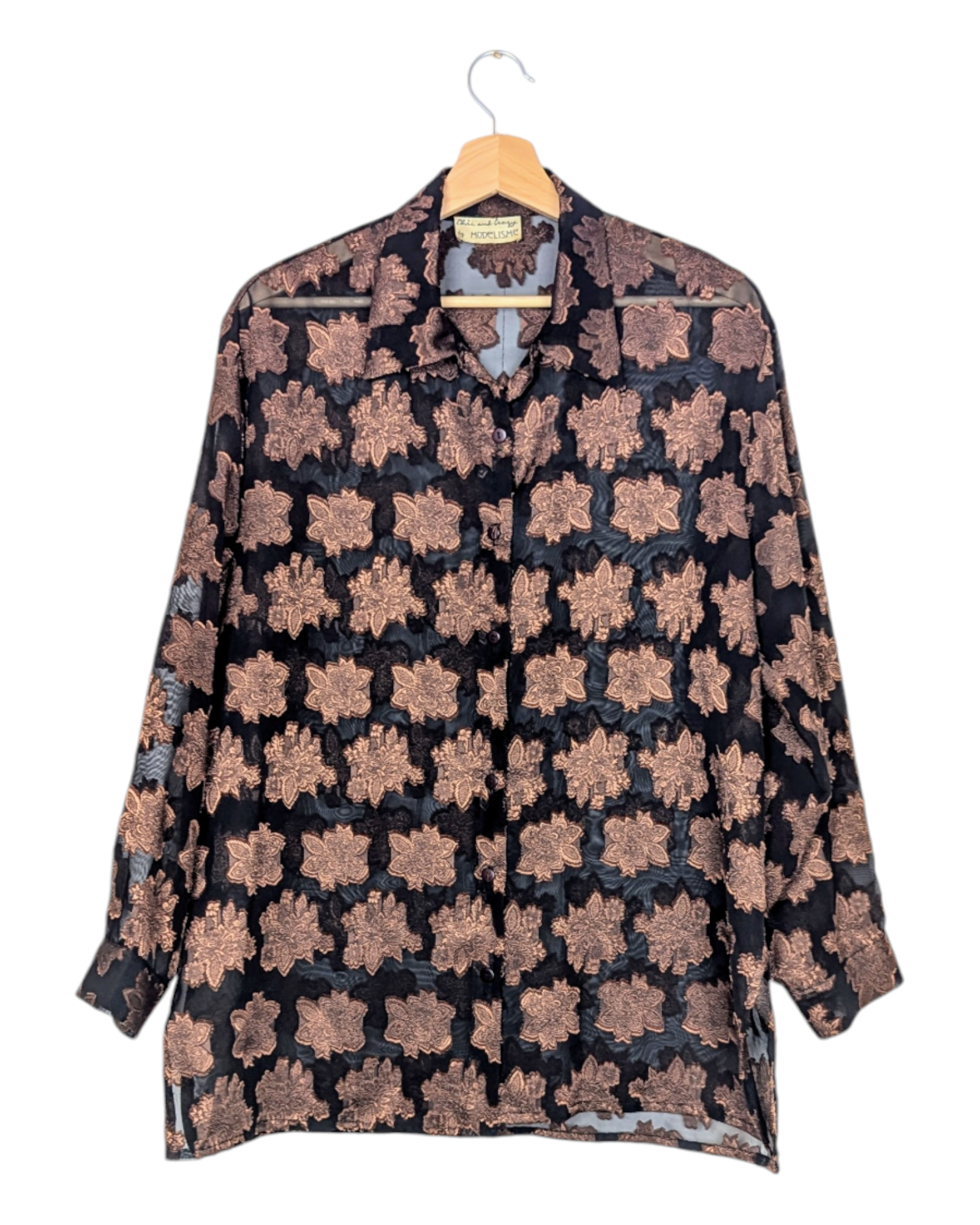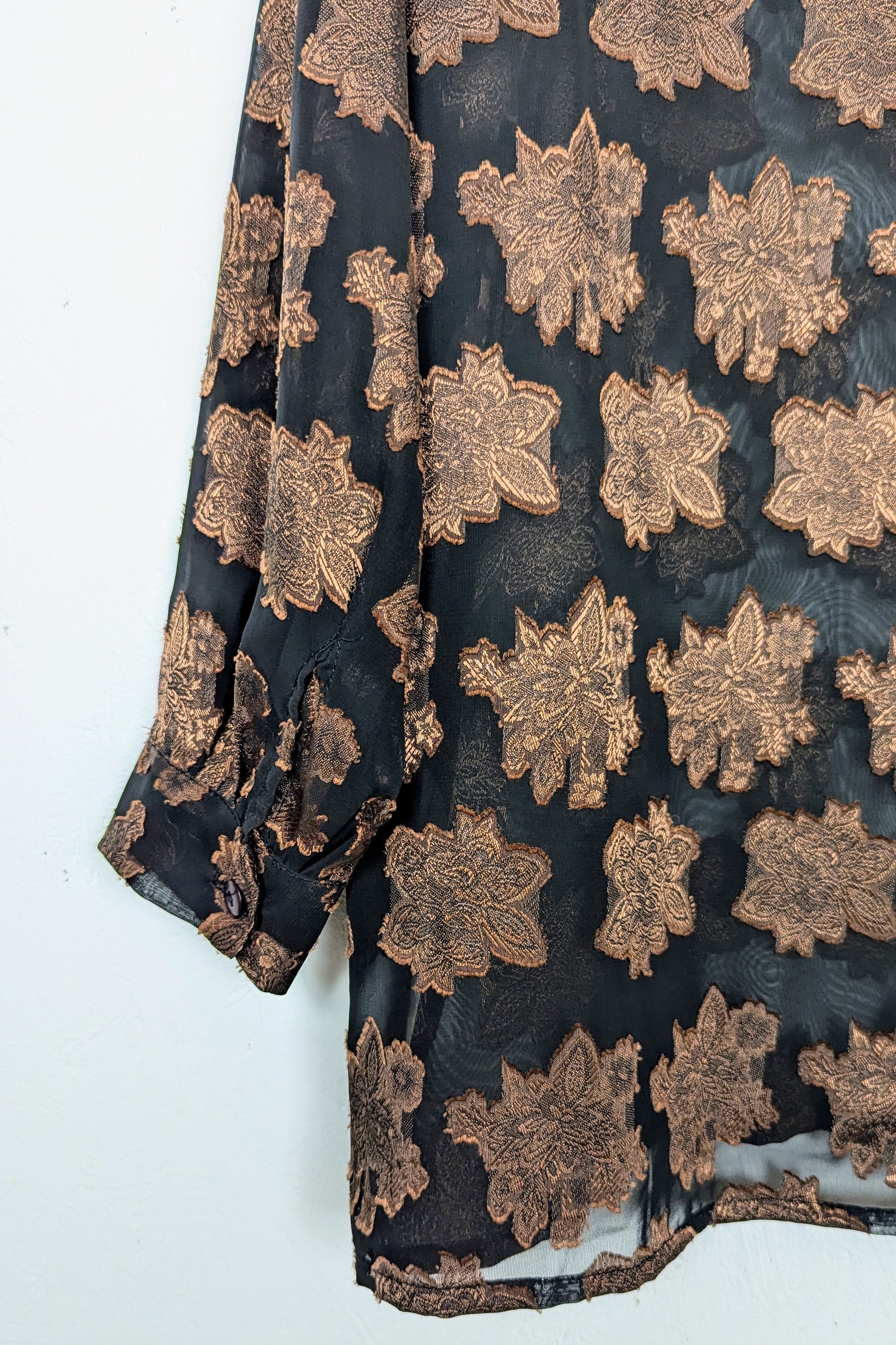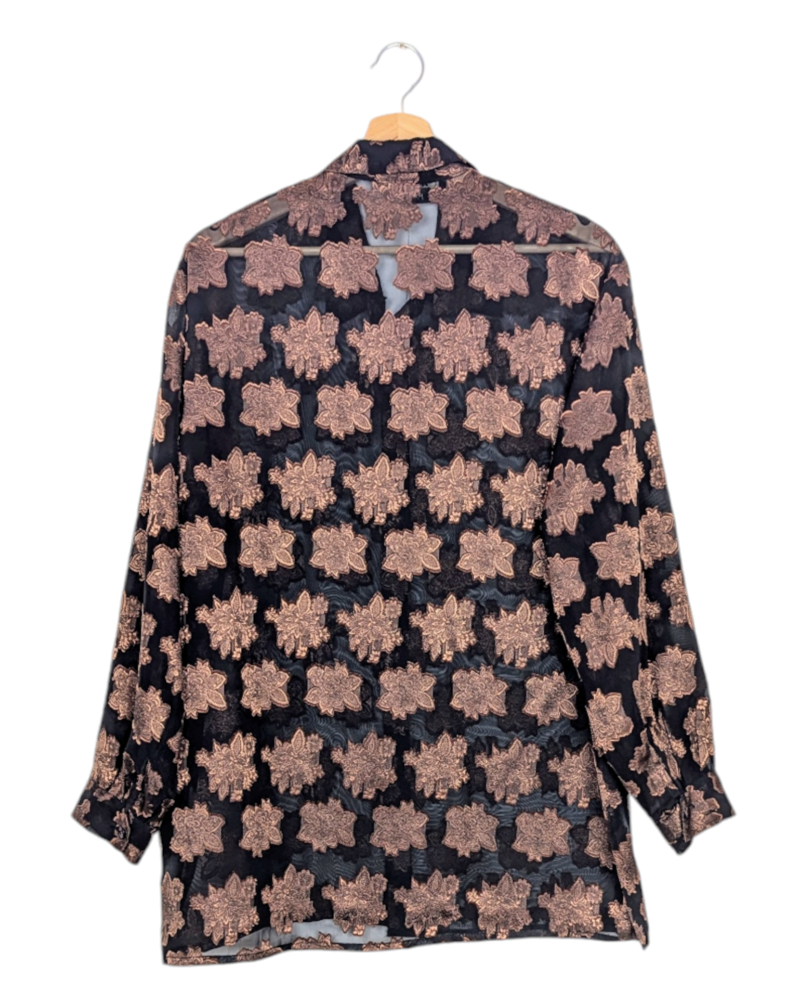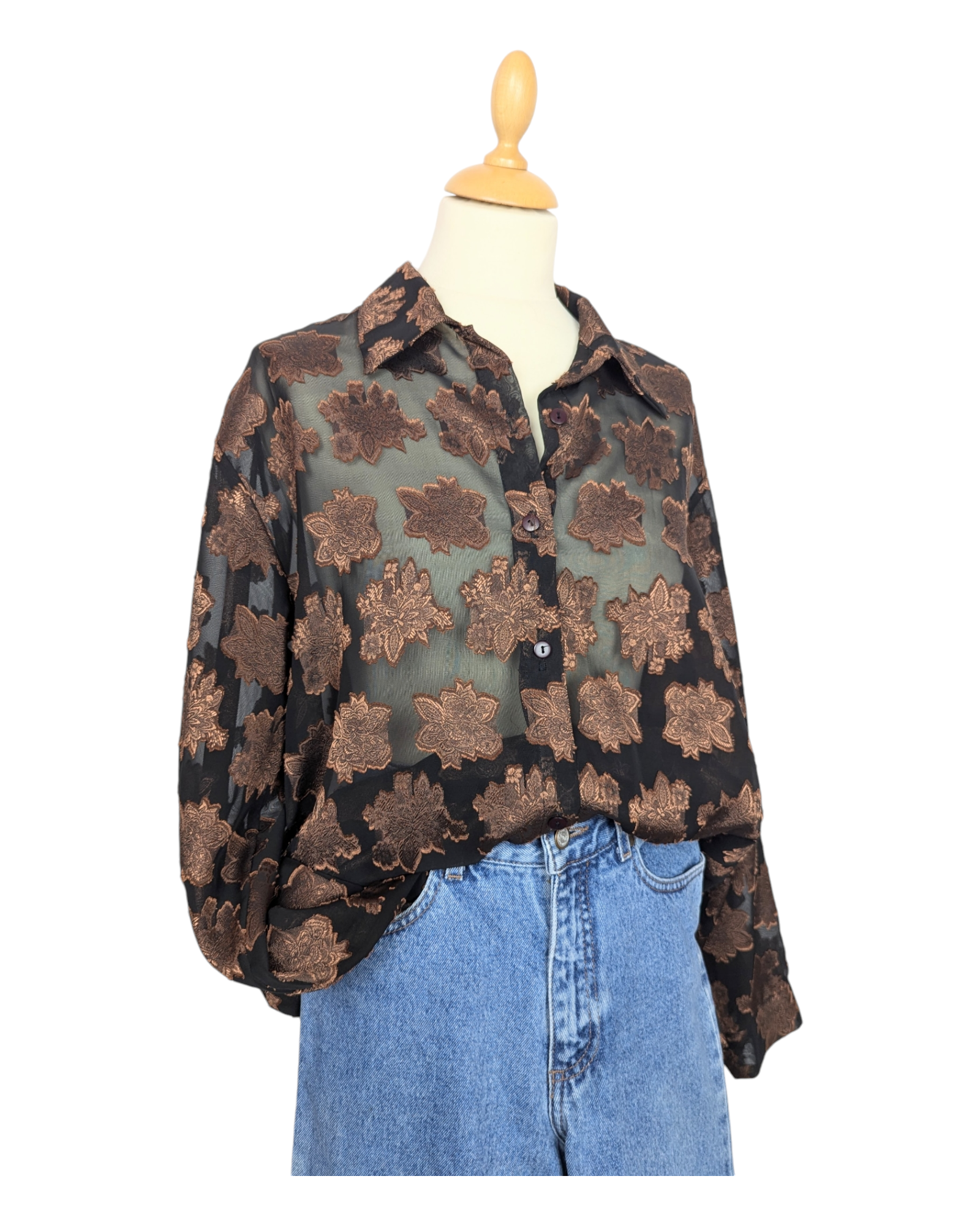 Chemise fluide, voile transparent noir avec feuilles brunes irrisées. Col chemisier. Boutonnée sur le devant avec, fendues sur les côtés. Assez longue. Coupe droite.