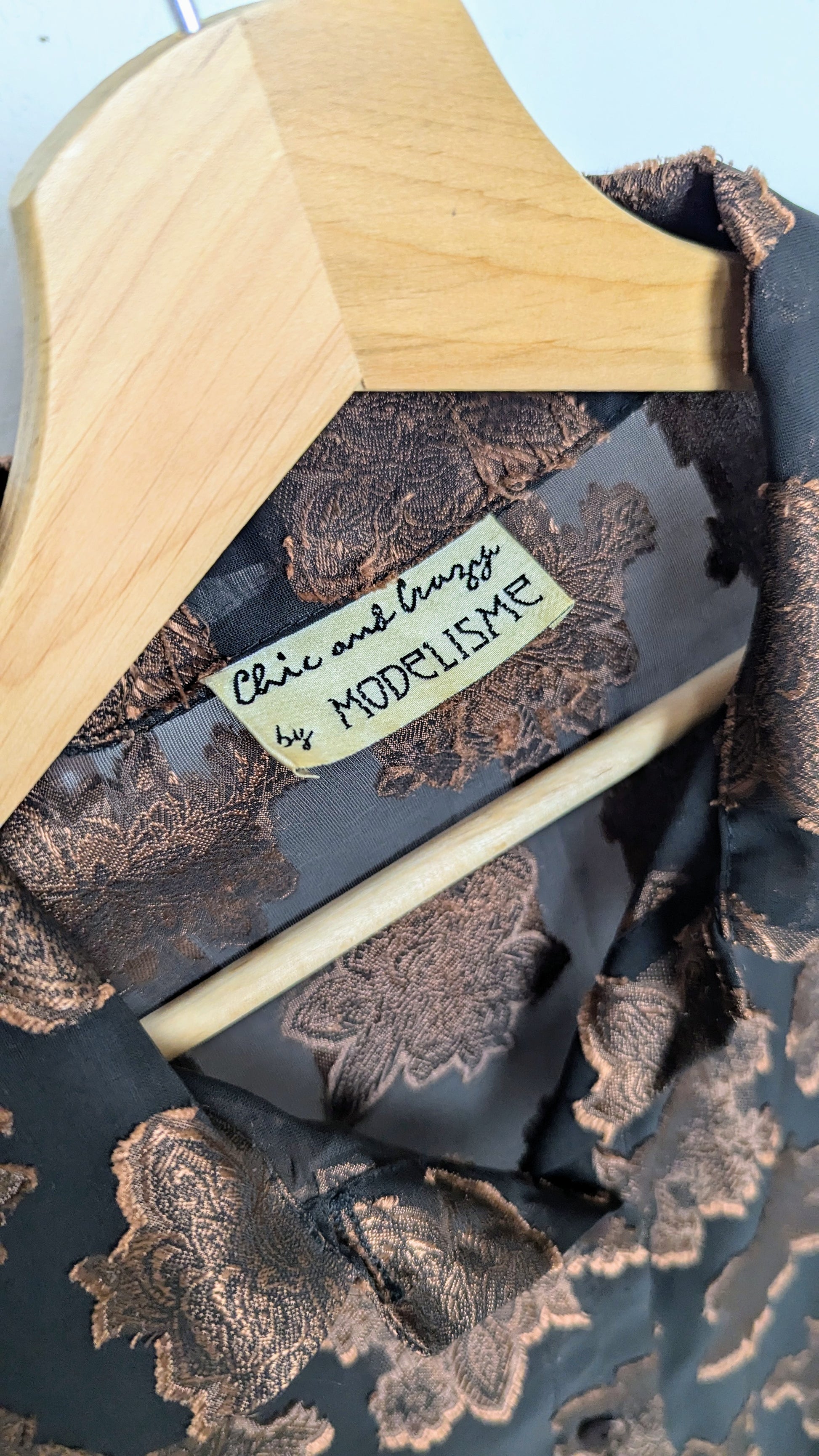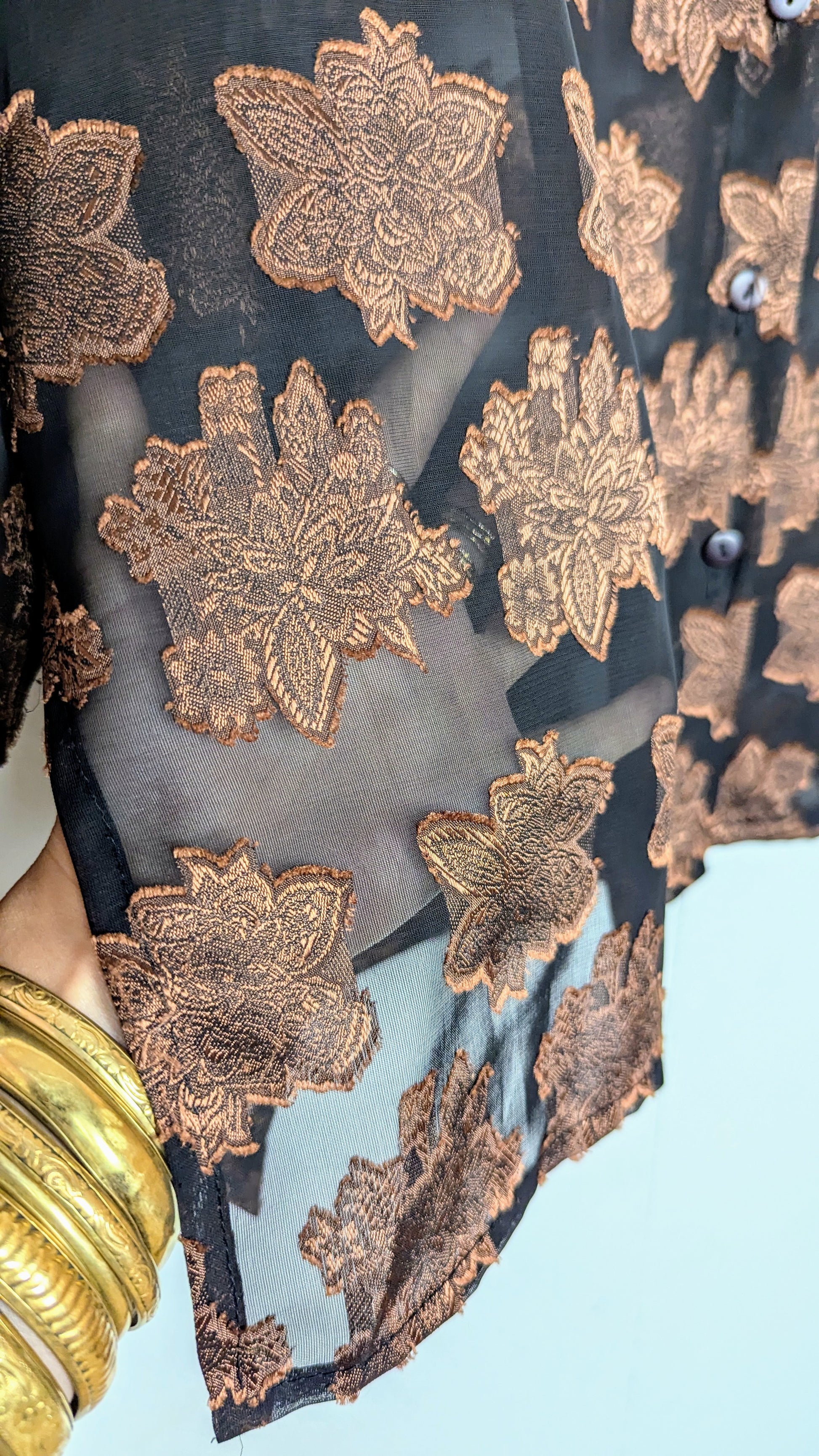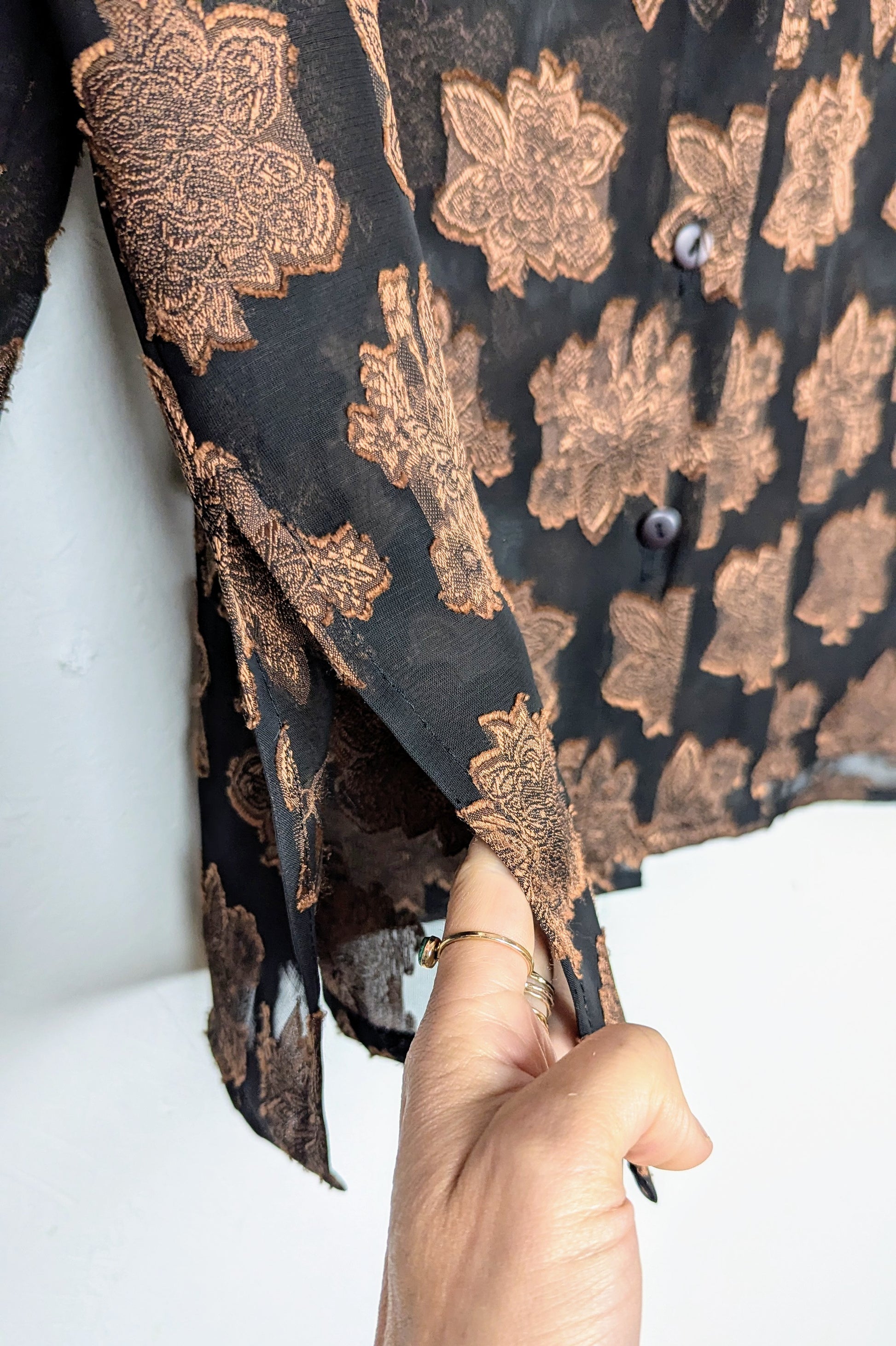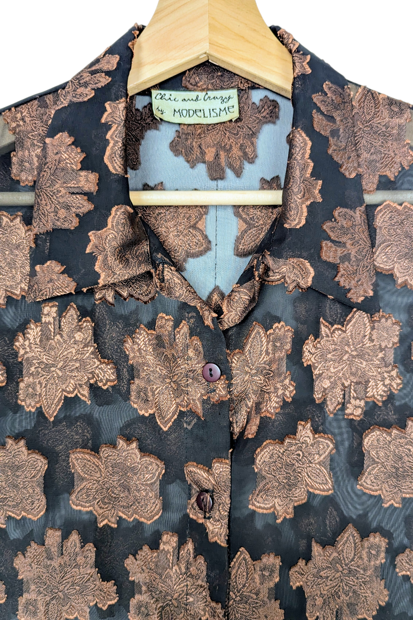 Chemise fluide, voile transparent noir avec feuilles brunes irrisées. Col chemisier. Boutonnée sur le devant avec, fendues sur les côtés. Assez longue. Coupe droite.