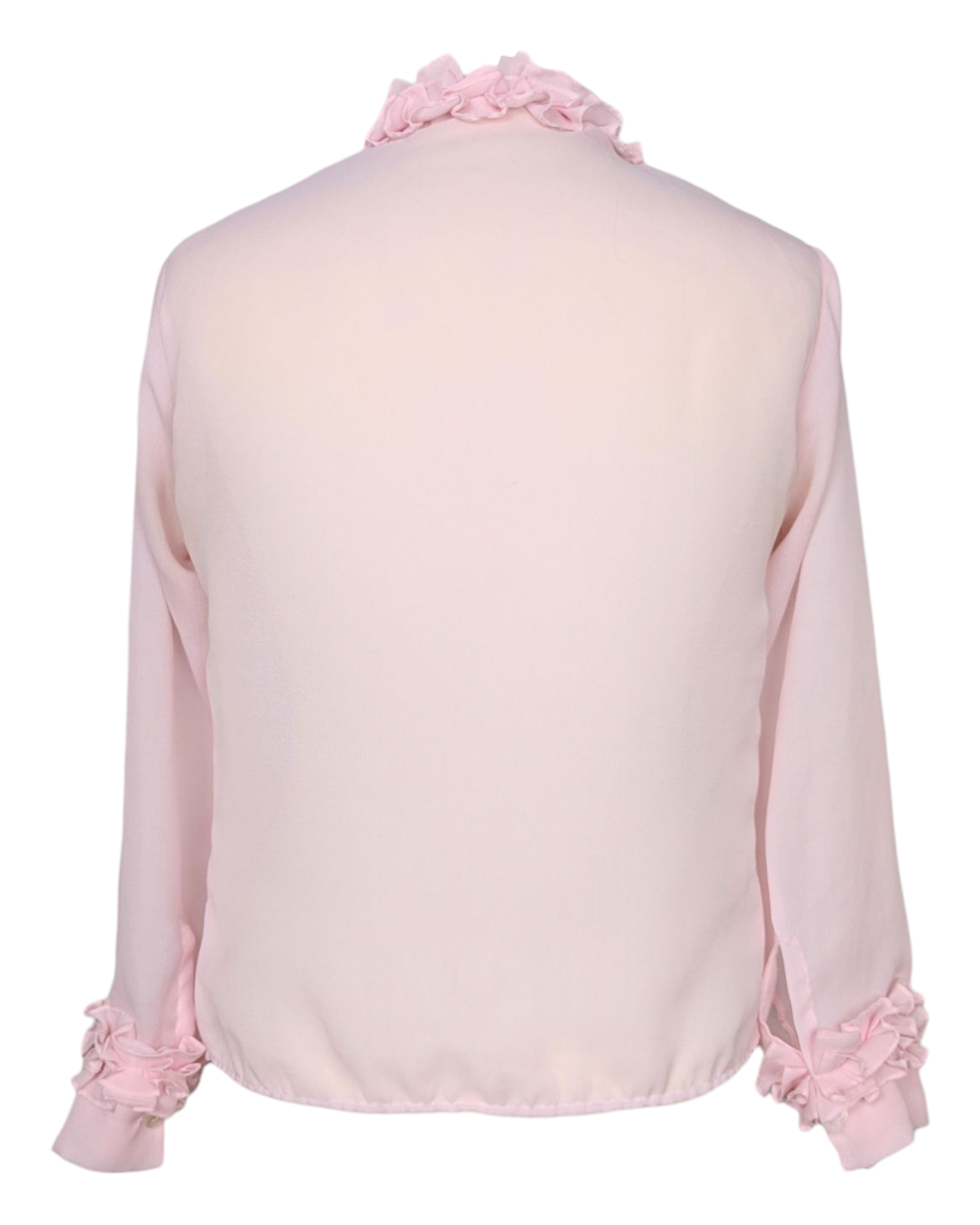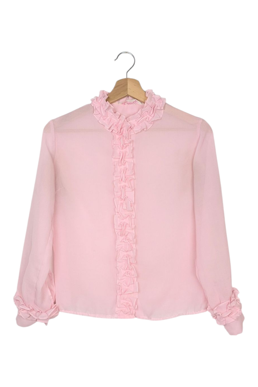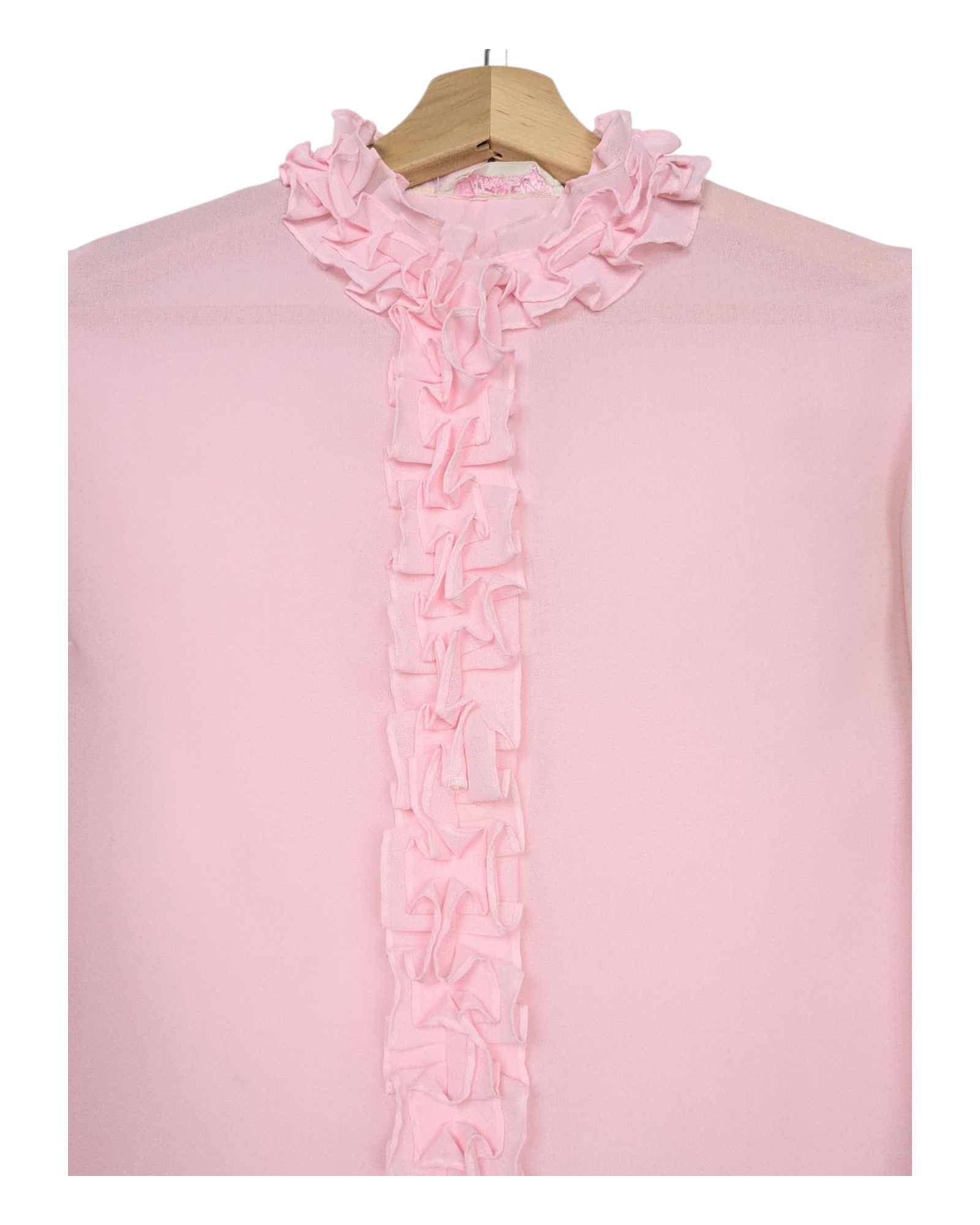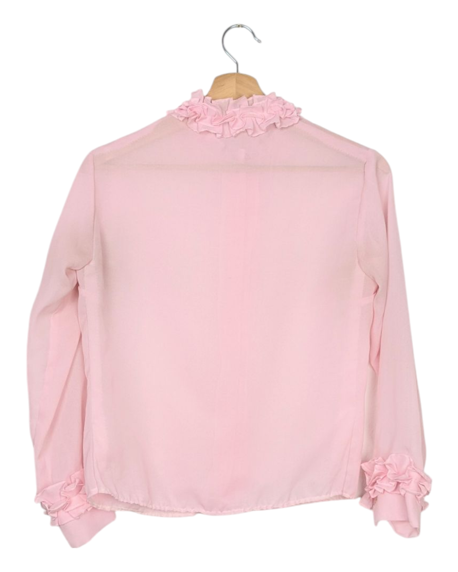 Très joli chemisier rose poudré. Volants au niveau do col, des poignets et du boutonnage. Lègérement transparent. Une pièce typique de l'époque. Look Babydoll