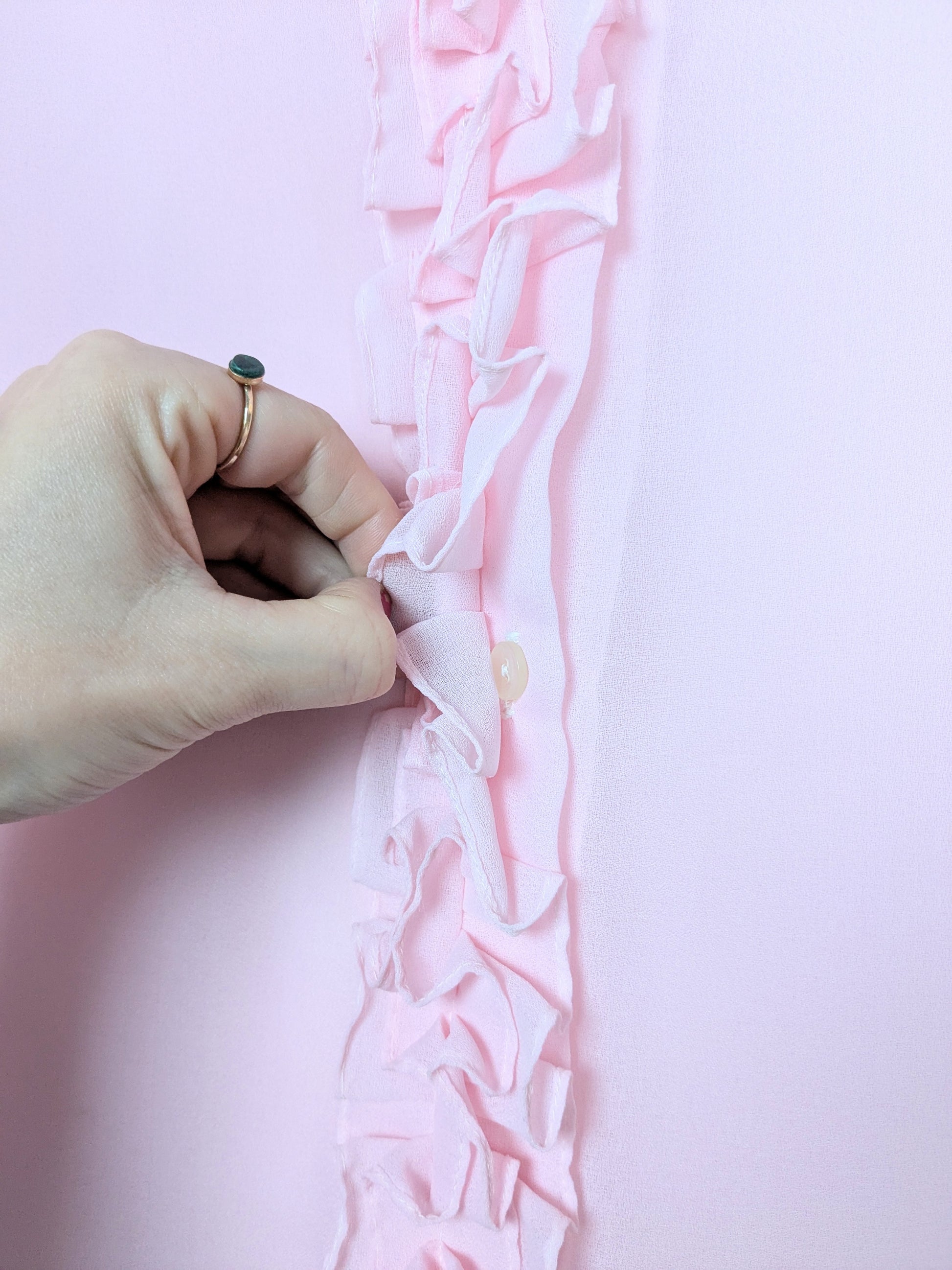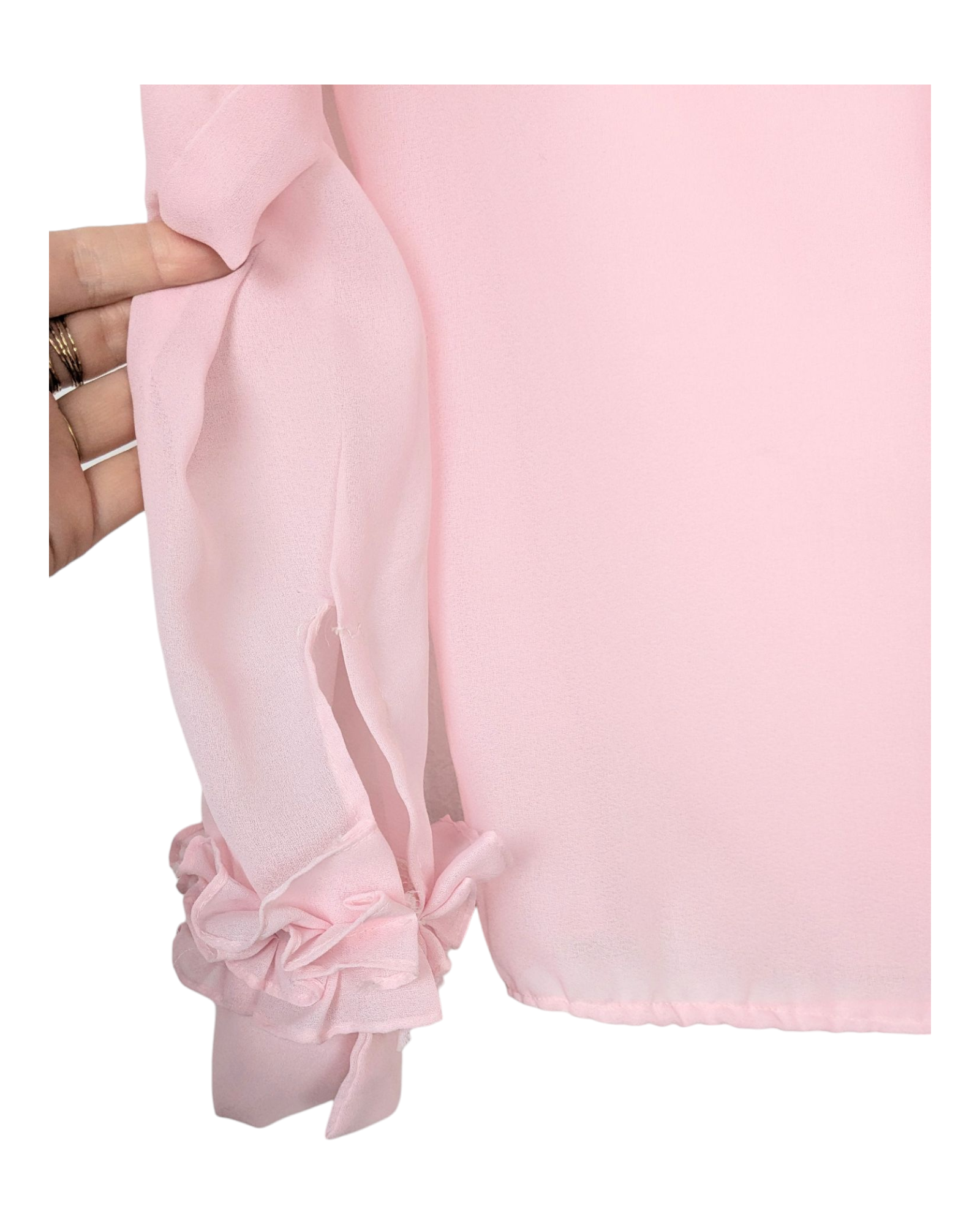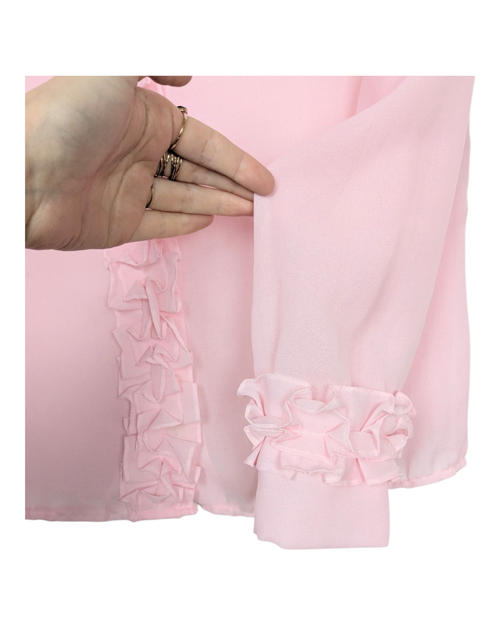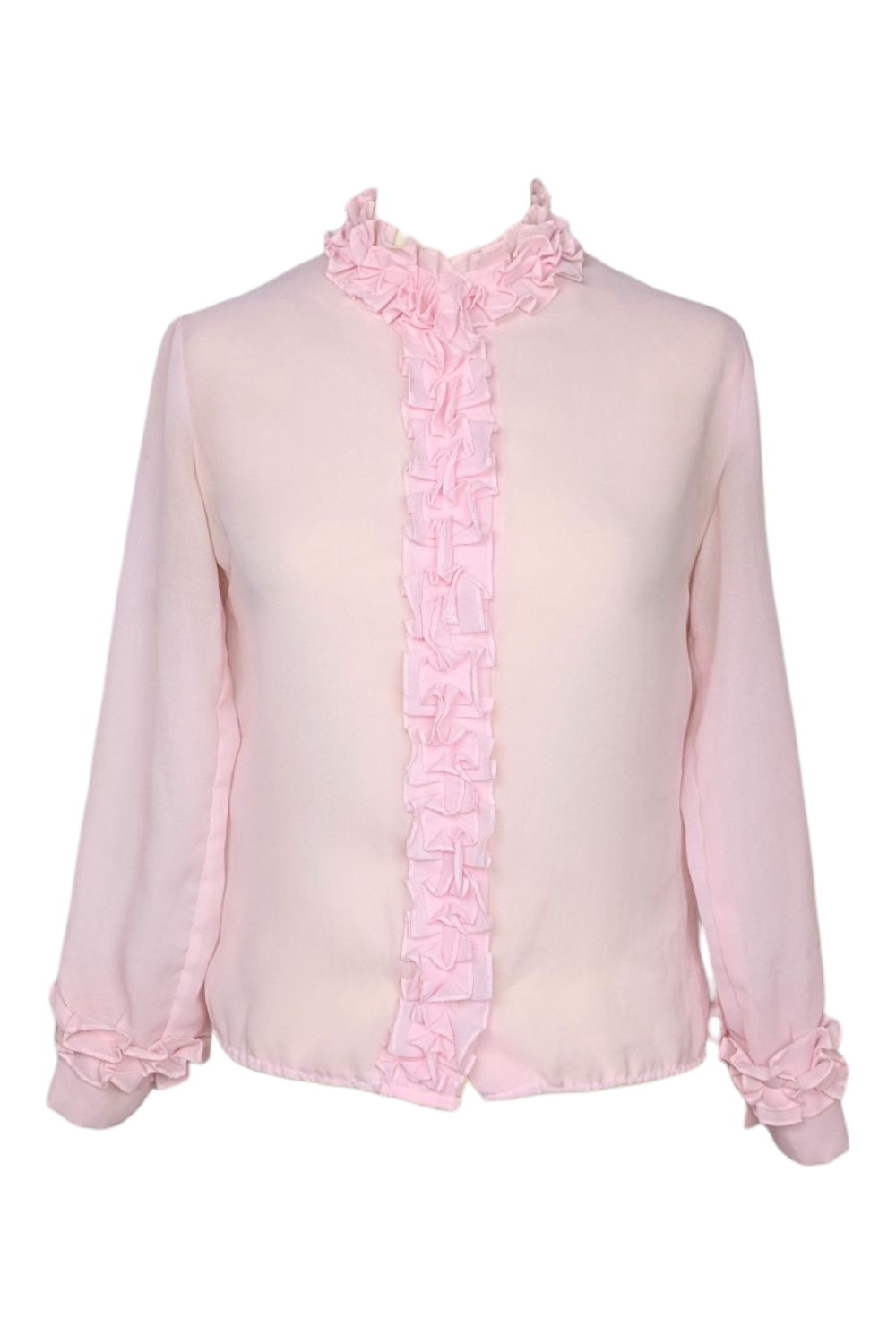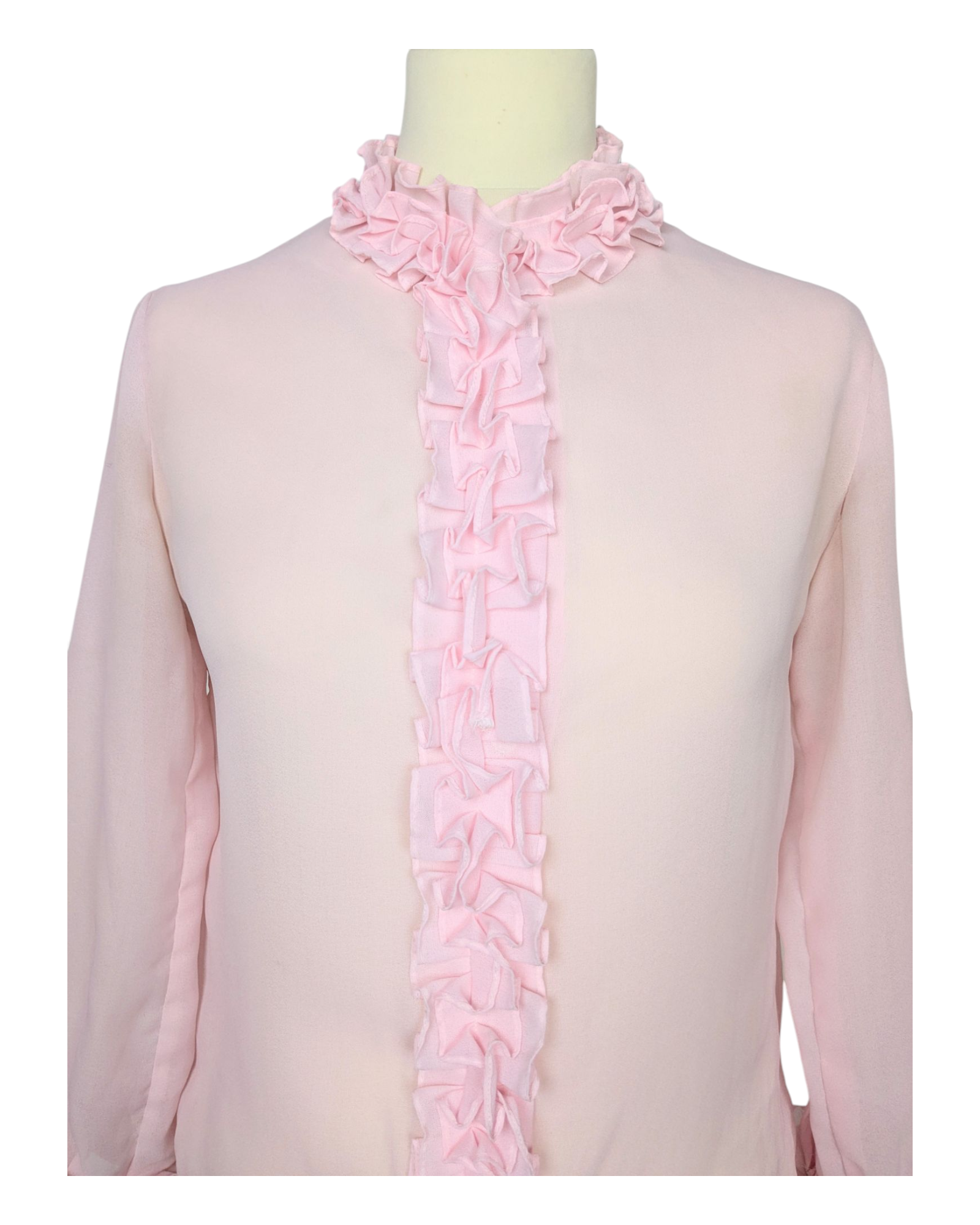 Très joli chemisier rose poudré. Volants au niveau do col, des poignets et du boutonnage. Lègérement transparent. Une pièce typique de l'époque. Look Babydoll