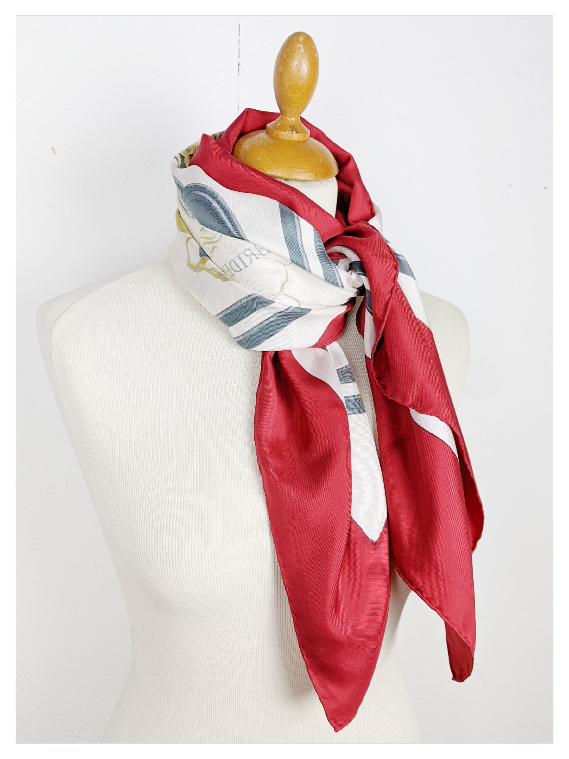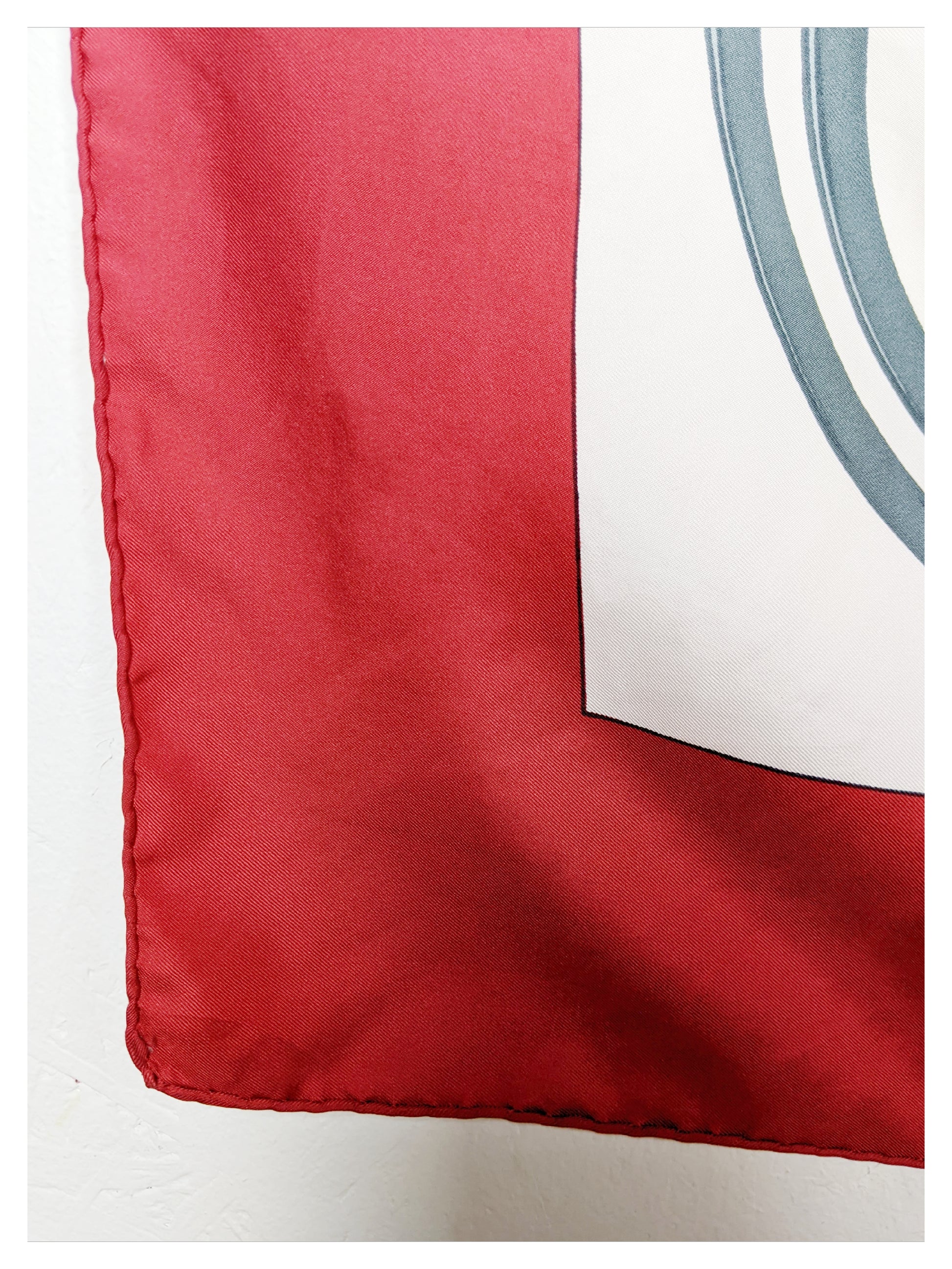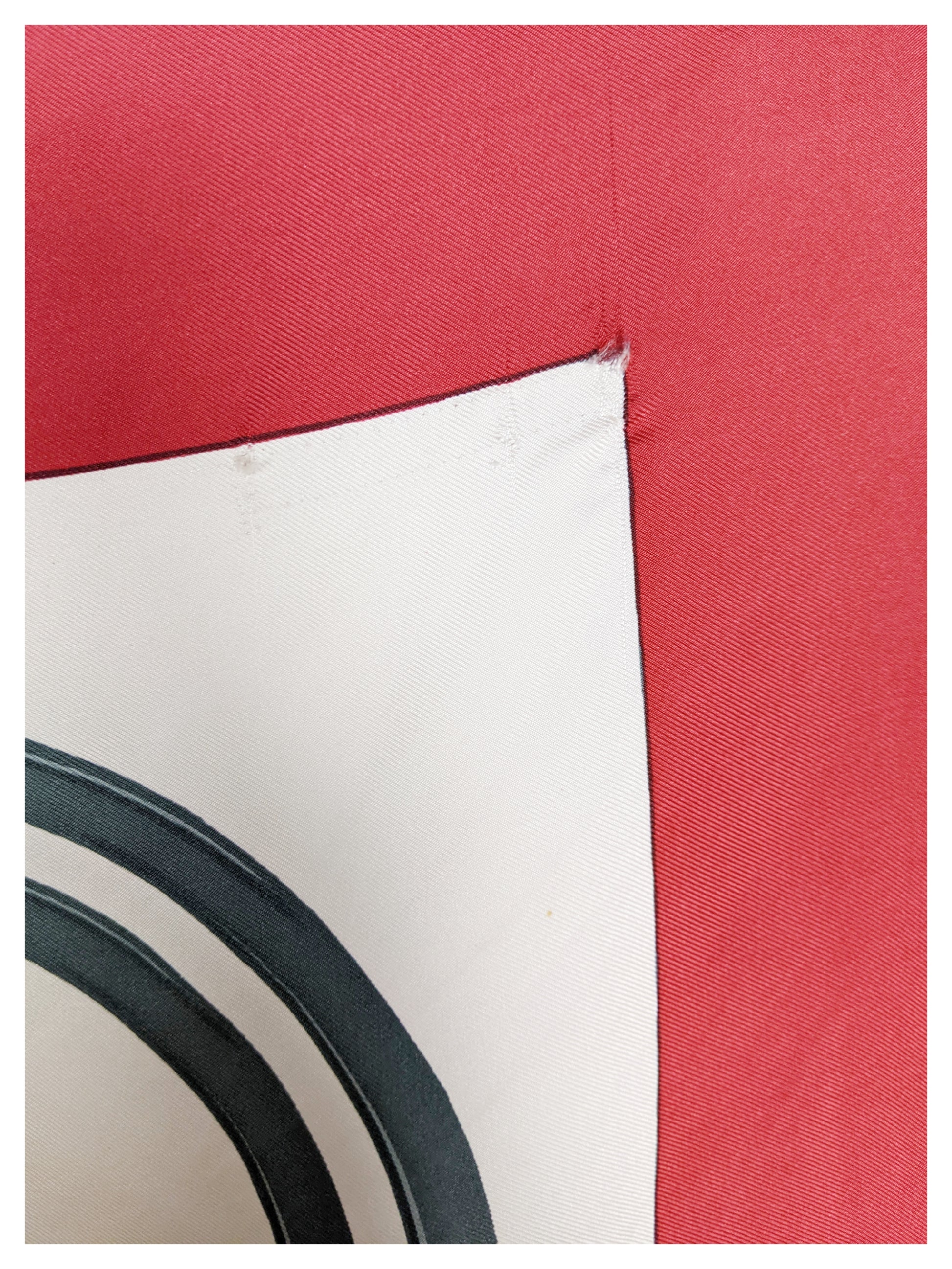 Carré de soie dans les tons rouge, gris, jaune et blanc. Ourlet roulé, cousu à la main.