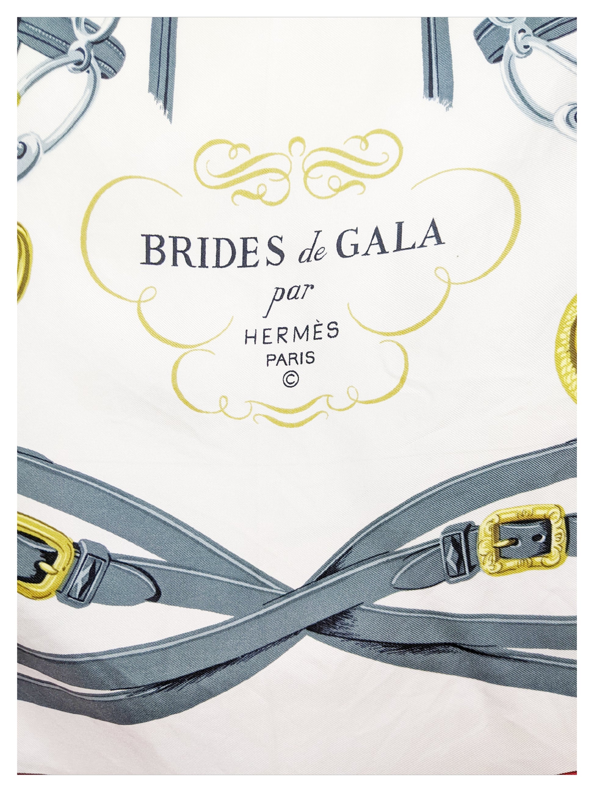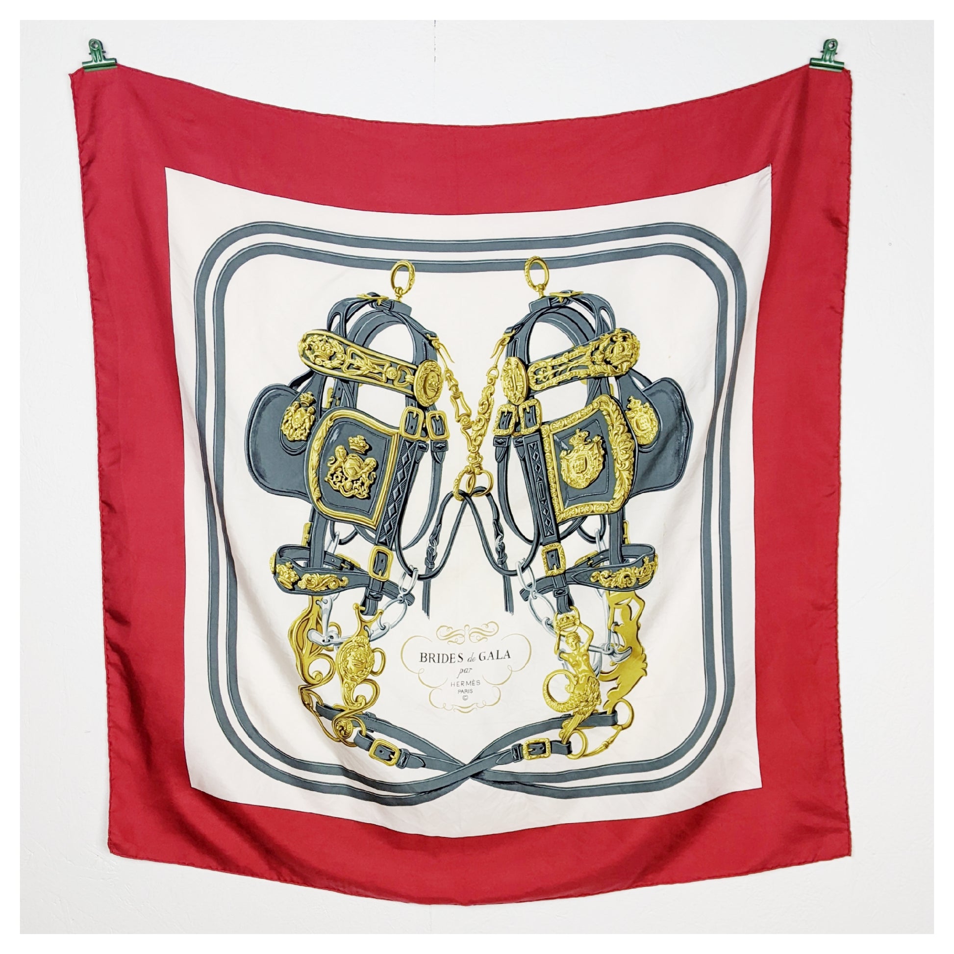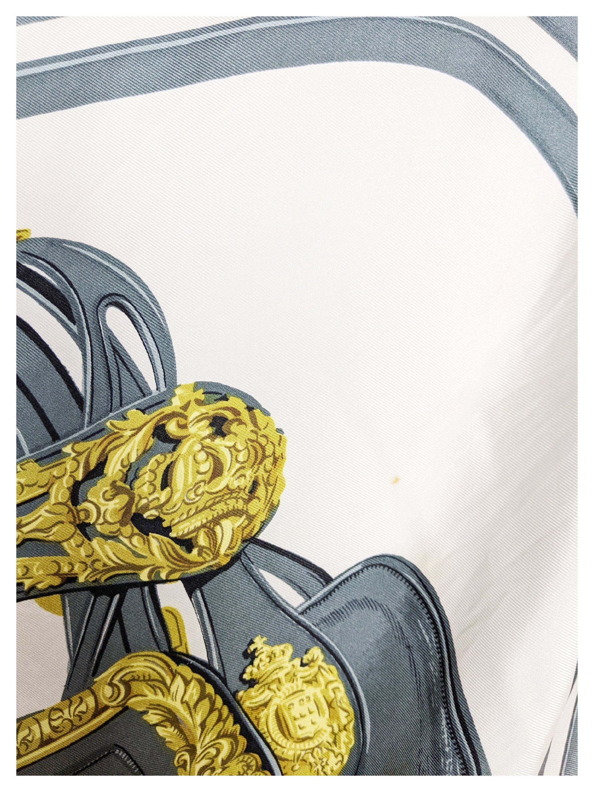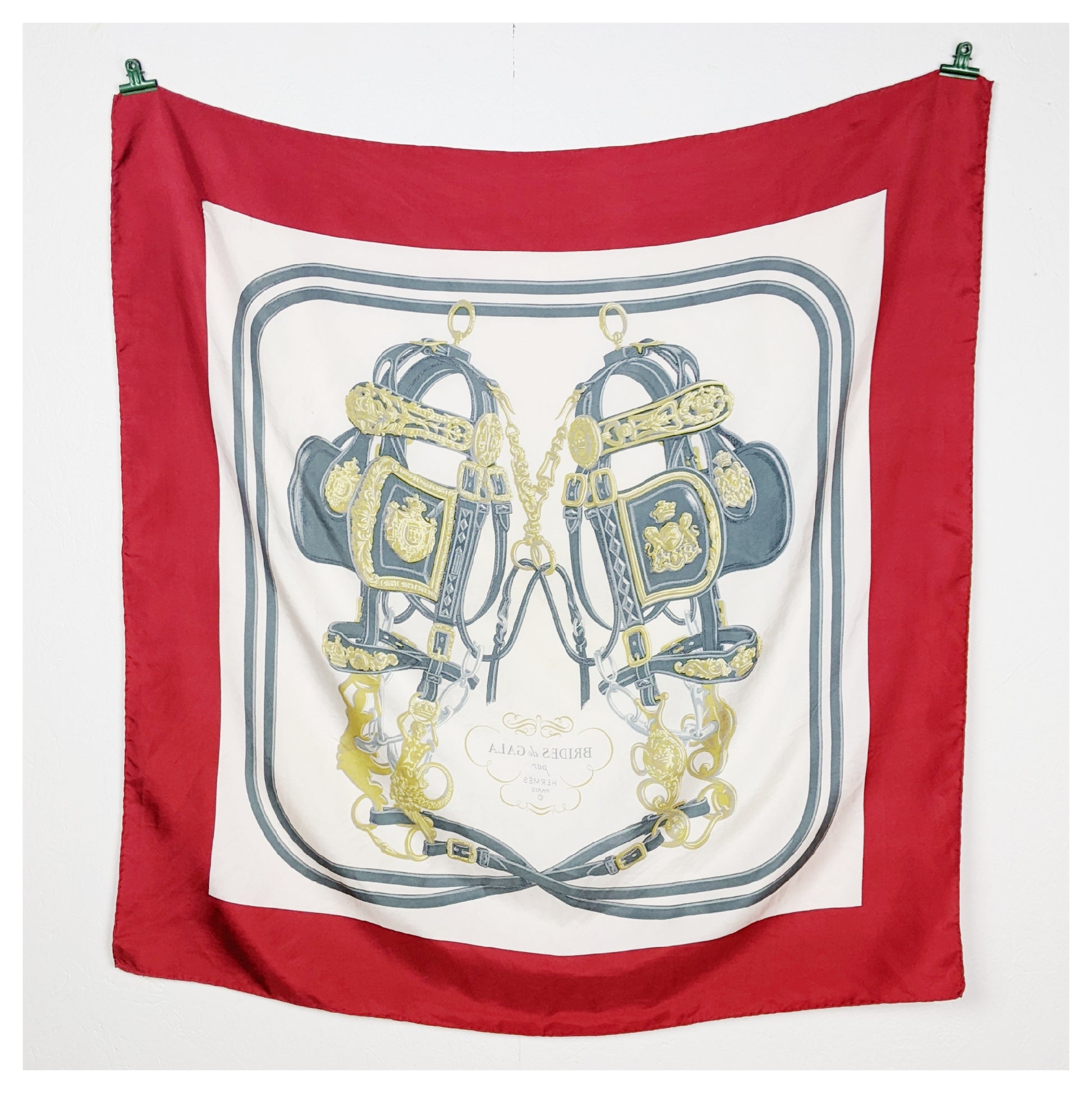 Carré de soie dans les tons rouge, gris, jaune et blanc. Ourlet roulé, cousu à la main.