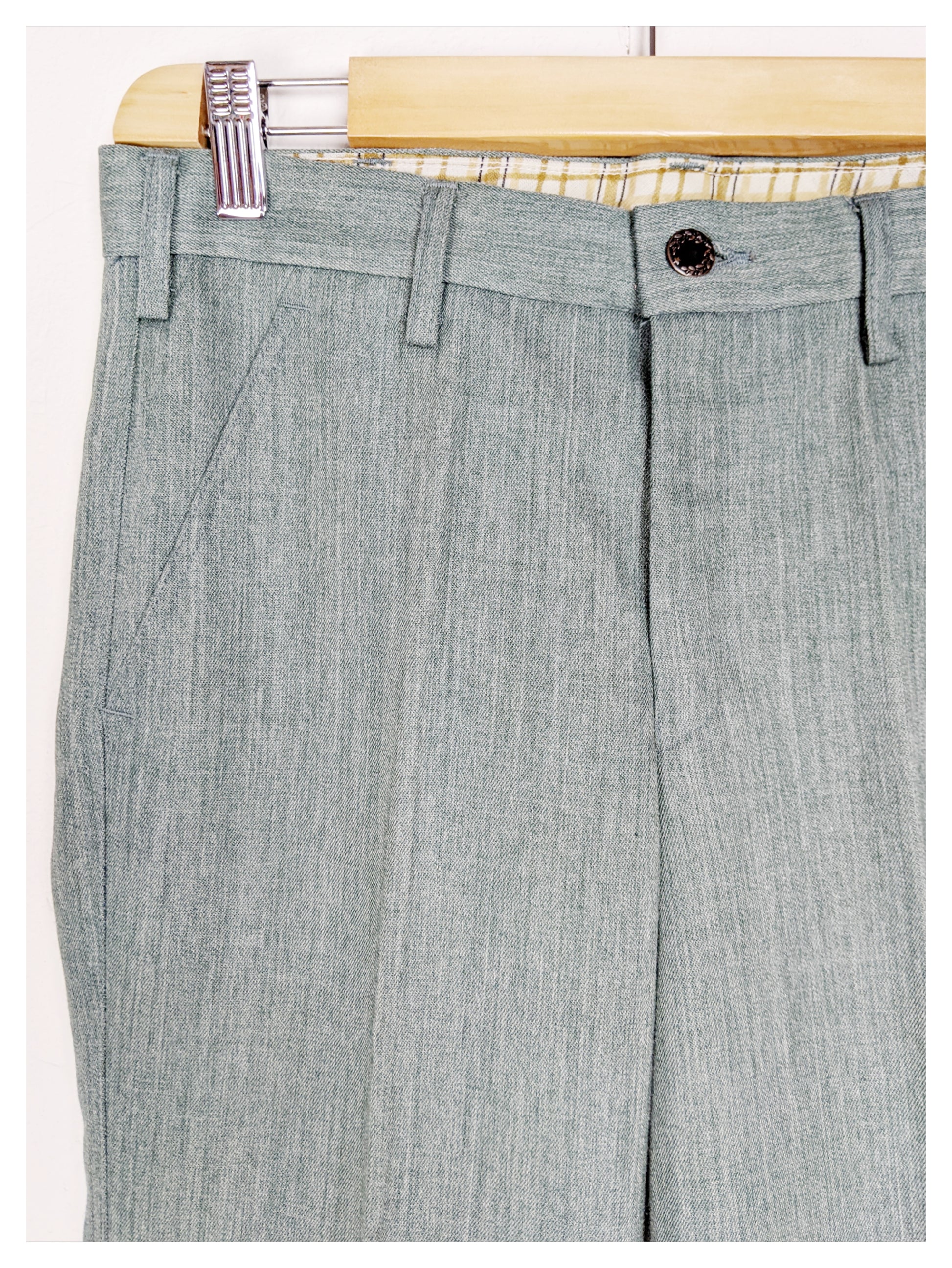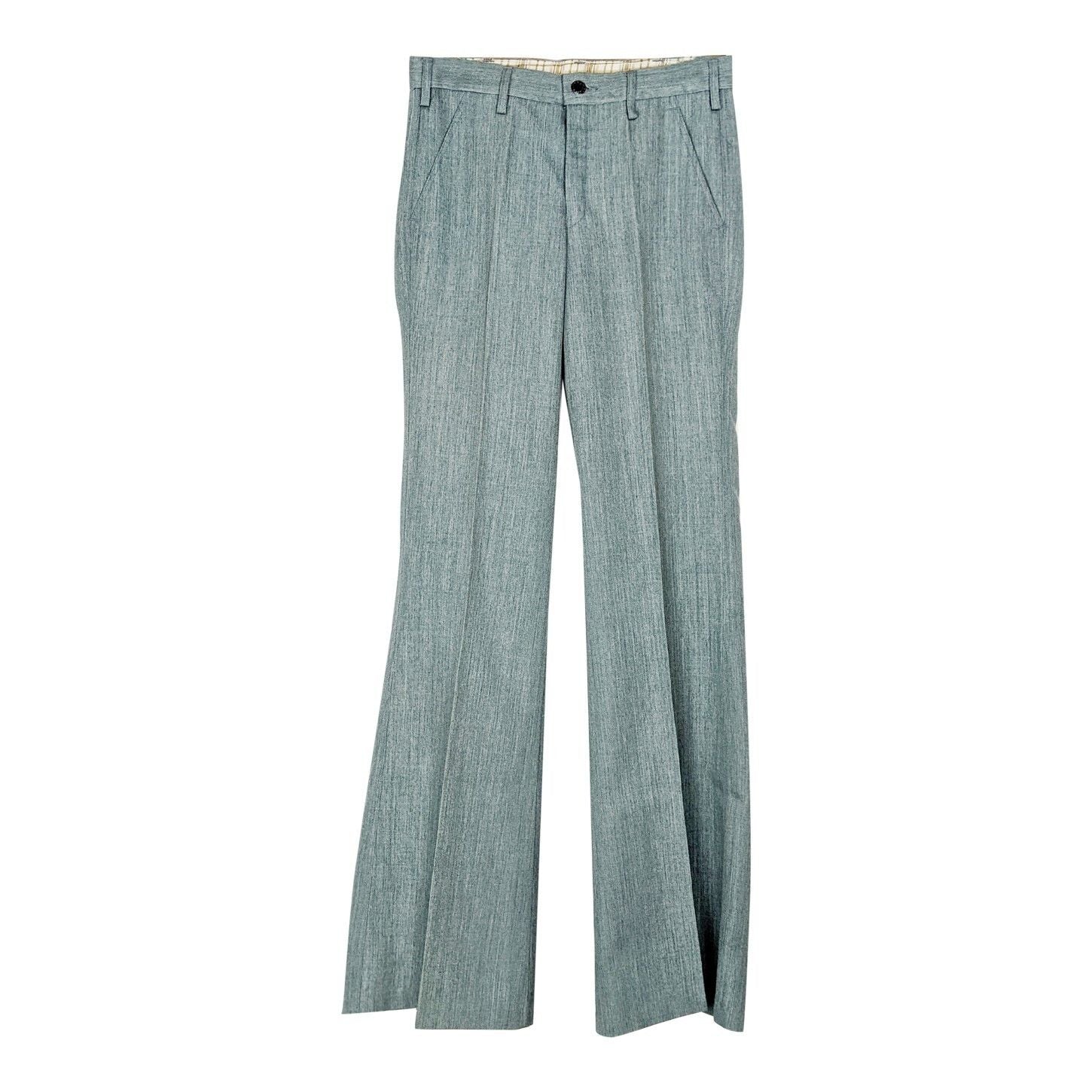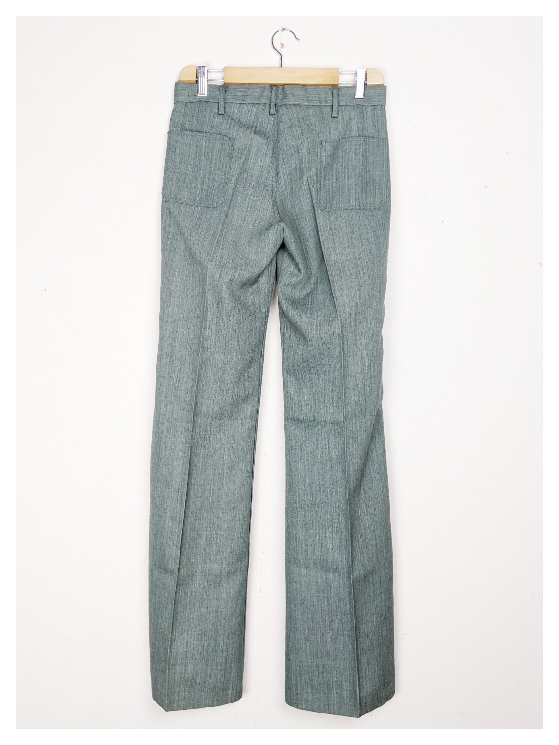 Pantalon droit de couleur vert gris, voire vert amande gris. Motifs, effet jean. Ceinturé à la taille avec 4 passants sur le devant, et trois passants dans le dos. Deus poches italiennes sur le devant de chaque côté, et deux poches plaquées sur le derrière. Pattes d'eph'. Fermeture éclaire avec bouton sur le devant. Une vraie pépite pour un look 70s !