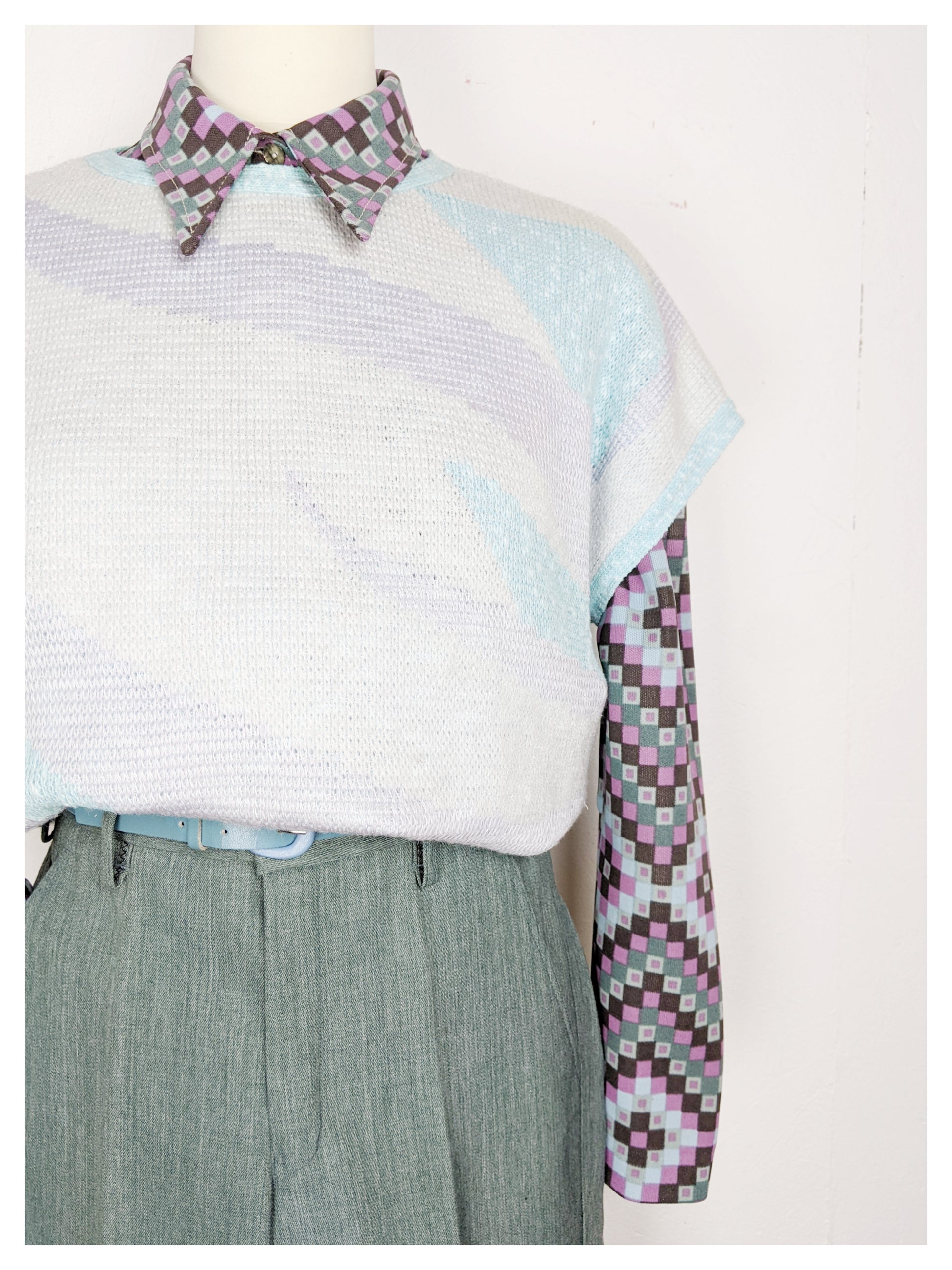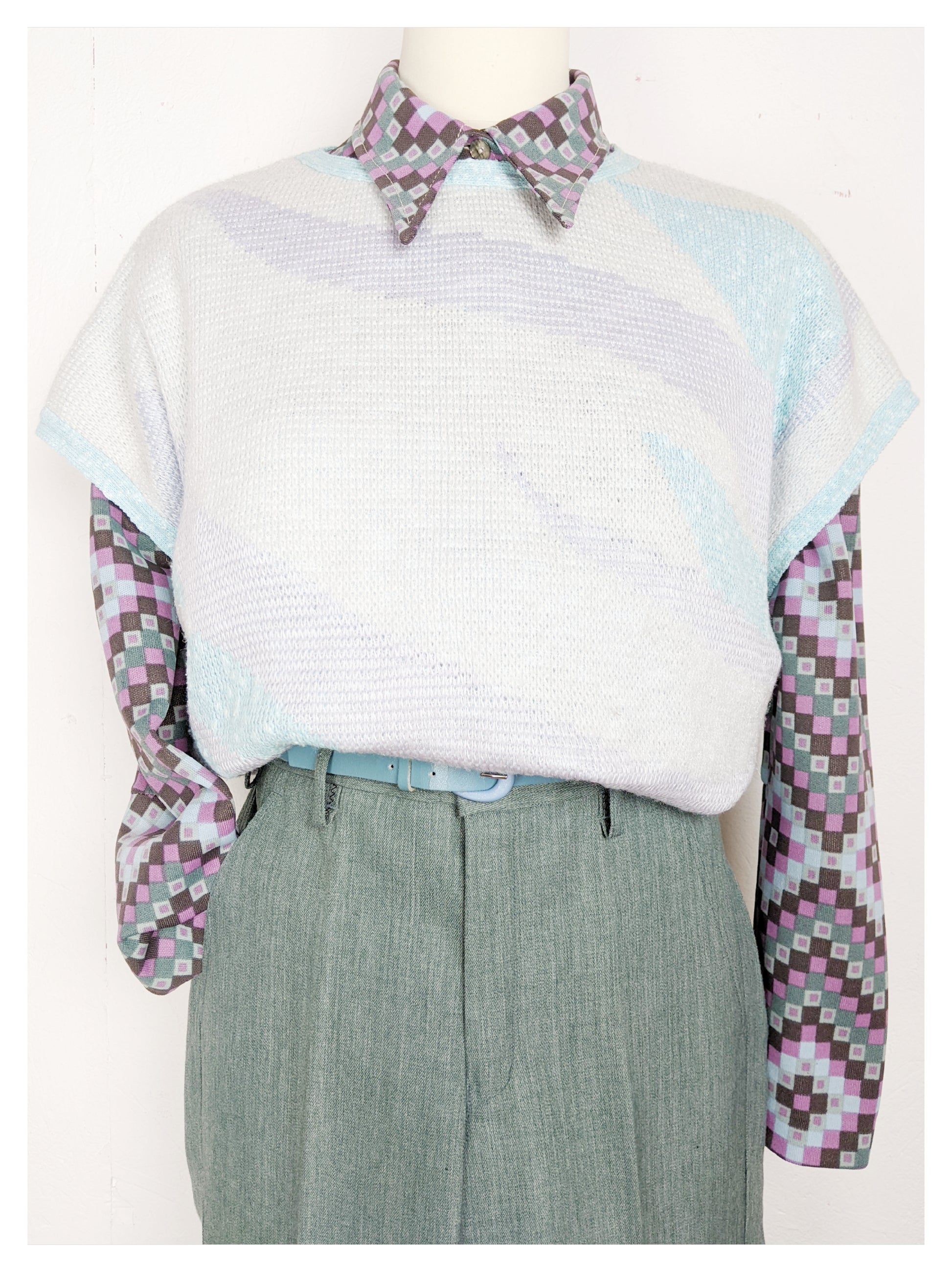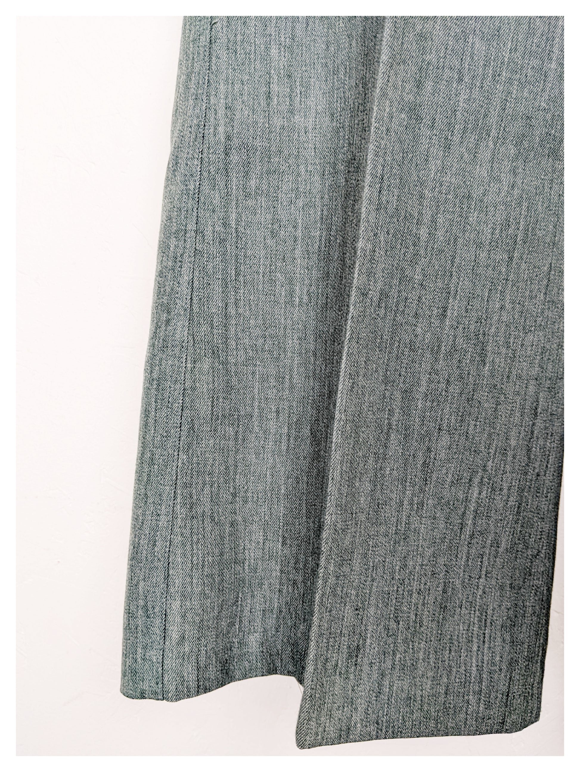 Pantalon droit de couleur vert gris, voire vert amande gris. Motifs, effet jean. Ceinturé à la taille avec 4 passants sur le devant, et trois passants dans le dos. Deus poches italiennes sur le devant de chaque côté, et deux poches plaquées sur le derrière. Pattes d'eph'. Fermeture éclaire avec bouton sur le devant. Une vraie pépite pour un look 70s !