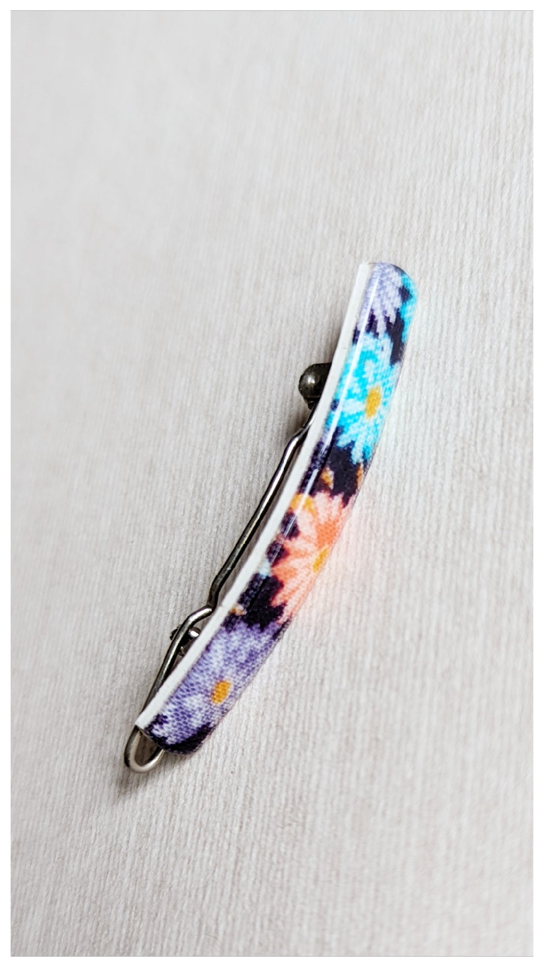 Jolie petite barette à cheveux en plastique fleurs mutlitcolores sur fond noir. Rectangulaire avec pince métalique à clip.