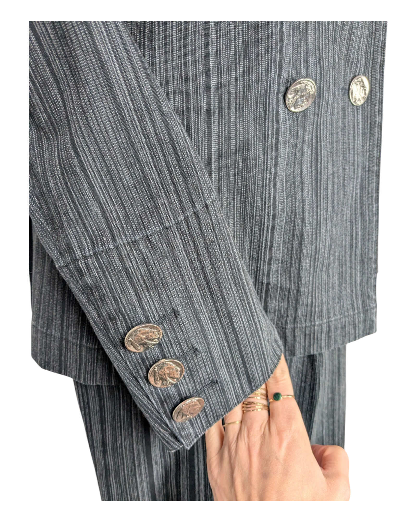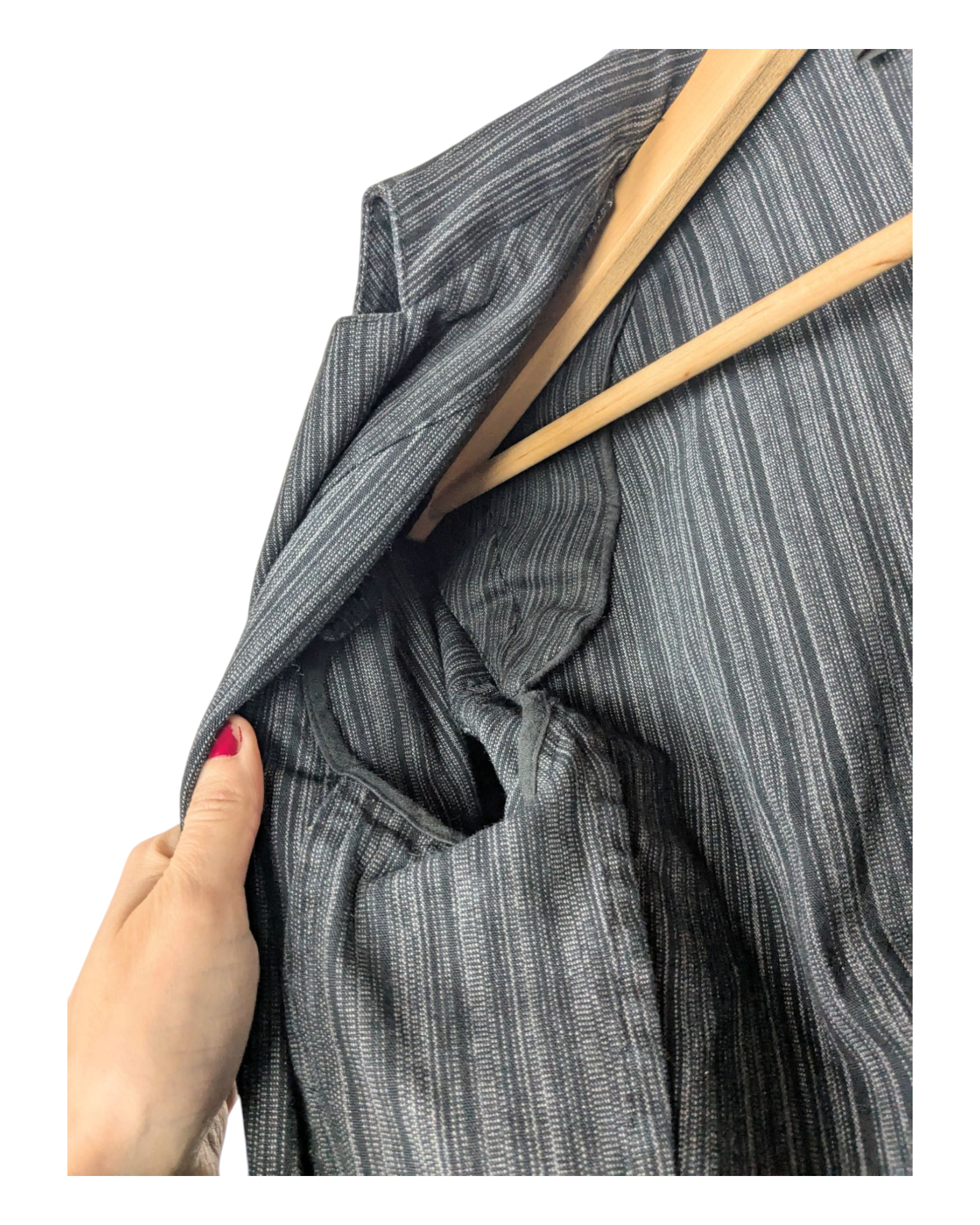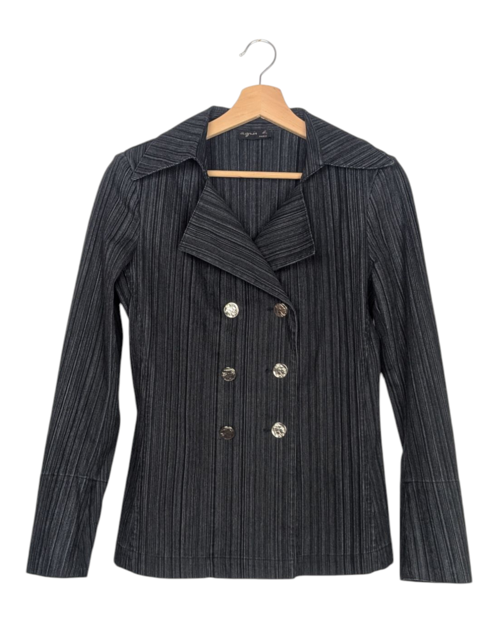 Très beau tailleur Agnès B dans les tons gris ligné. Très belles veste cintrée, et pantalon plutôt taille haute.