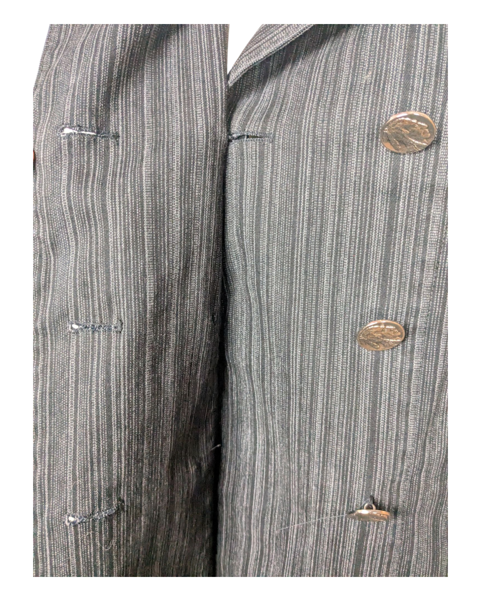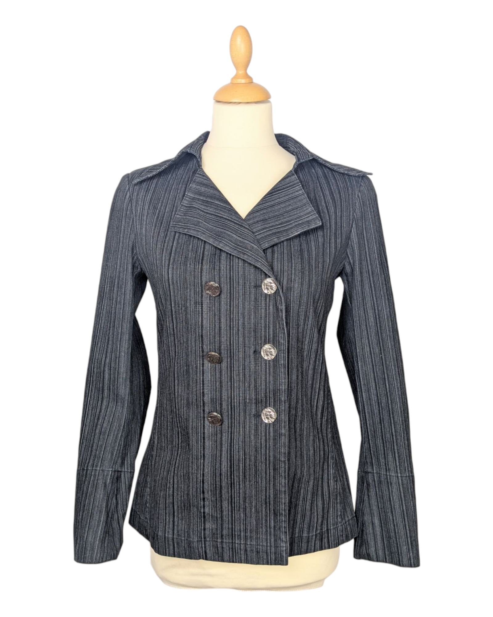 Dimensions à plat de la veste : 39 cm de carrure, 61 cm de longueur de manche, 44 cm de tour de poitrine, 39 cm de tour de taille, 64 cm de long.