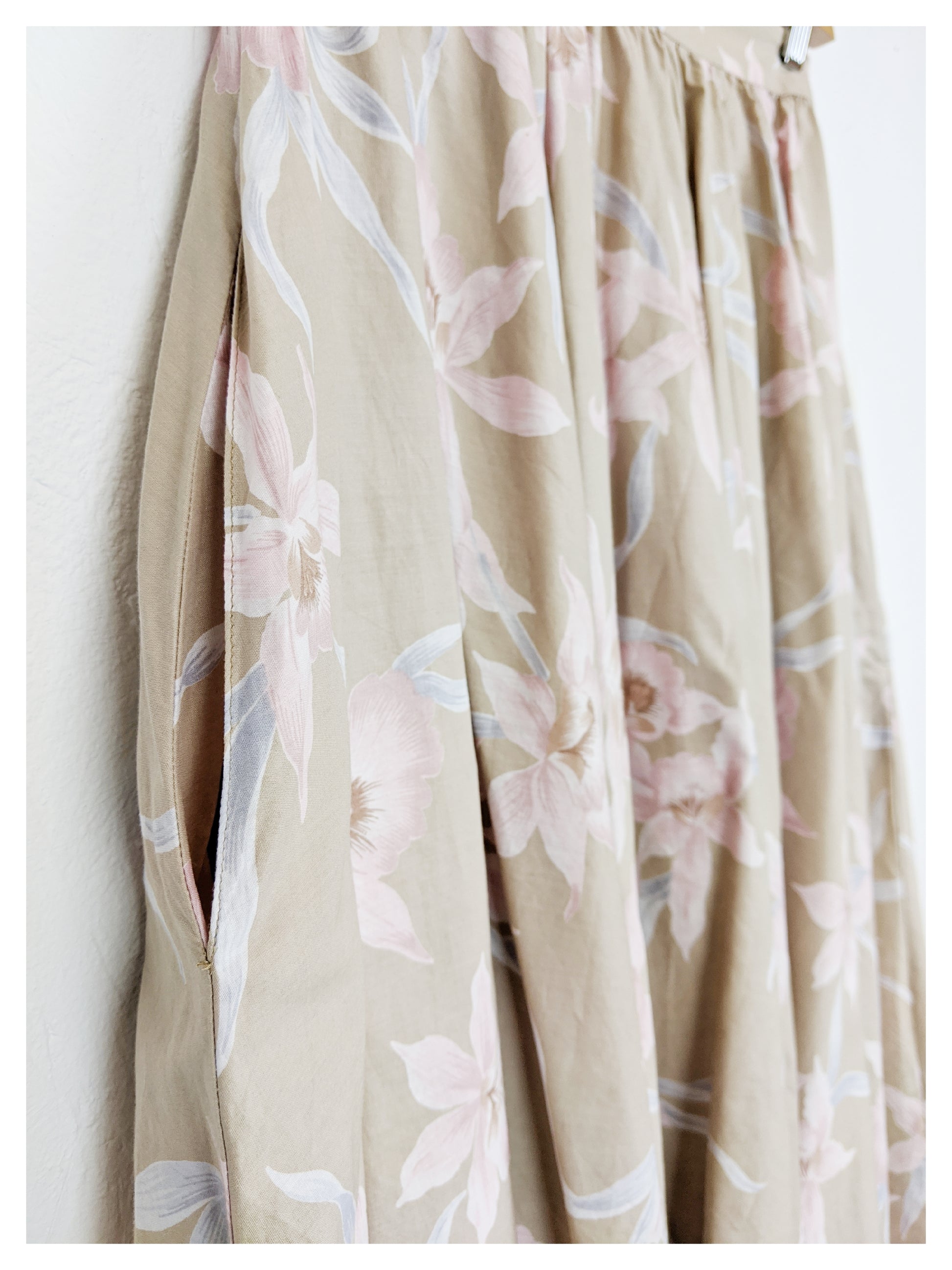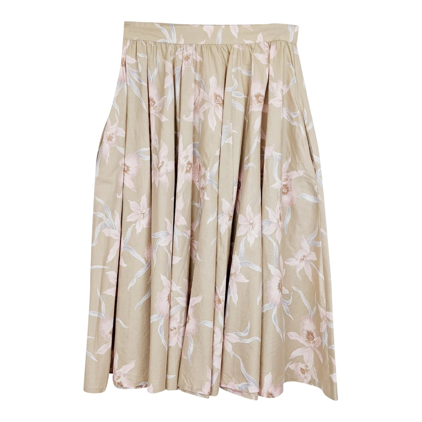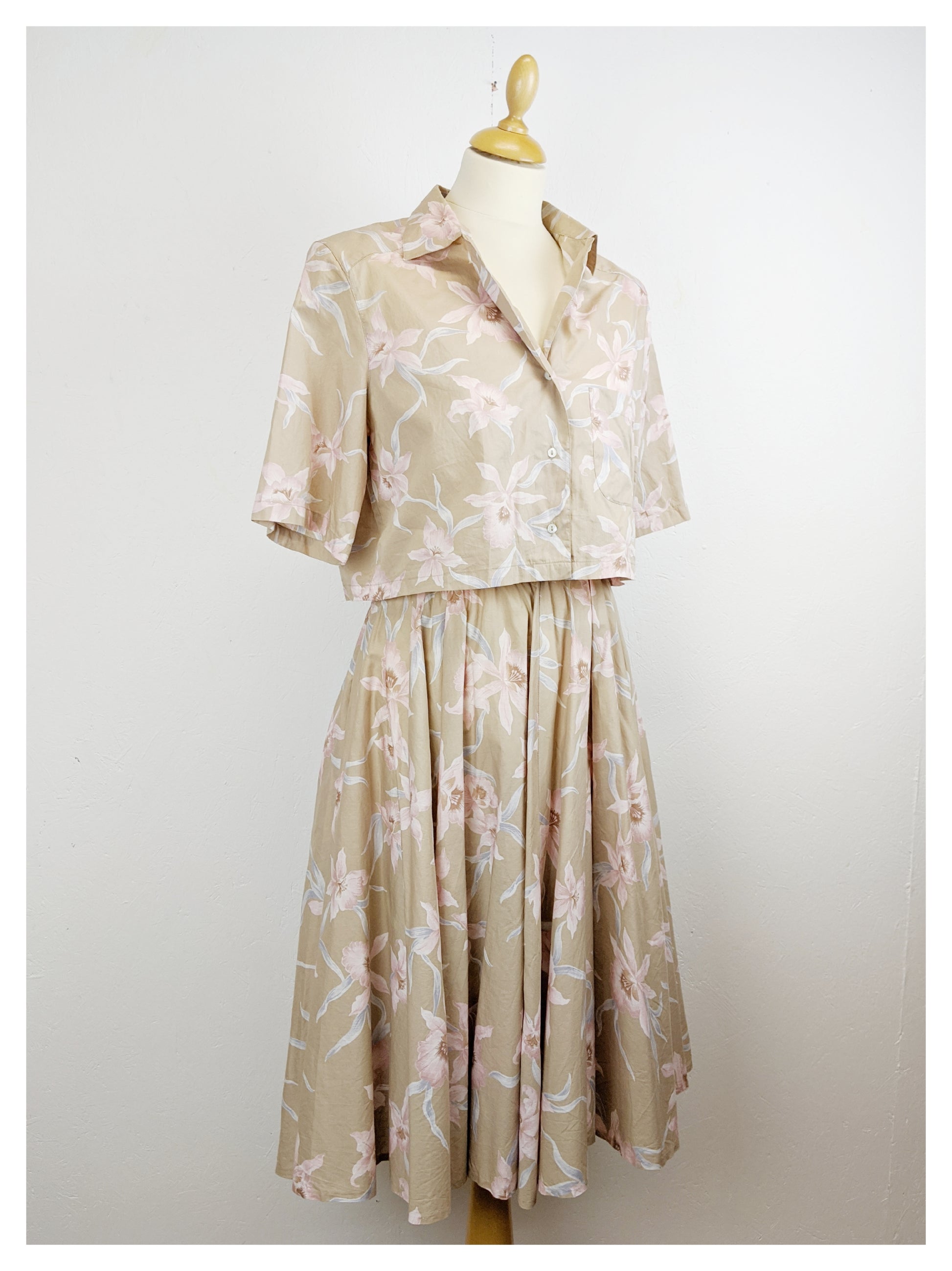 Jupe de la marque cacharel aux motifs floraux (lys) dans les tons brun-sable, blanc, vieux rose, gris. Jupe parapluie, taille haute. Ceinturée à la taille avec une bande renforcée. Fermeture éclaire et bouton de fermeture à l'arrière. Froncée à la taille. Deux poches invisibles de chaque côté. Longueur midi.