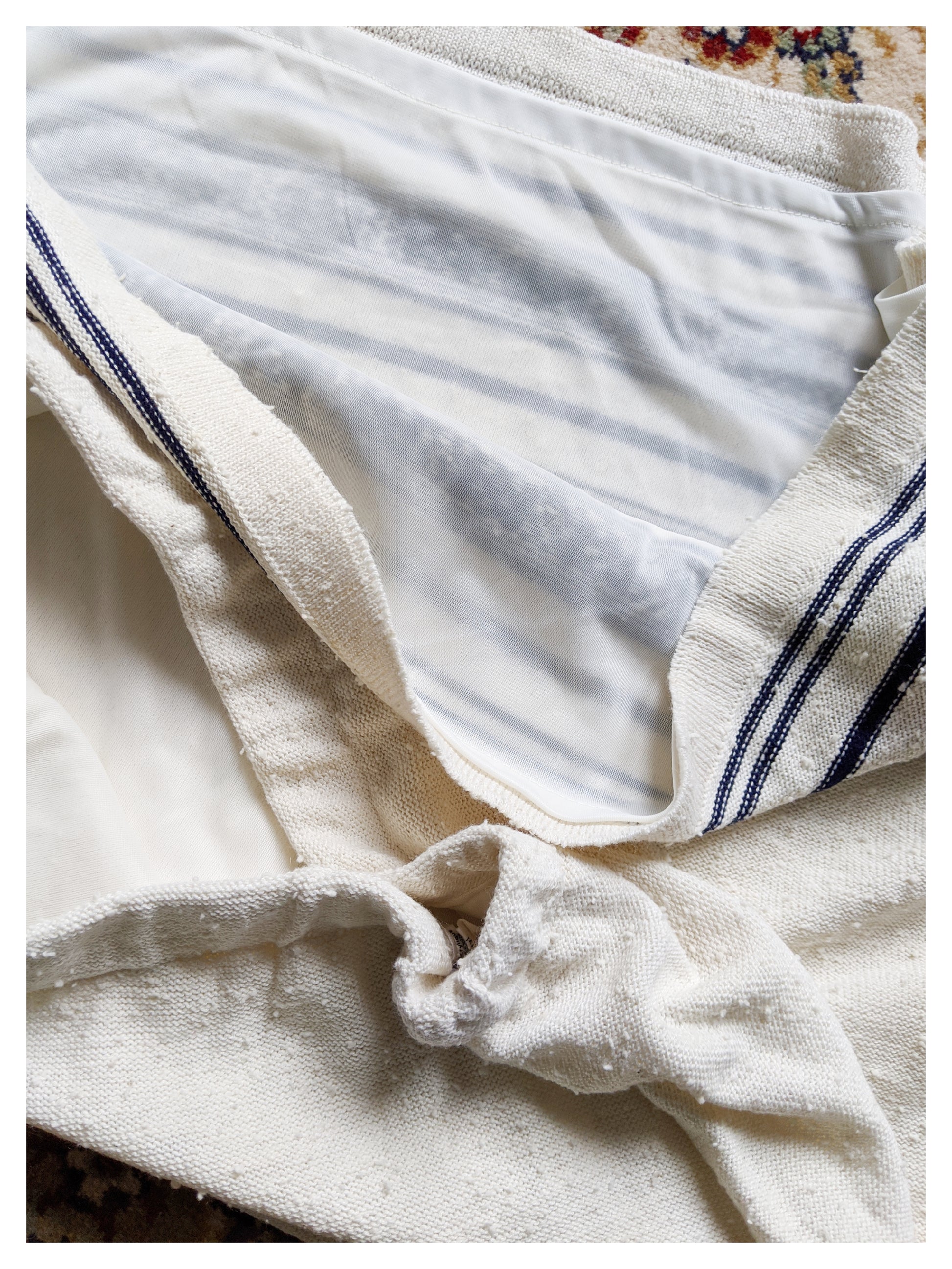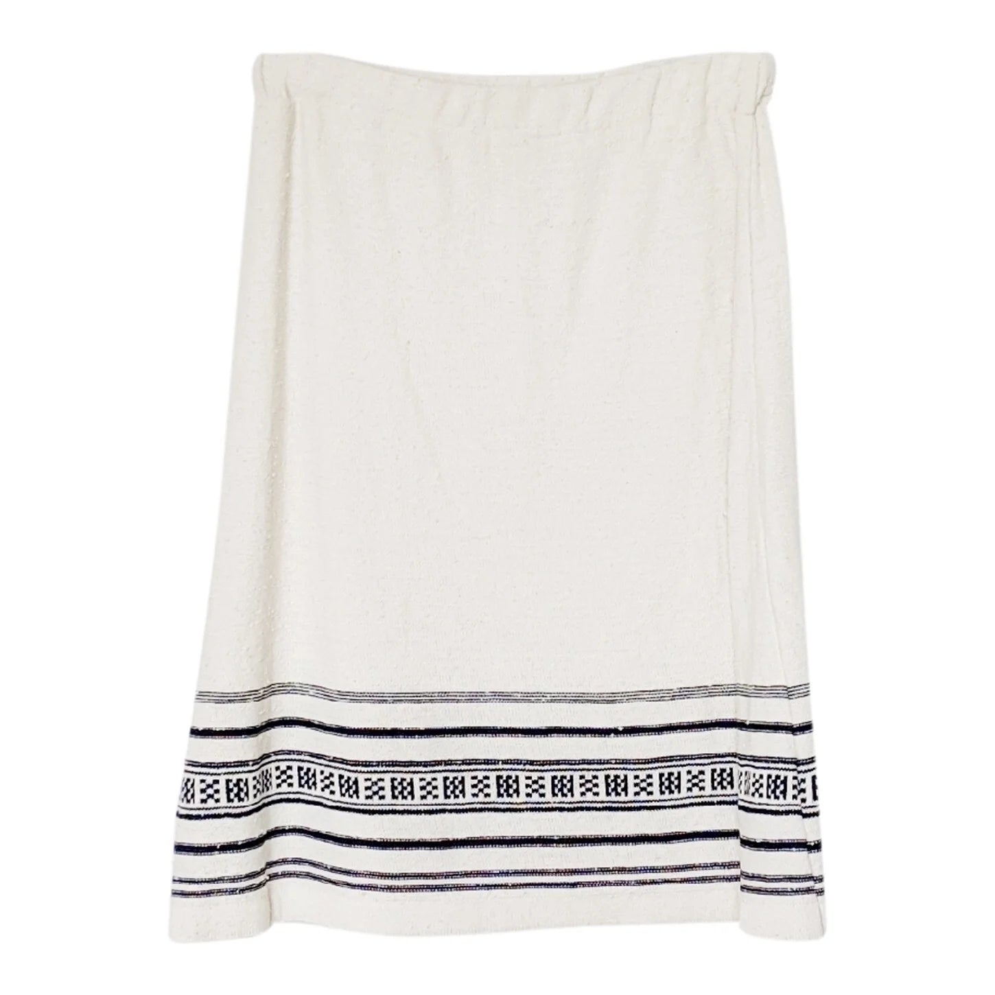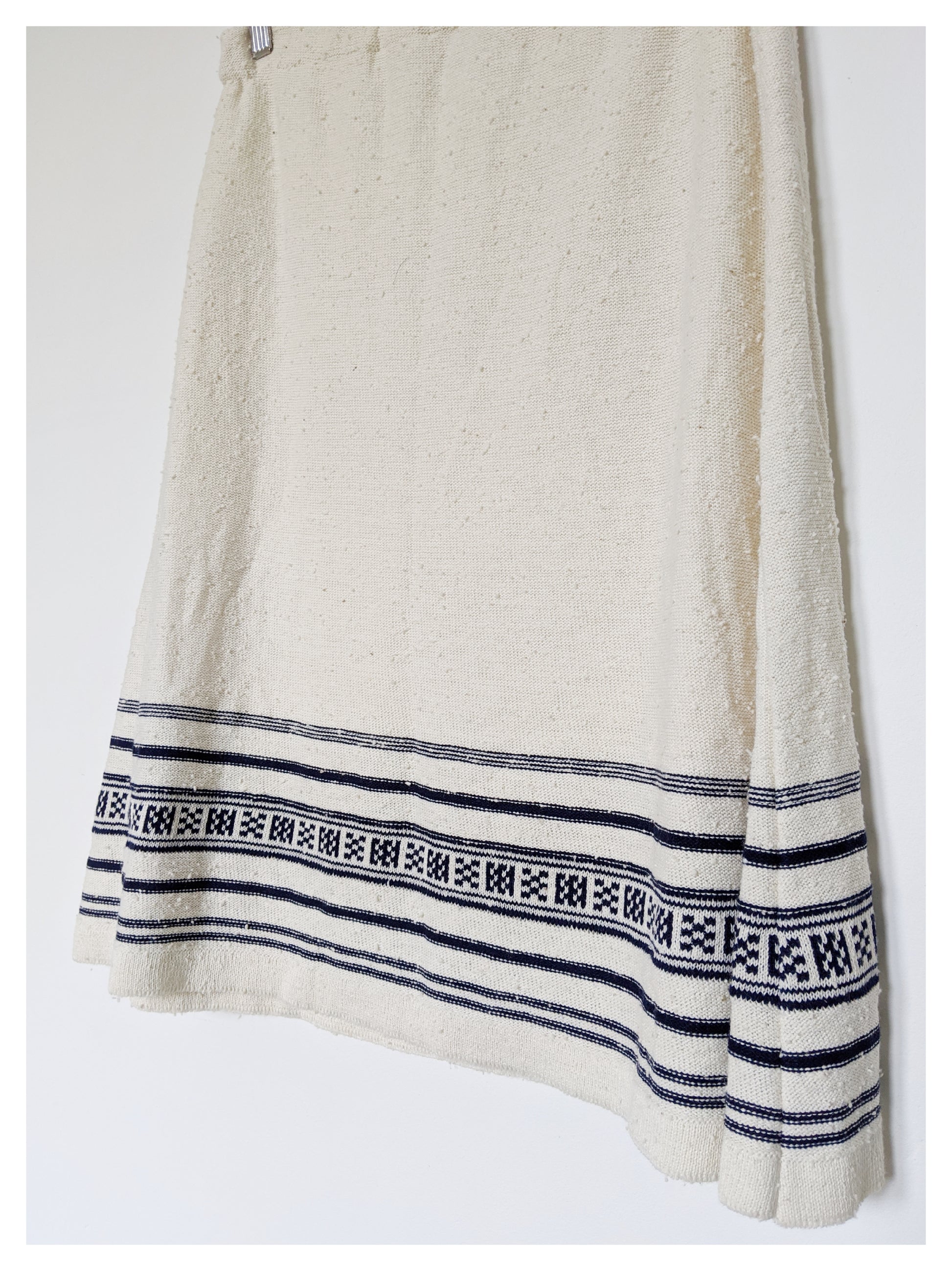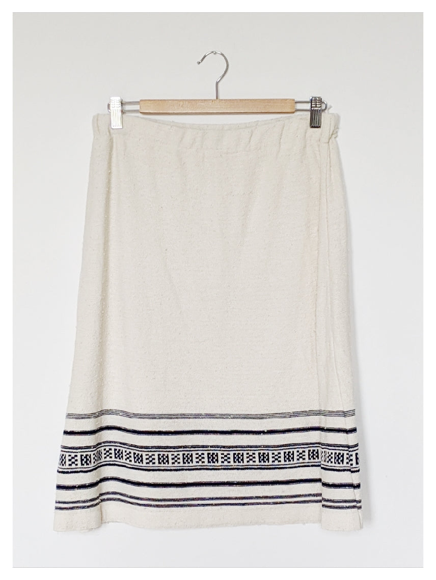 Jupe tissu, type lainage, dans un ton crème avec lignes et motifs bleu marine. Coupe trapèze, légèrement extensible. Gros élastique à la taille, qui donne l'effet d'une bande, plutôt qu'un élastique retroussé. Entièrement doublée. Assez chaude.
