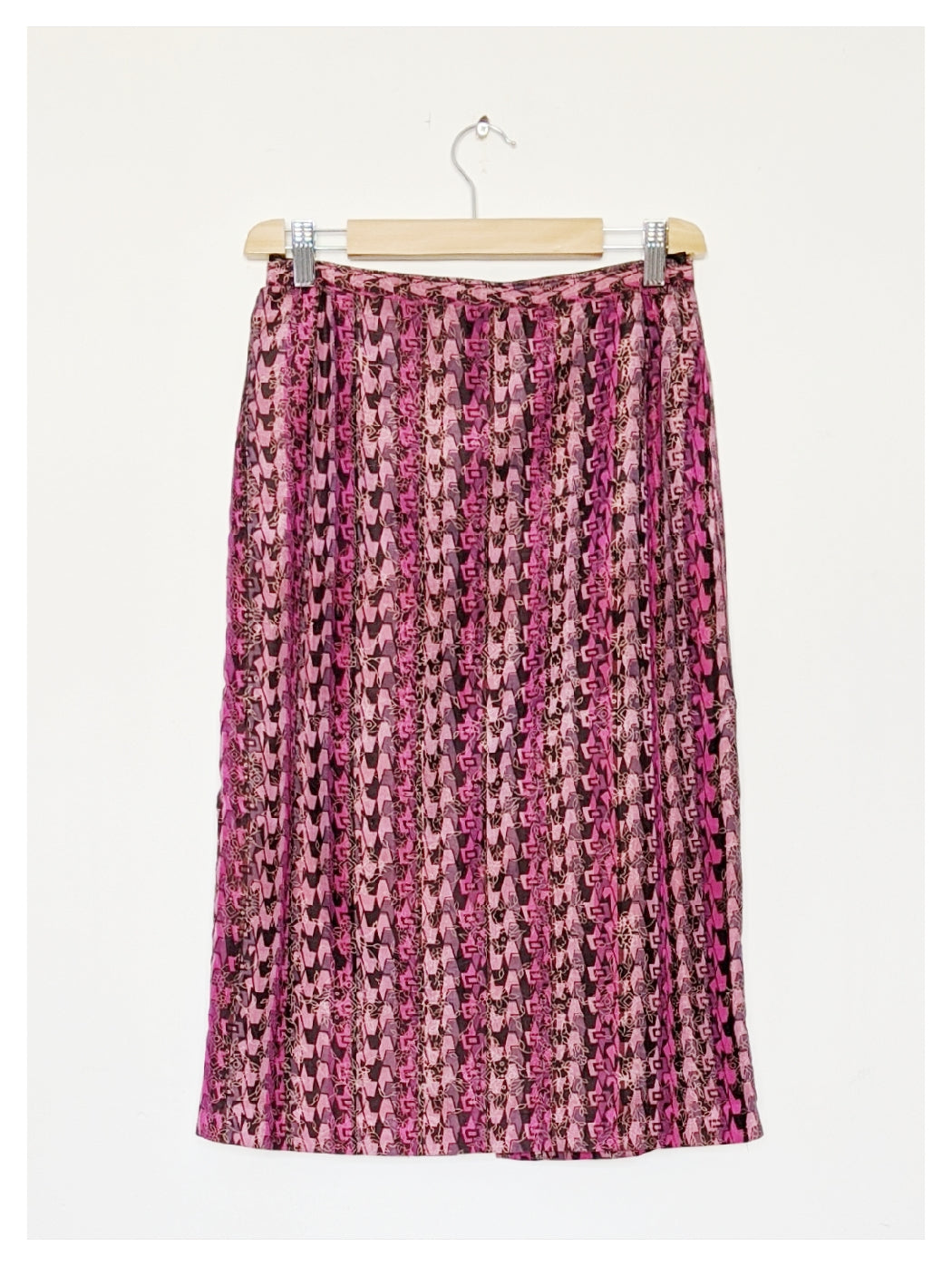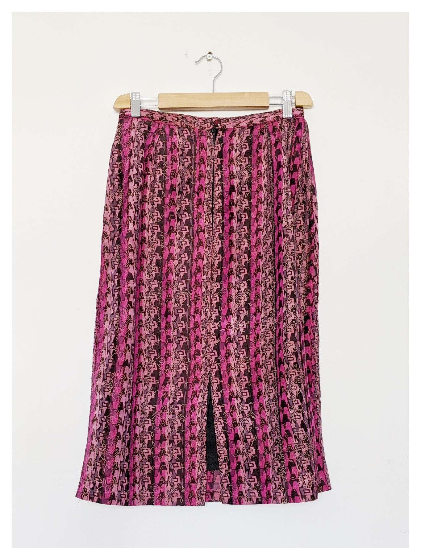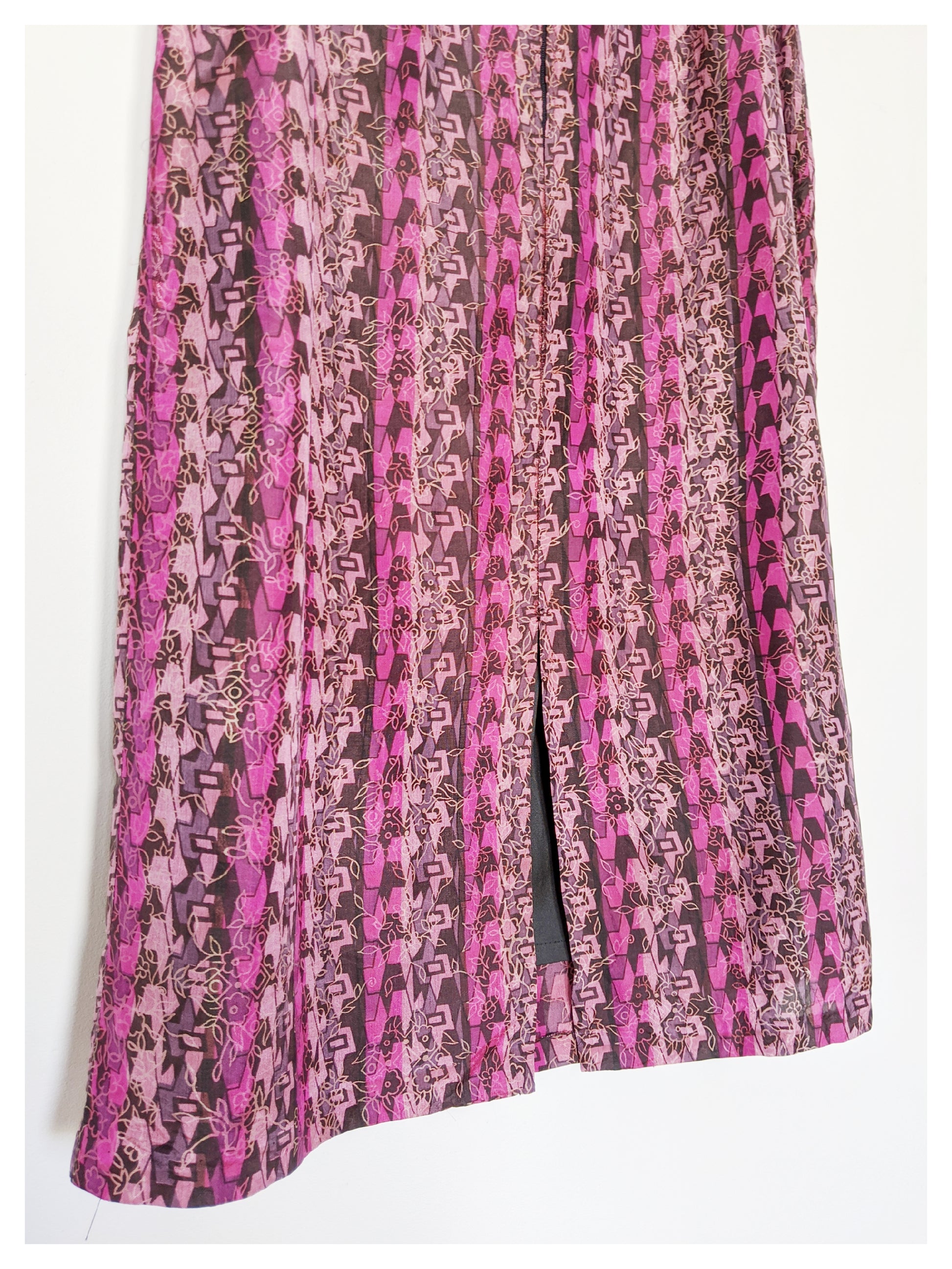 Jupe crayon légère, à motifs géométriques et floral, dans les tons rose et mauve. Coupe taille haute, avec une fermeture éclair boutonnée au dos. Entièrement doublée et fendue au dos.