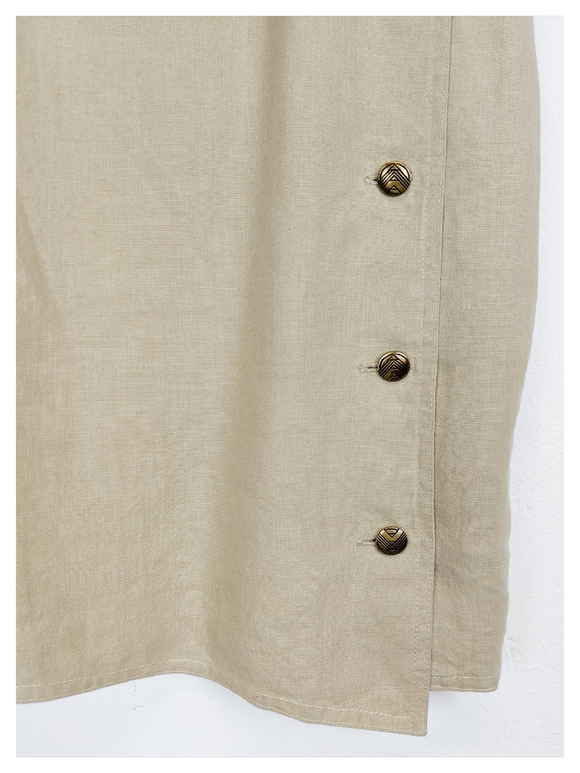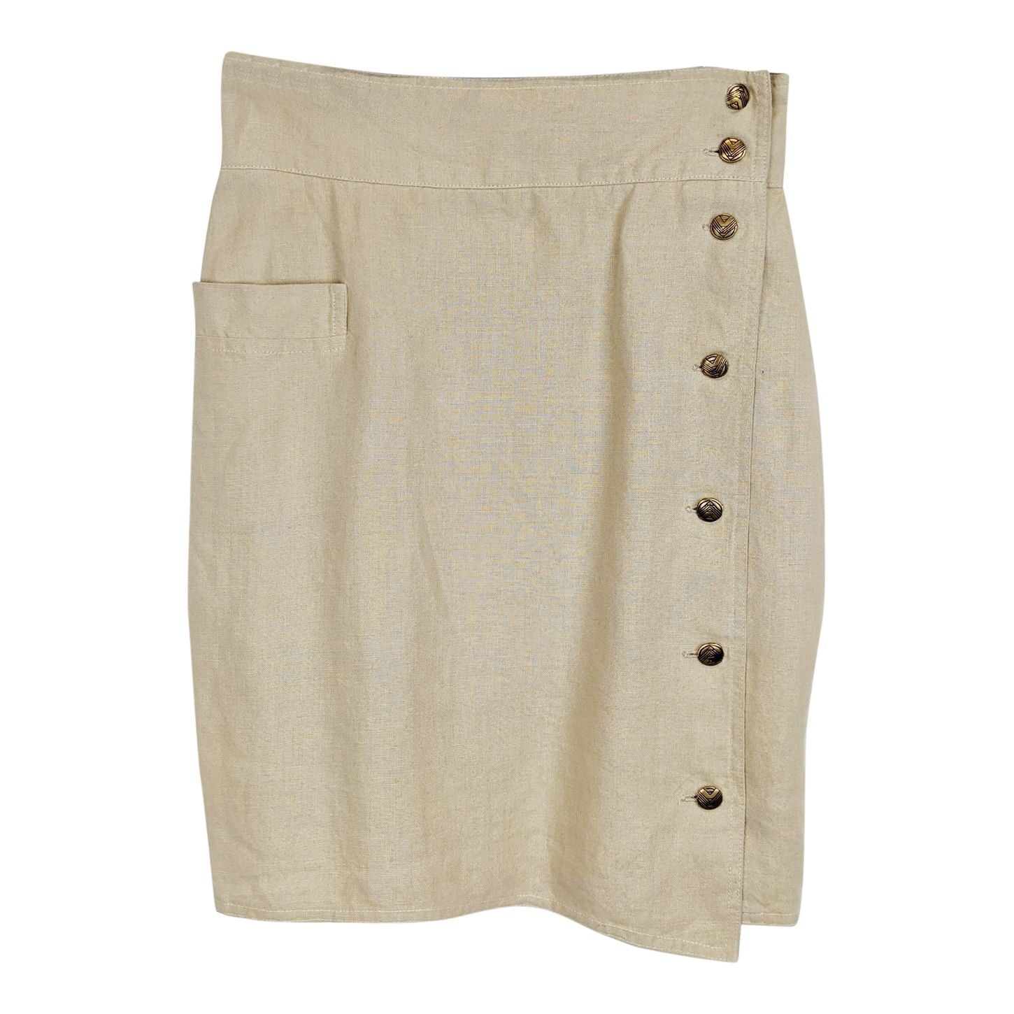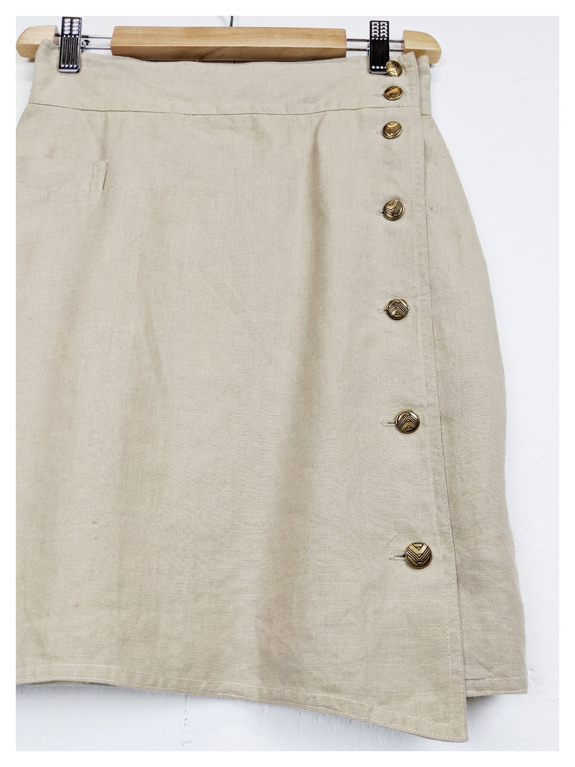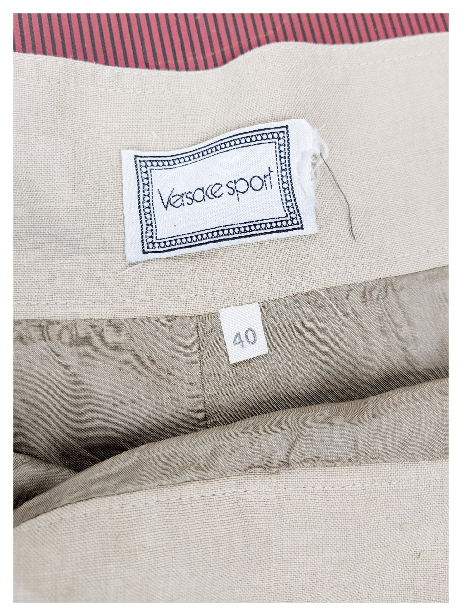 Très belle jupe de la marque Versace Sport. Coupe fuseau, avec taille haute, de couleur sable (comme du lin naturel). Empiècement à la taille. Jupe à rabat, terminée en pointe et boutonnée sur le côté avec 7 beaux boutons bronze estampillés de l'initial de la marque. Une poche passepoilée de l'autre côté. Entièrement doublée.