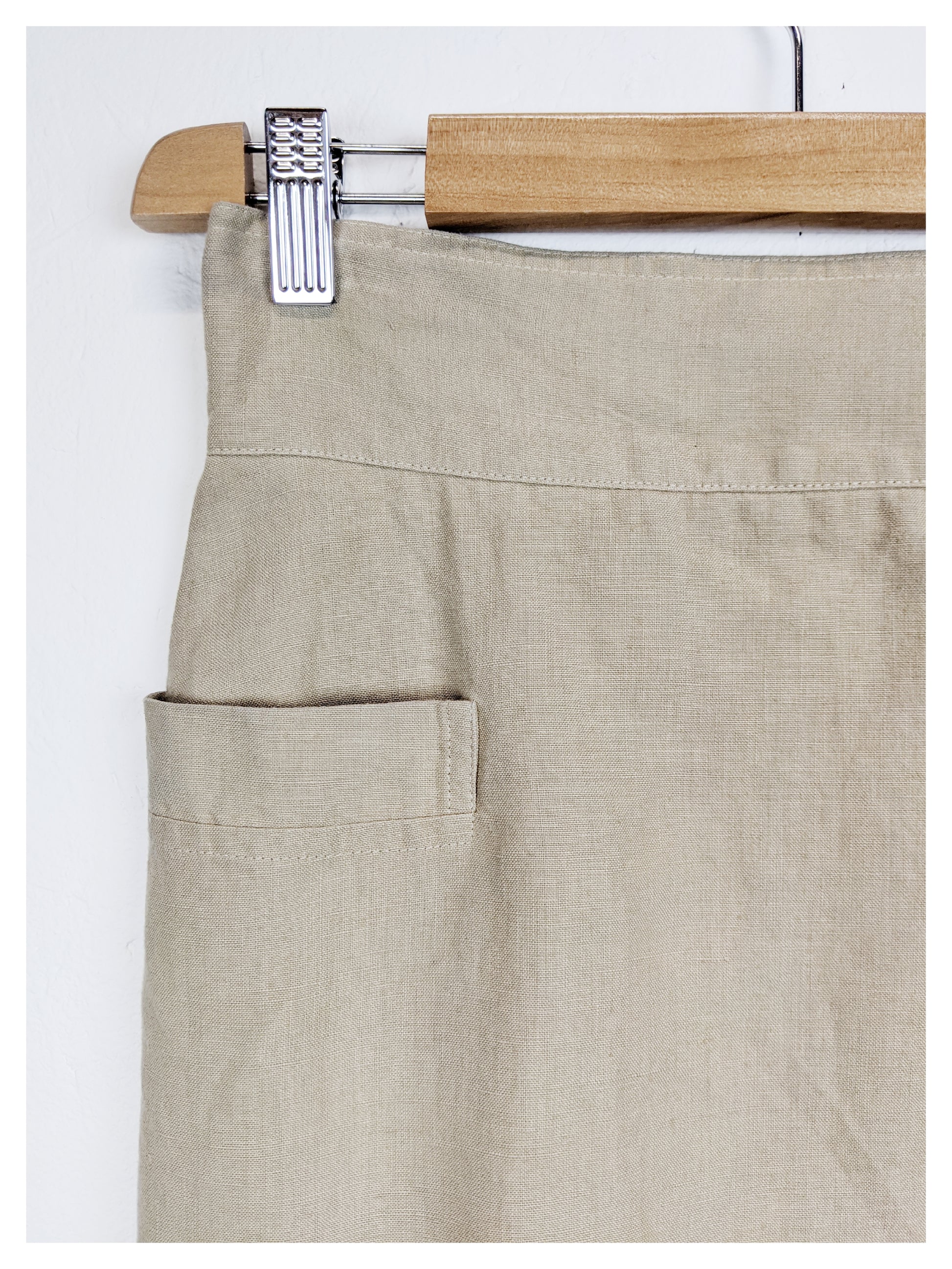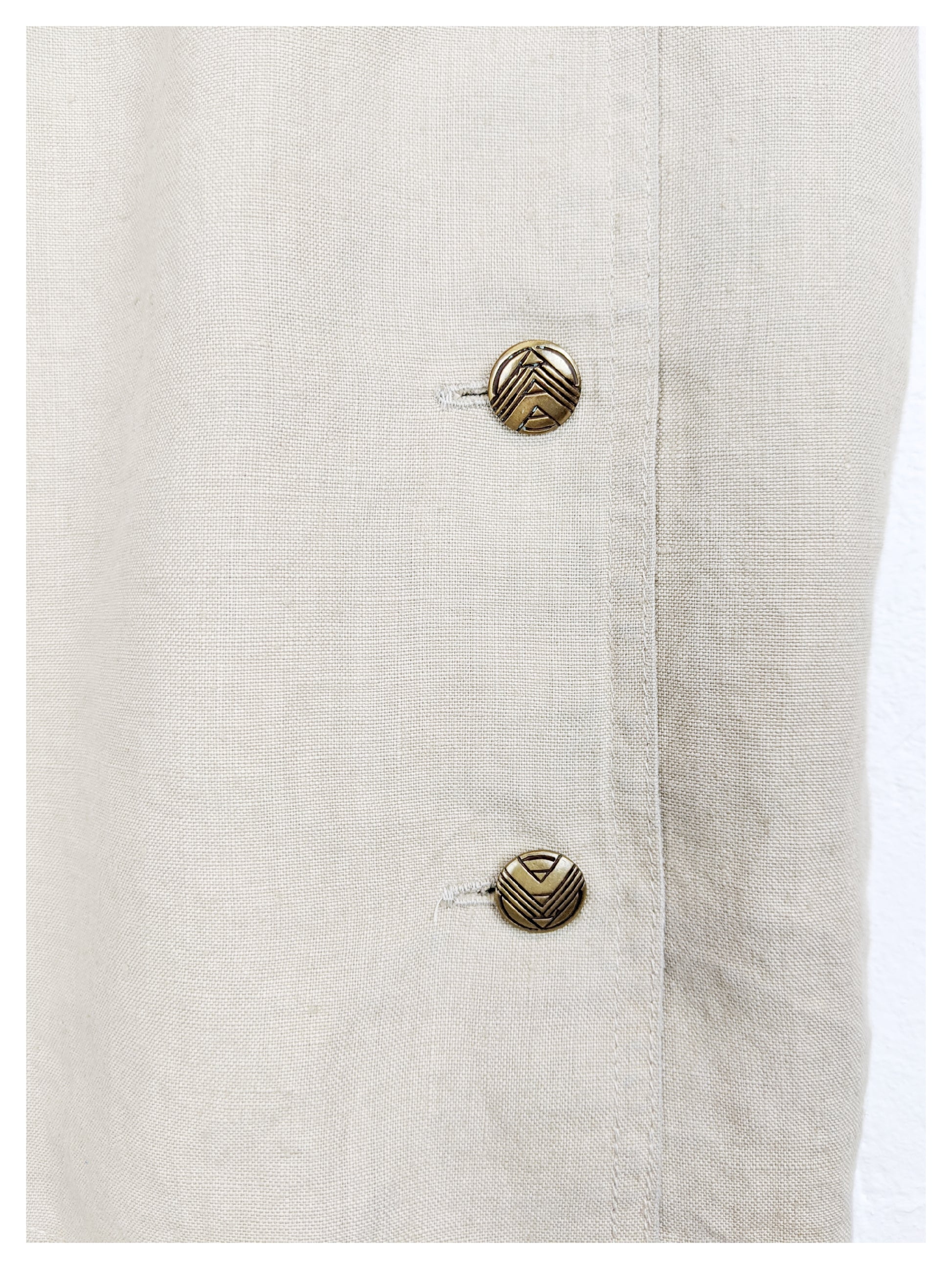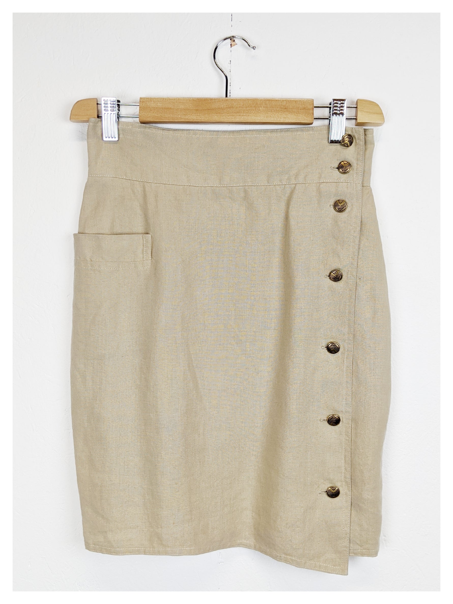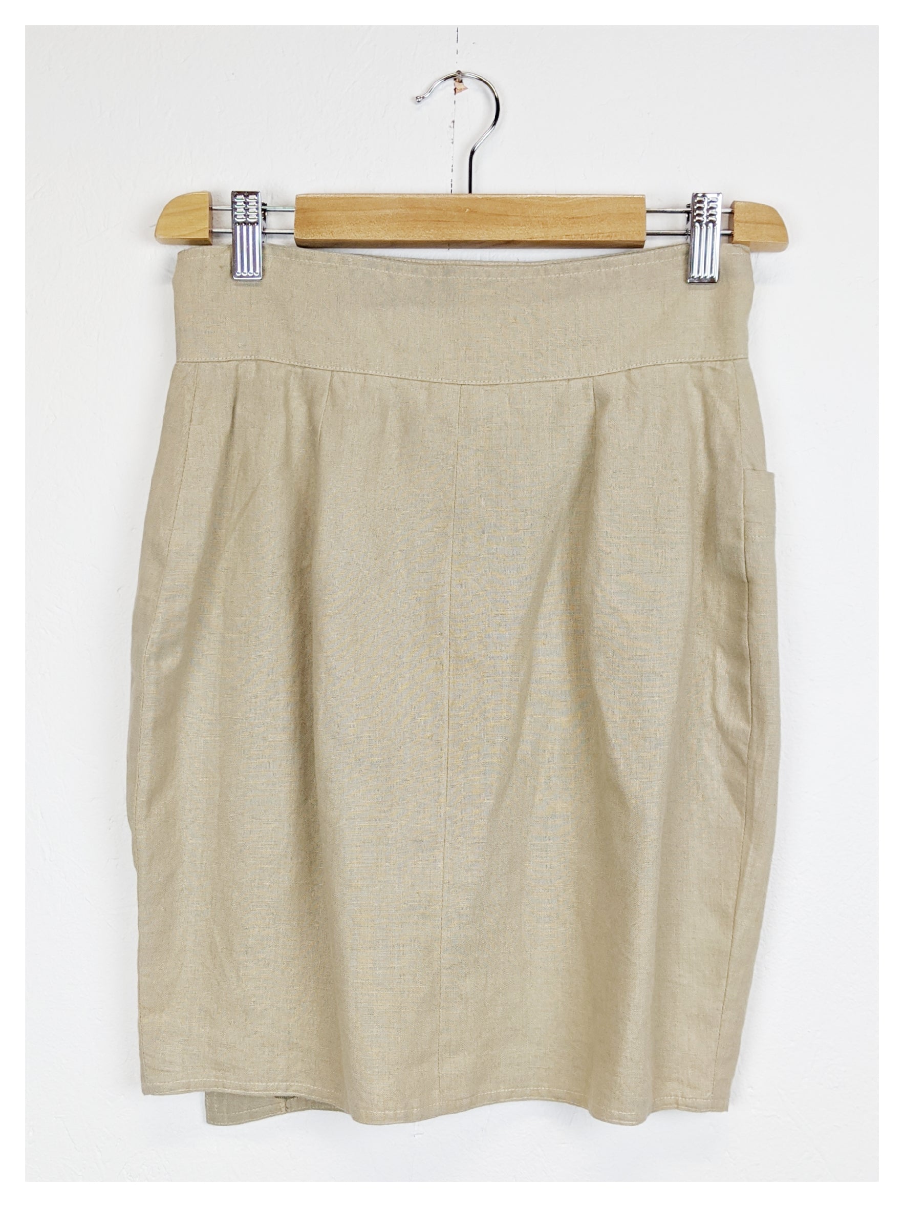 Très belle jupe de la marque Versace Sport. Coupe fuseau, avec taille haute, de couleur sable (comme du lin naturel). Empiècement à la taille. Jupe à rabat, terminée en pointe et boutonnée sur le côté avec 7 beaux boutons bronze estampillés de l'initial de la marque. Une poche passepoilée de l'autre côté. Entièrement doublée.