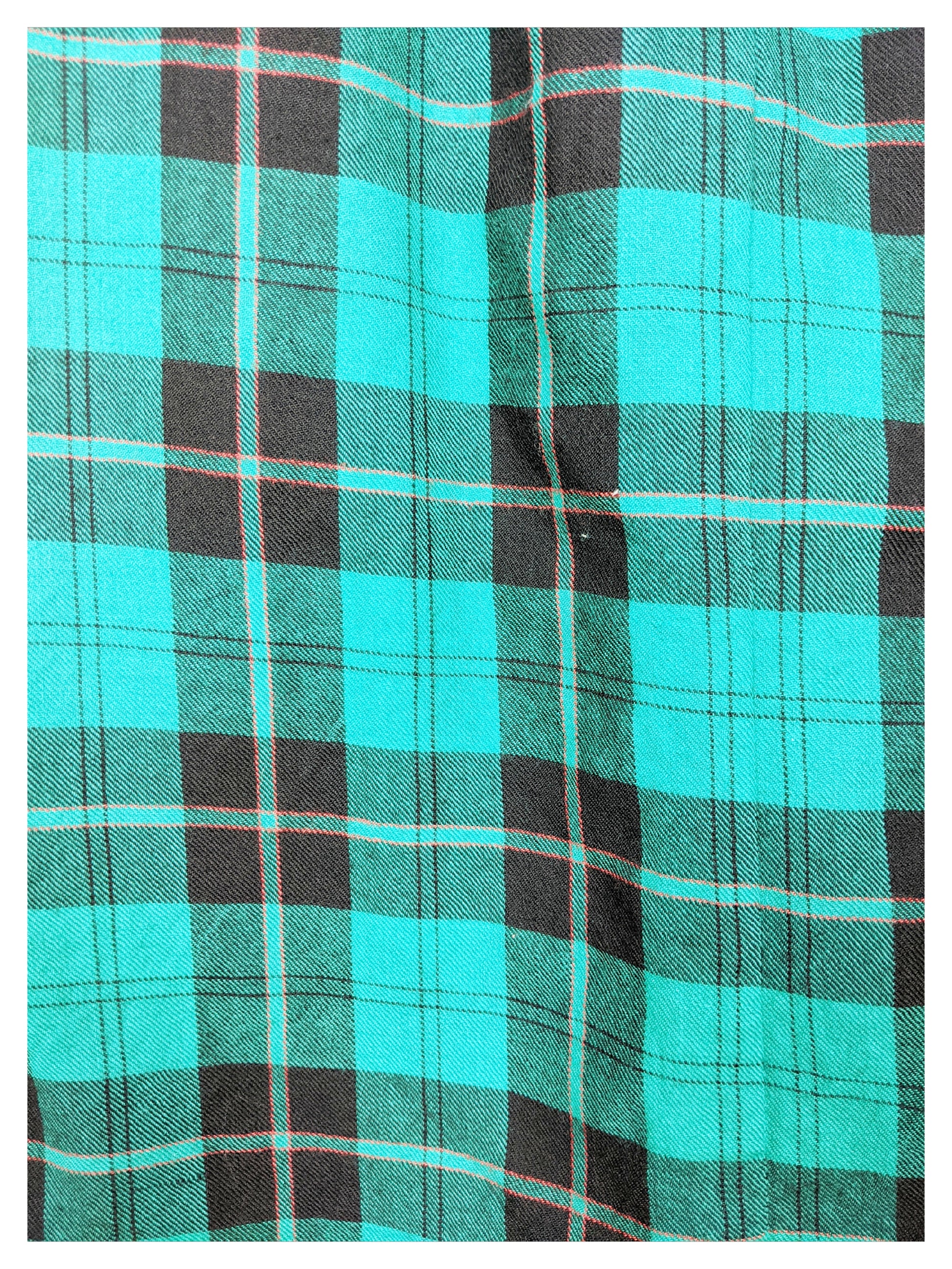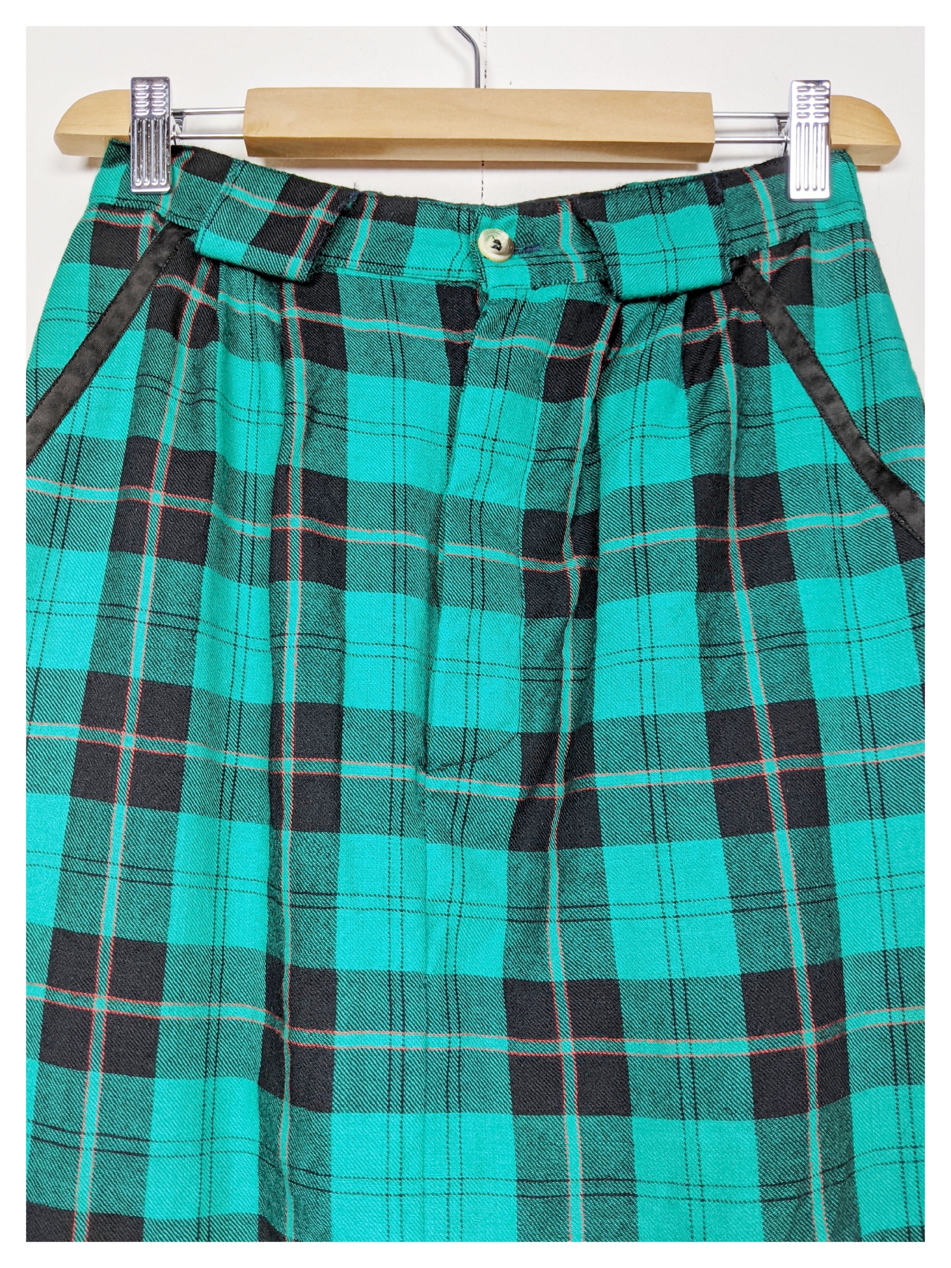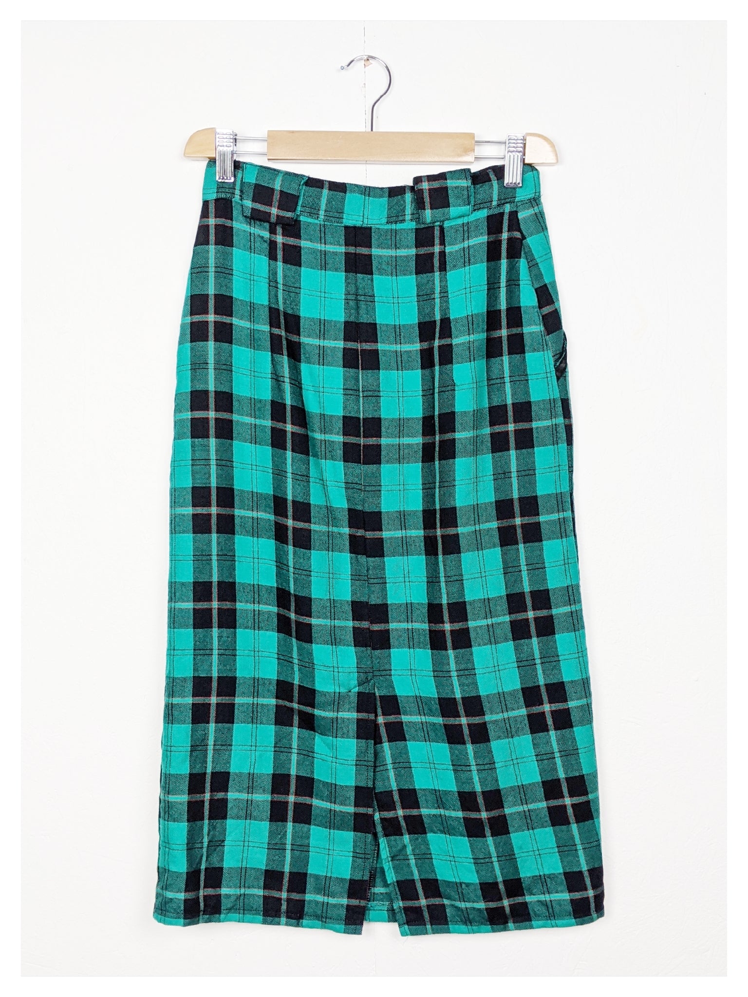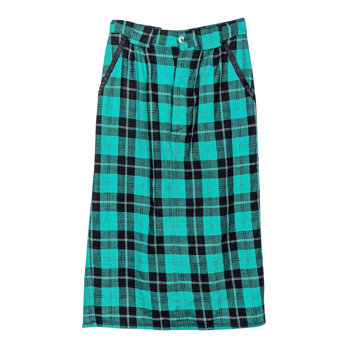 Très belle jupe à carreaux dans les tons vert turquoise, rouge et noir. De nombreux détails : Ceinturé à la taille avec quatre passants, boutonné sur le devant avec rabat (au lieu du fermeture éclaire). Deux poches de chaque côté au niveau de la taille. Plis plats sur le devant. Coupe fuseau, longueur midi. Doublée. Fendue à l'arrière.