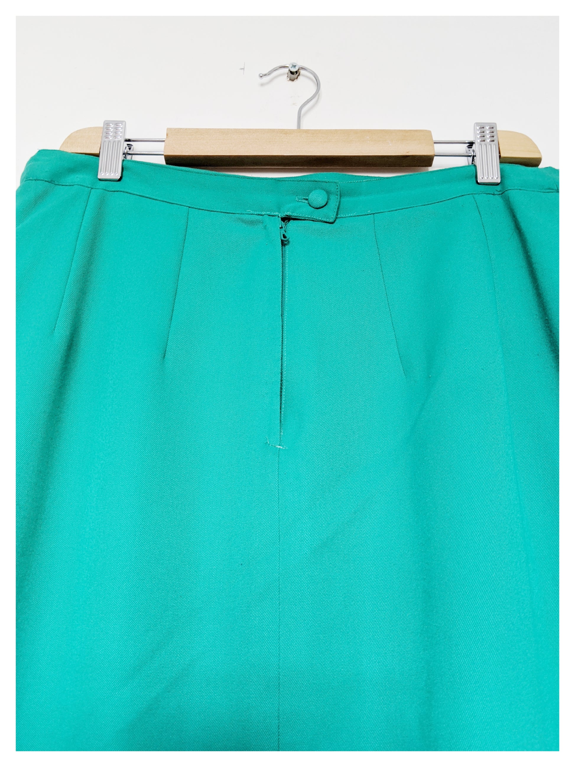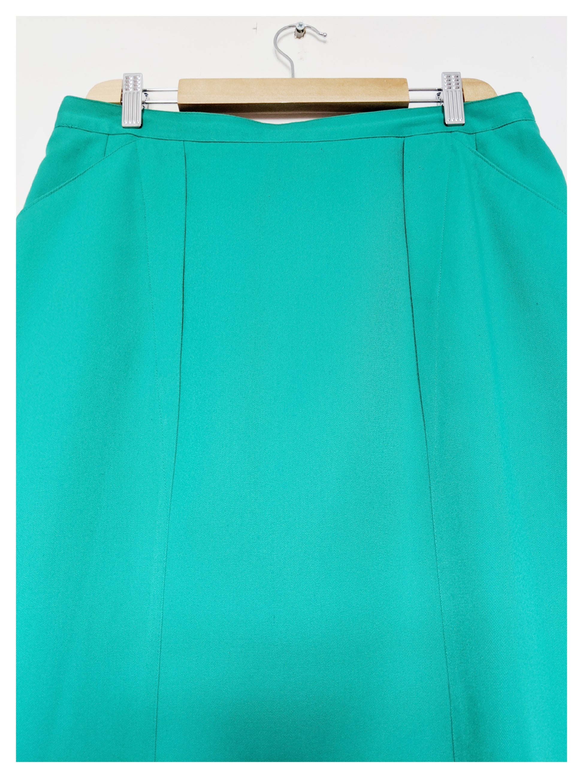 Jupe coupe fuseau de couleur verte. Deux pinces avec jolis plis géométriques. Deux poches italiennes de chaque côté. Fermeture éclair au dos avec un bouton (dans le même tissu que la jupe). Fendue à l'arrière. Entièrement doublée.