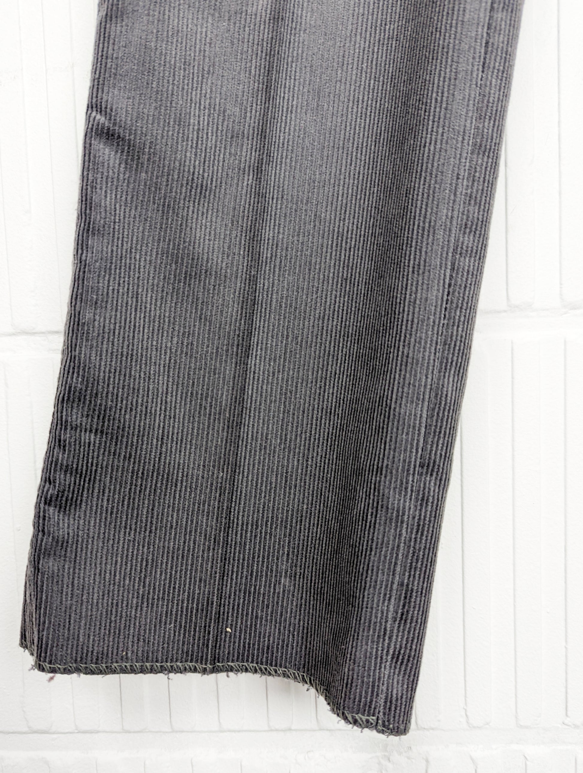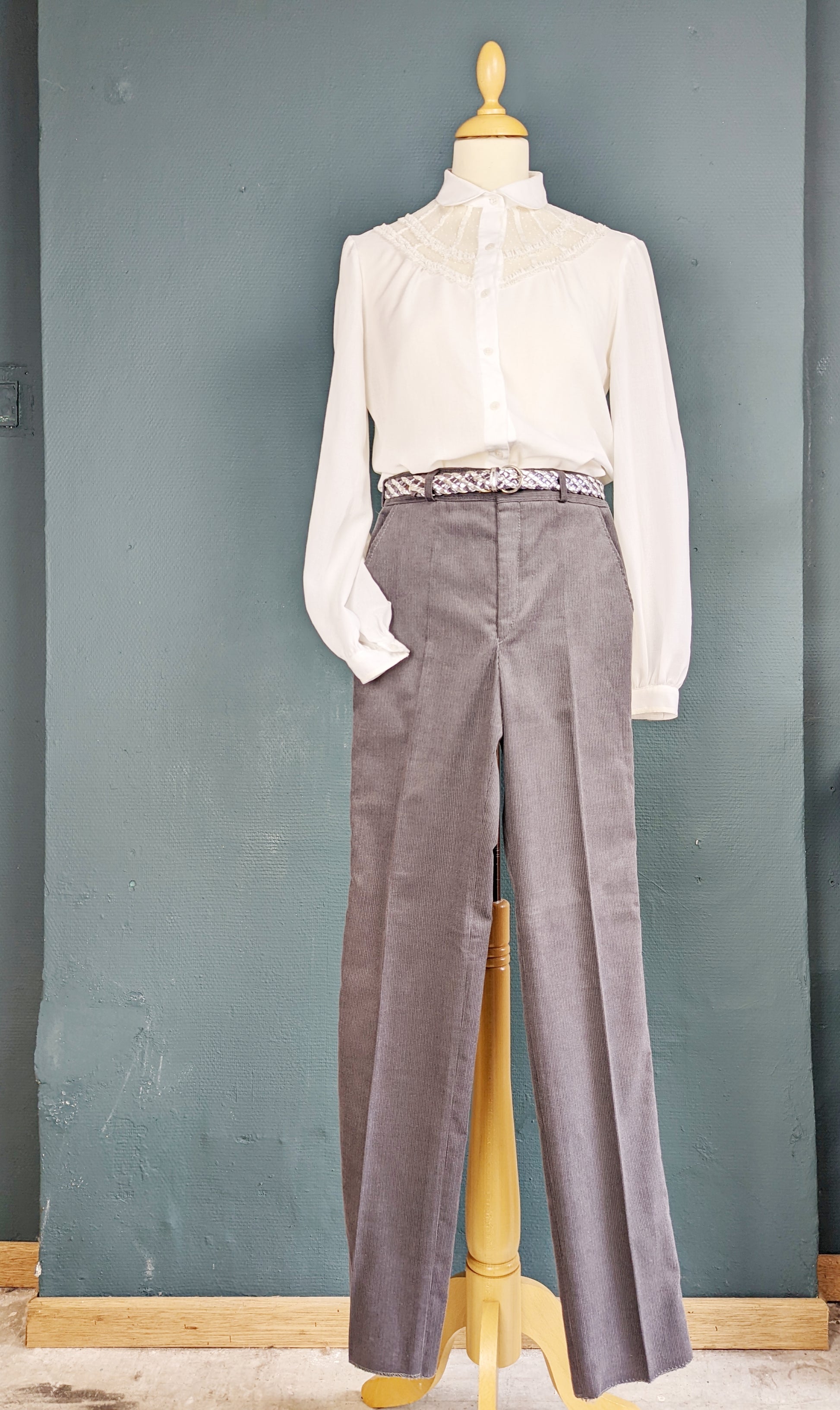 Pantalon droit en velours de couleur grise. Ceinturé à la taille avec 2 passants sur le devant, 2 sur le côté et deux dans le dos. Deus poches italiennes de chaque côté. Empiècement au niveau du bassin. Coupe droite. Fermeture éclaire avec agrafe sur le devant. Une vraie pépite pour un look 70s-80s !