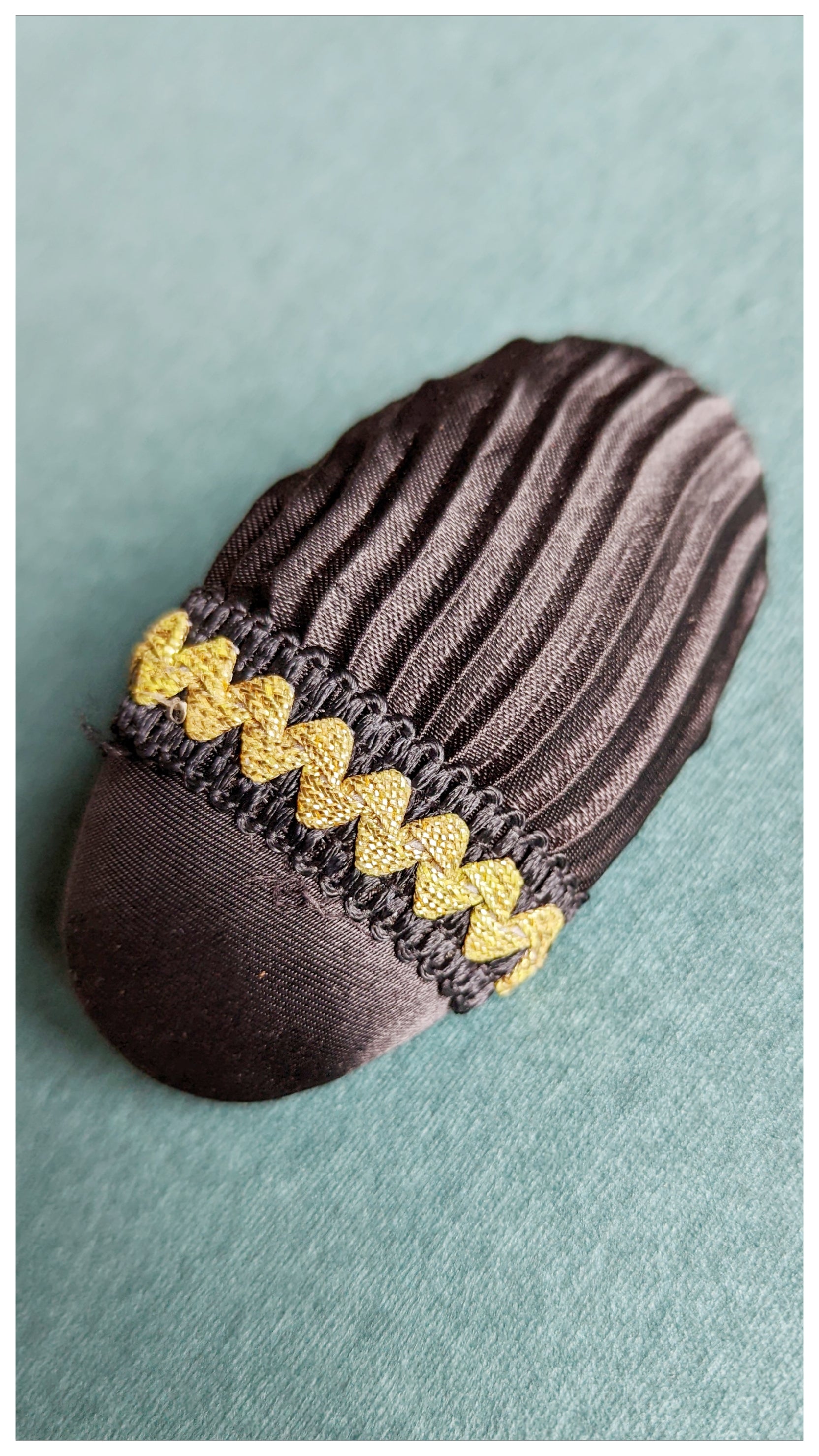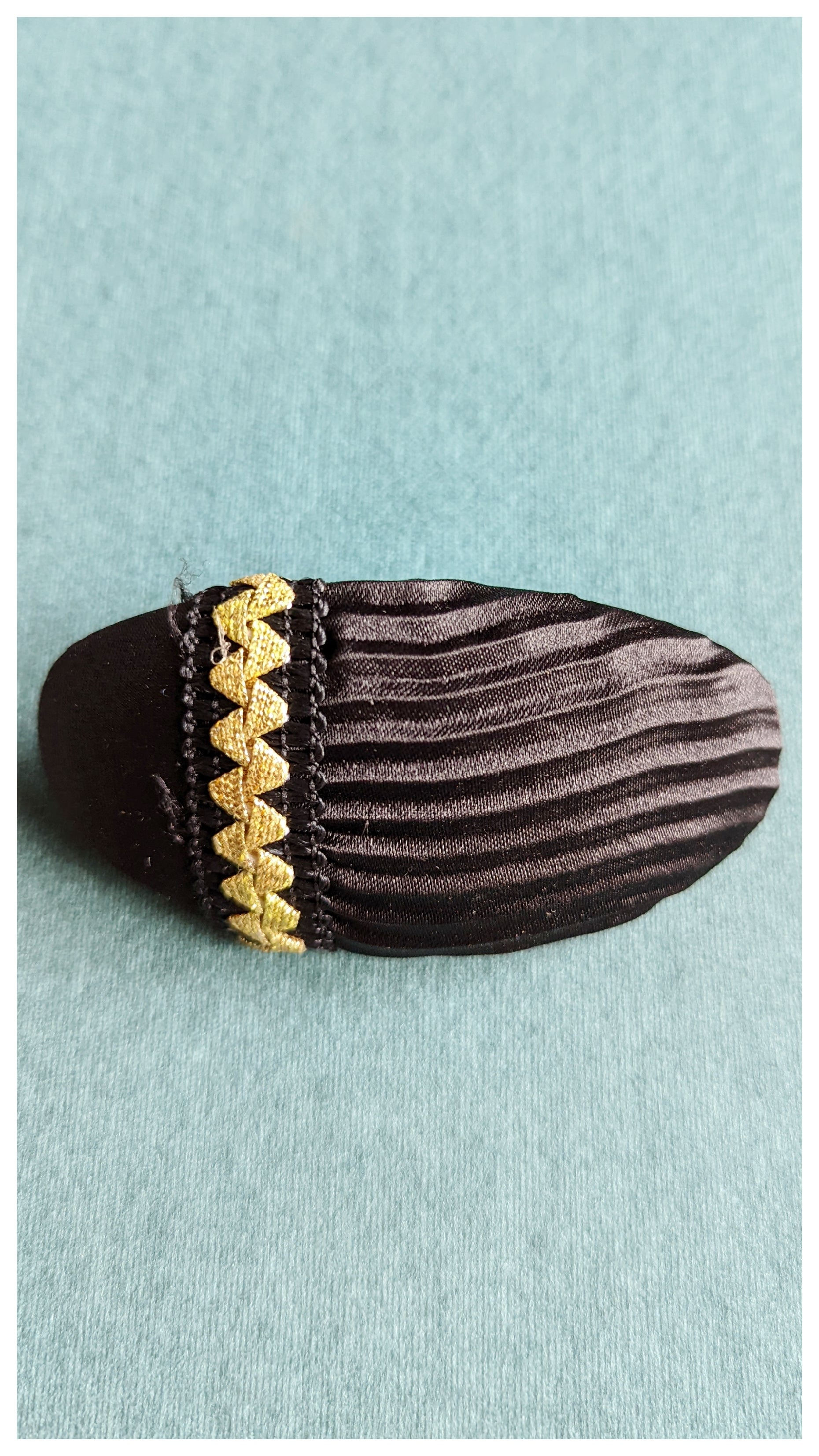 Grosse pince à cheveux en tissu noir et doré, de forme ovale. Pince métalique.