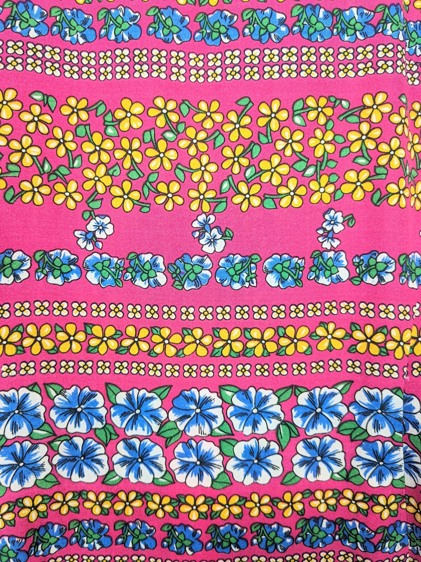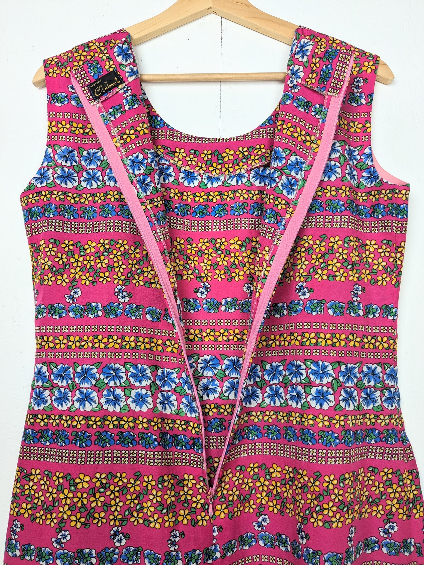 Superbe robe des années 60, dans un tissu fluide fuchsia avec des fleurs multicolore. Sans manche, avec encolure ronde. Pinces au niveau de la poitrine. Légèrement cintrée. "Jupe" trapèze avec deux plis plats sur le devant en dessous des hanches. Longeur genoux. Ceinture dans le même tissu pour marquer la taille. Fermture éclaire dans le dos.
