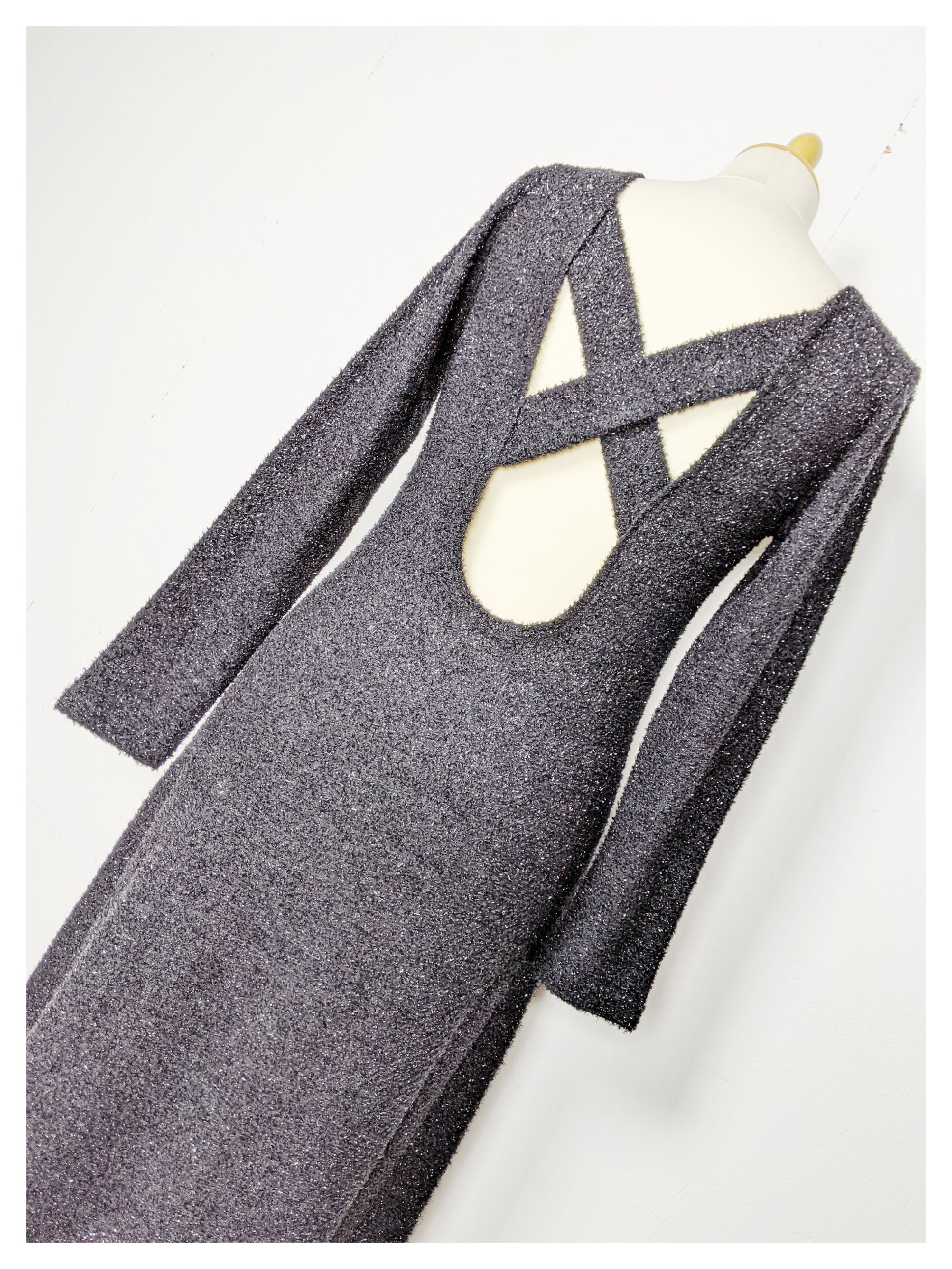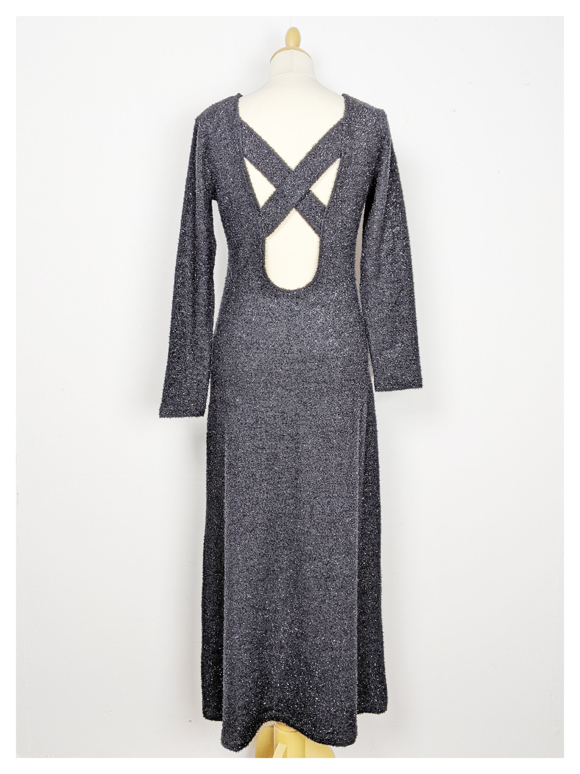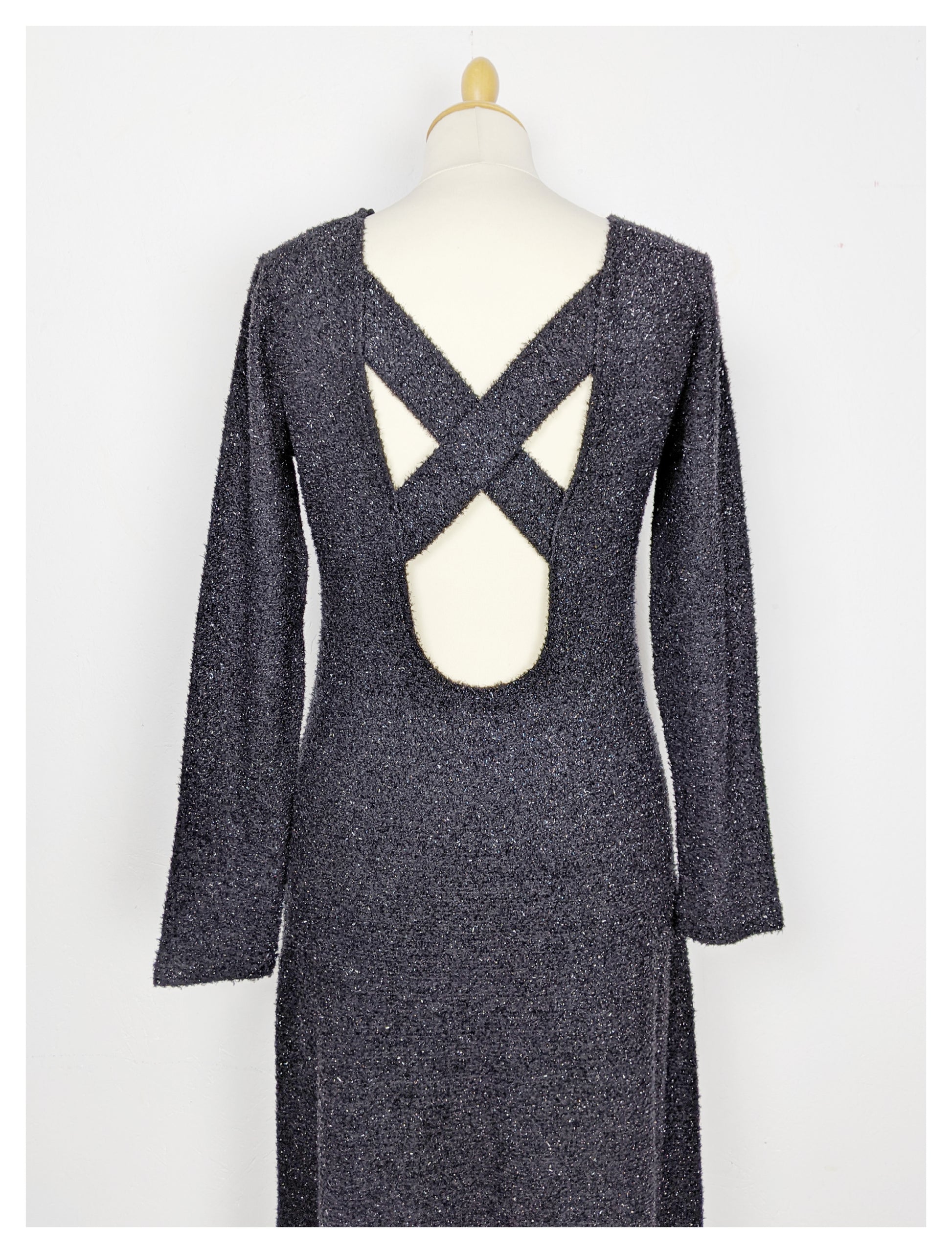 Magnifique robe de soirée noire, en tissu à "poils" courts brillants. Décolleté rond sur l'avant, cintrée, voire moulante mais la jupe est trapèze. Décolleté croisé dans le dos (topissime). Longueur midi, ou longue si on est plus petite. Assez épaisse et légèrement élasthanne. J'ai indiqué qu'elle datait des années 80's, mais elle pourrait être du début des années 90.